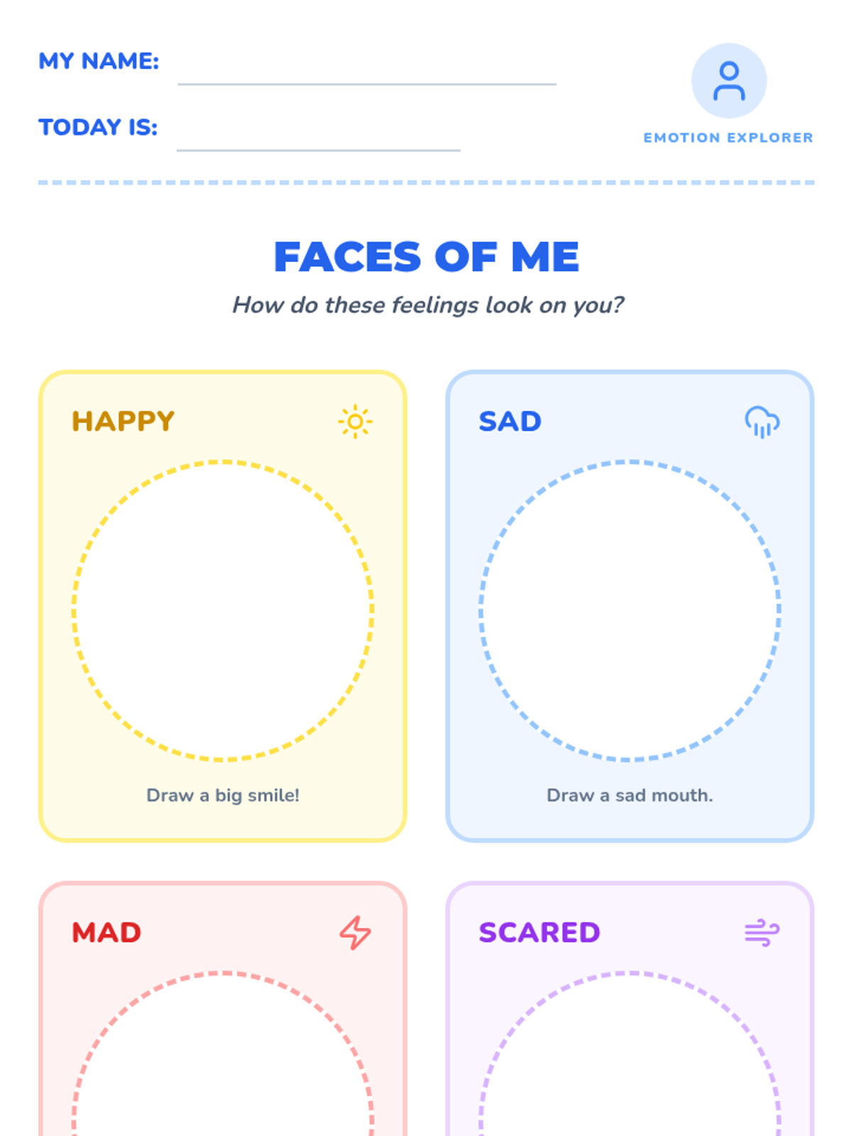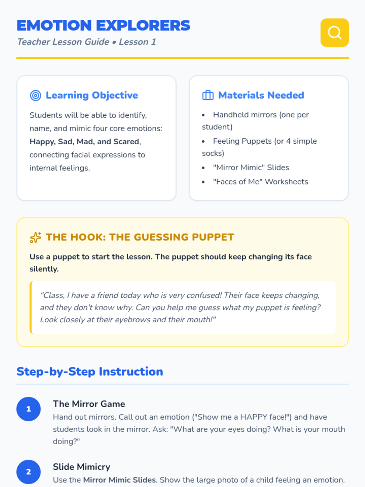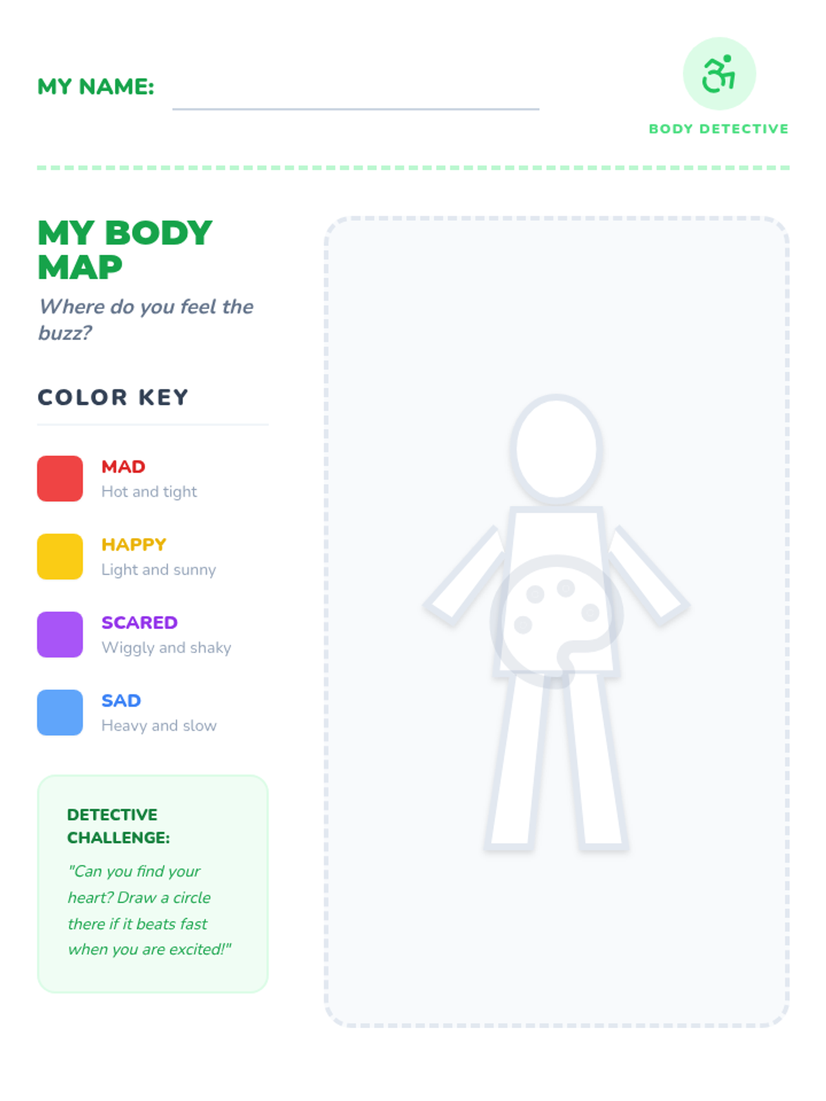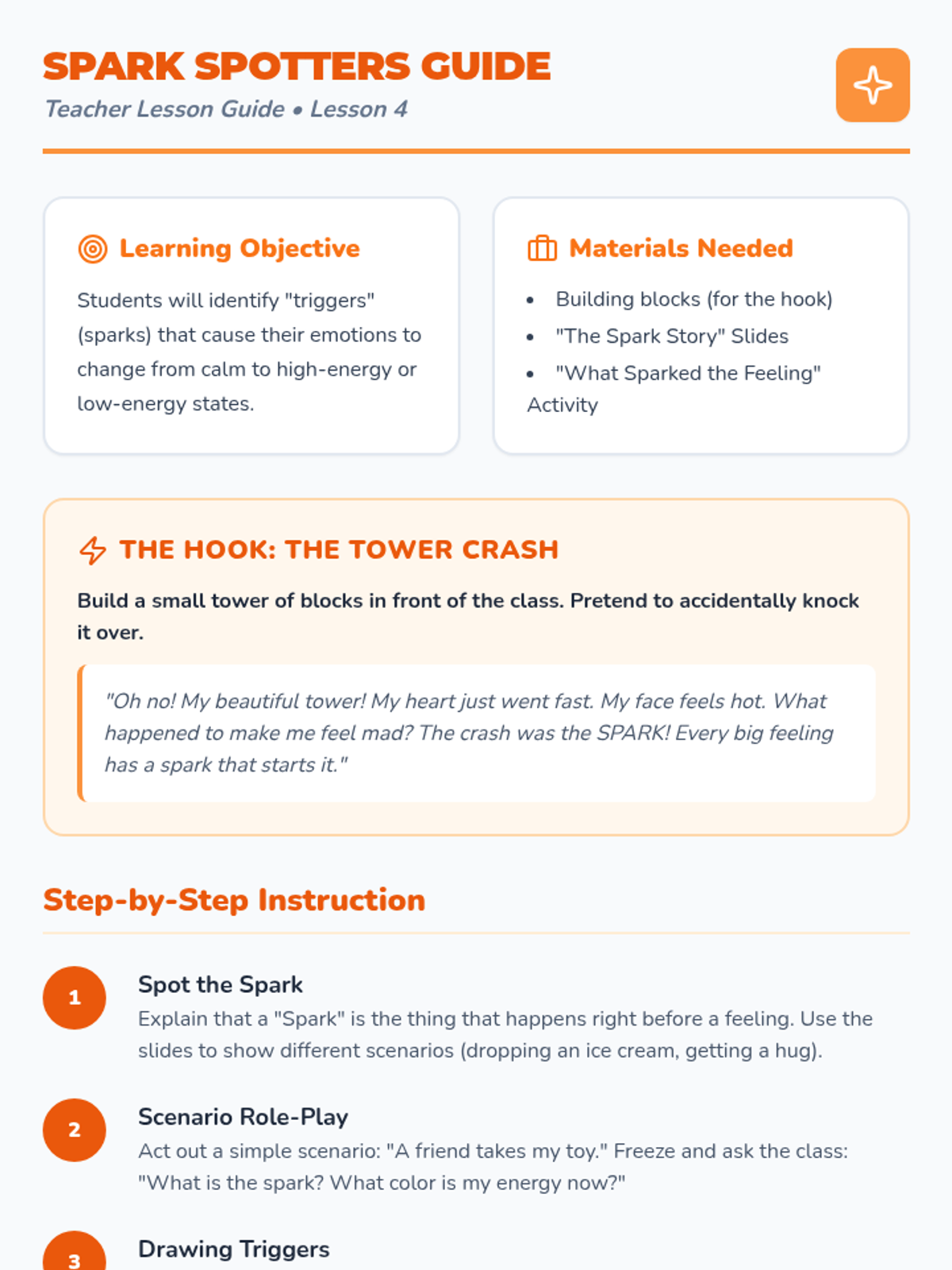 A foundational sequence for Pre-K students to identify basic emotions, recognize physical body signals (interoception), and associate feelings with a color-coded energy system to improve self-regulation.