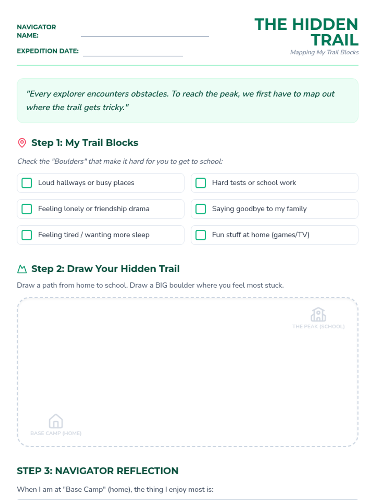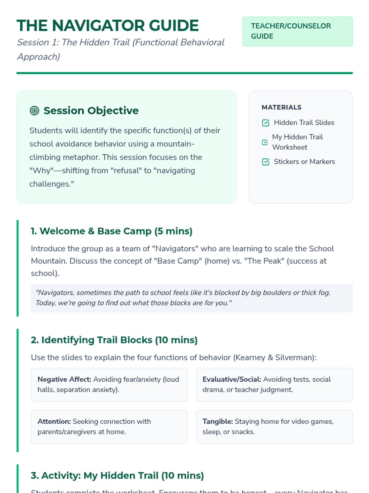 A 4-session small-group counseling program for grades 3-5 focused on identifying functional triggers for school avoidance, building coping strategies, and preparing for a successful fall transition. The program utilizes a mountain-climbing theme to empower students as 'navigators' of their own school journey.