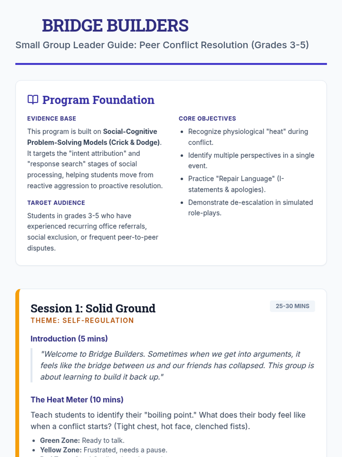 A 4-session small-group counseling program for grades 3-5 focusing on self-regulation, perspective-taking, and repair language for students with recurring social challenges.