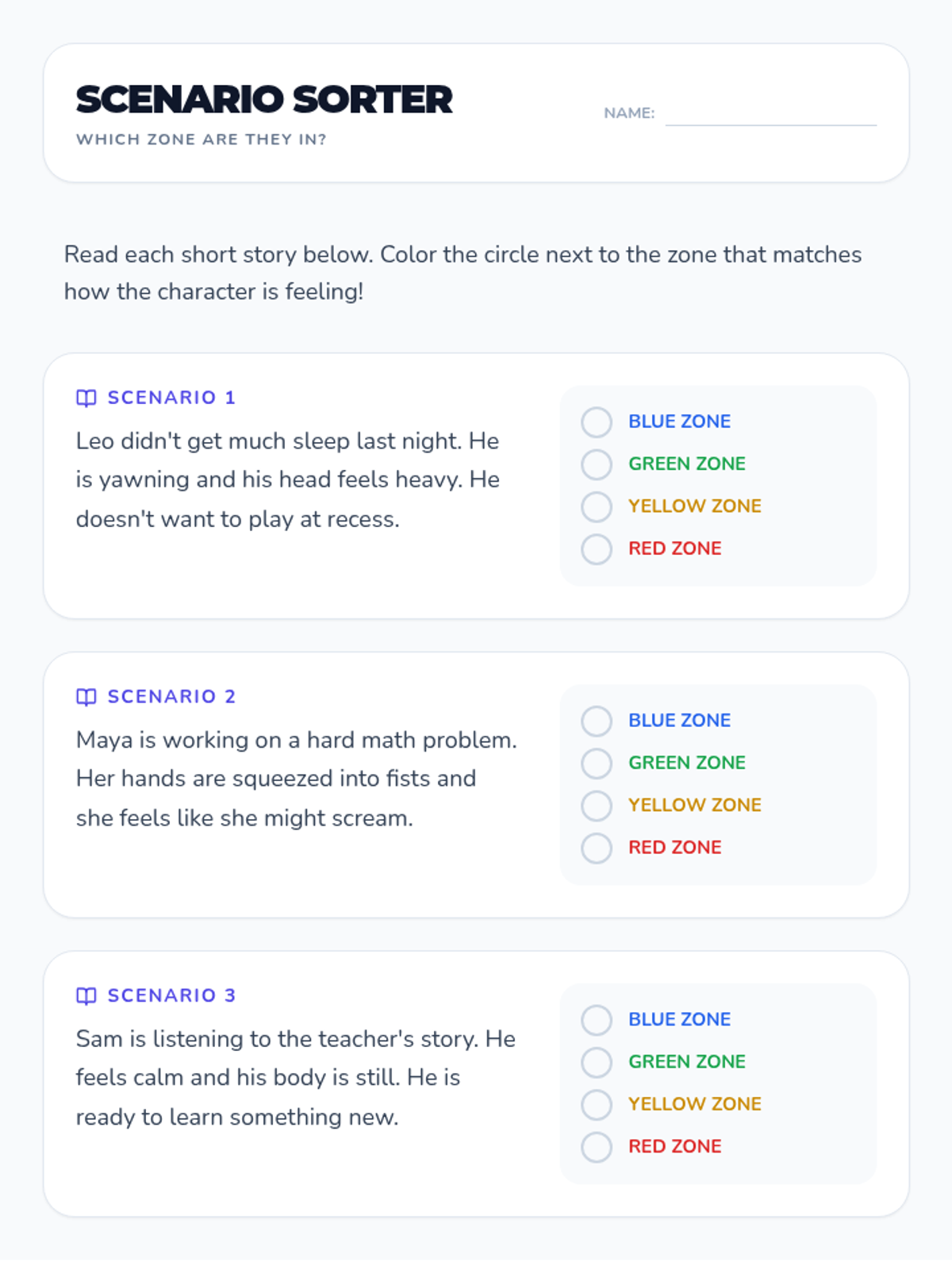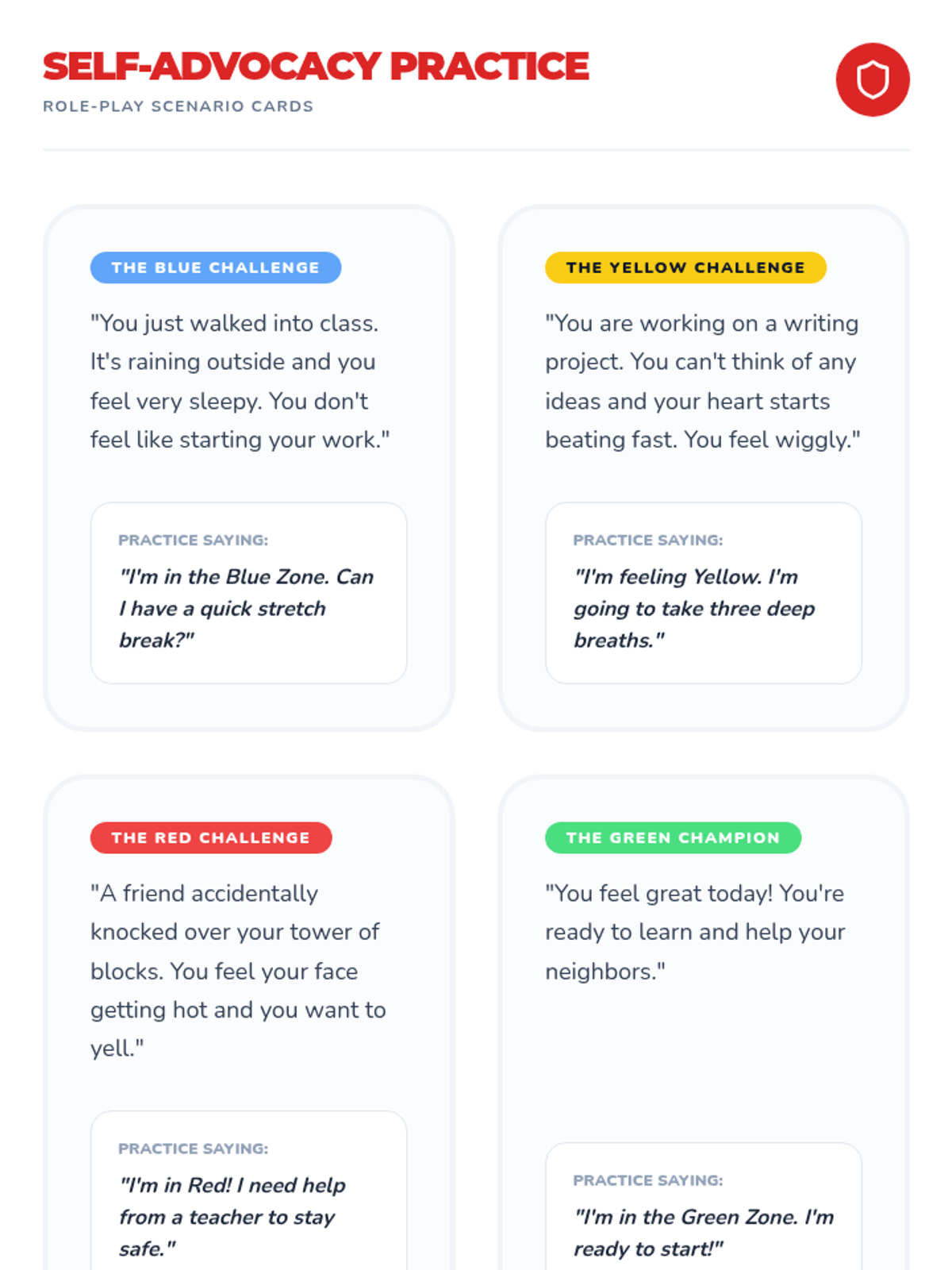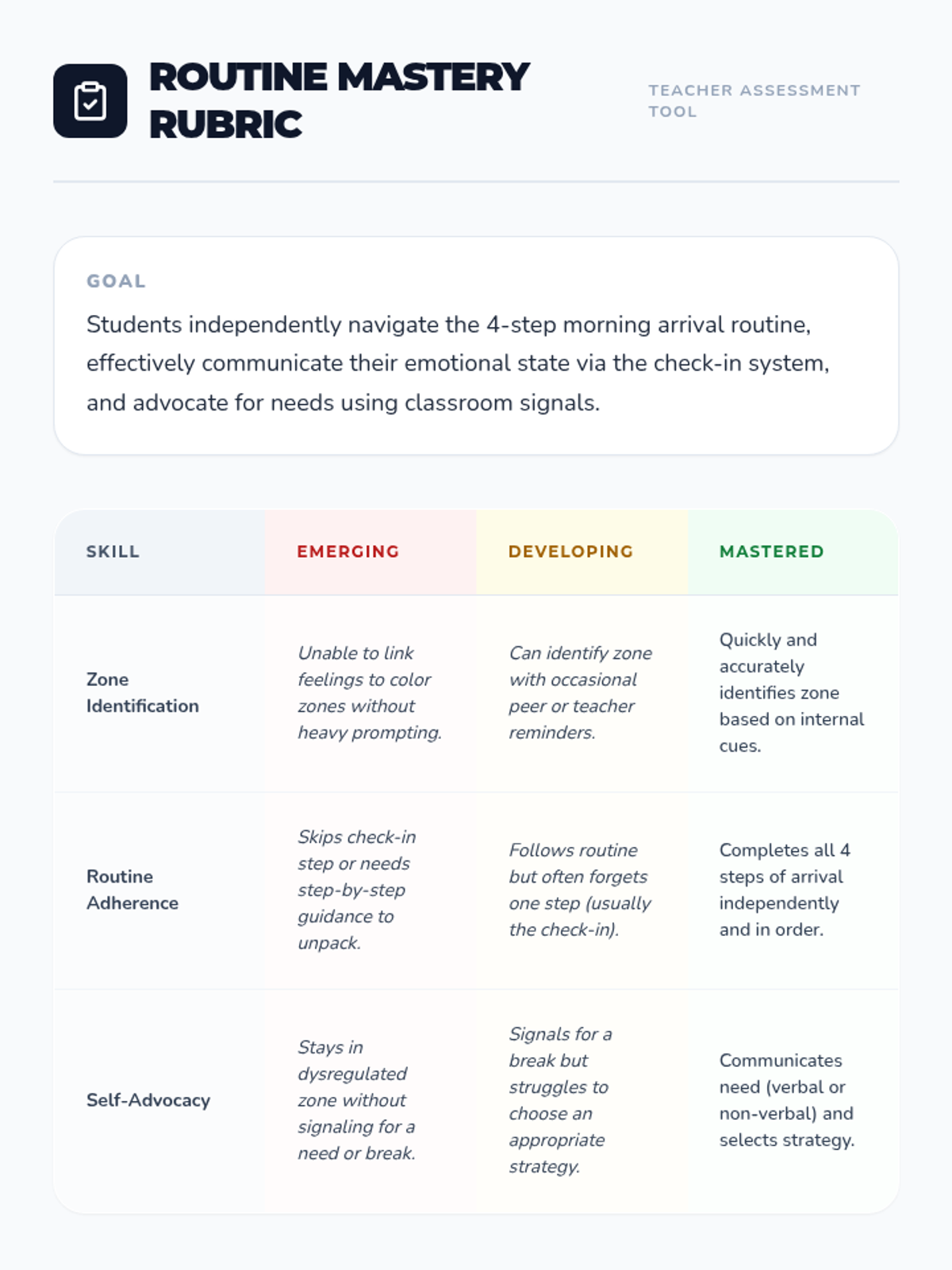 This sequence teaches 2nd-grade students to identify and communicate their emotional states using an expanded vocabulary and physical awareness. Students learn to use a color-coded check-in scale to advocate for their needs and integrate these skills into a daily morning routine.
