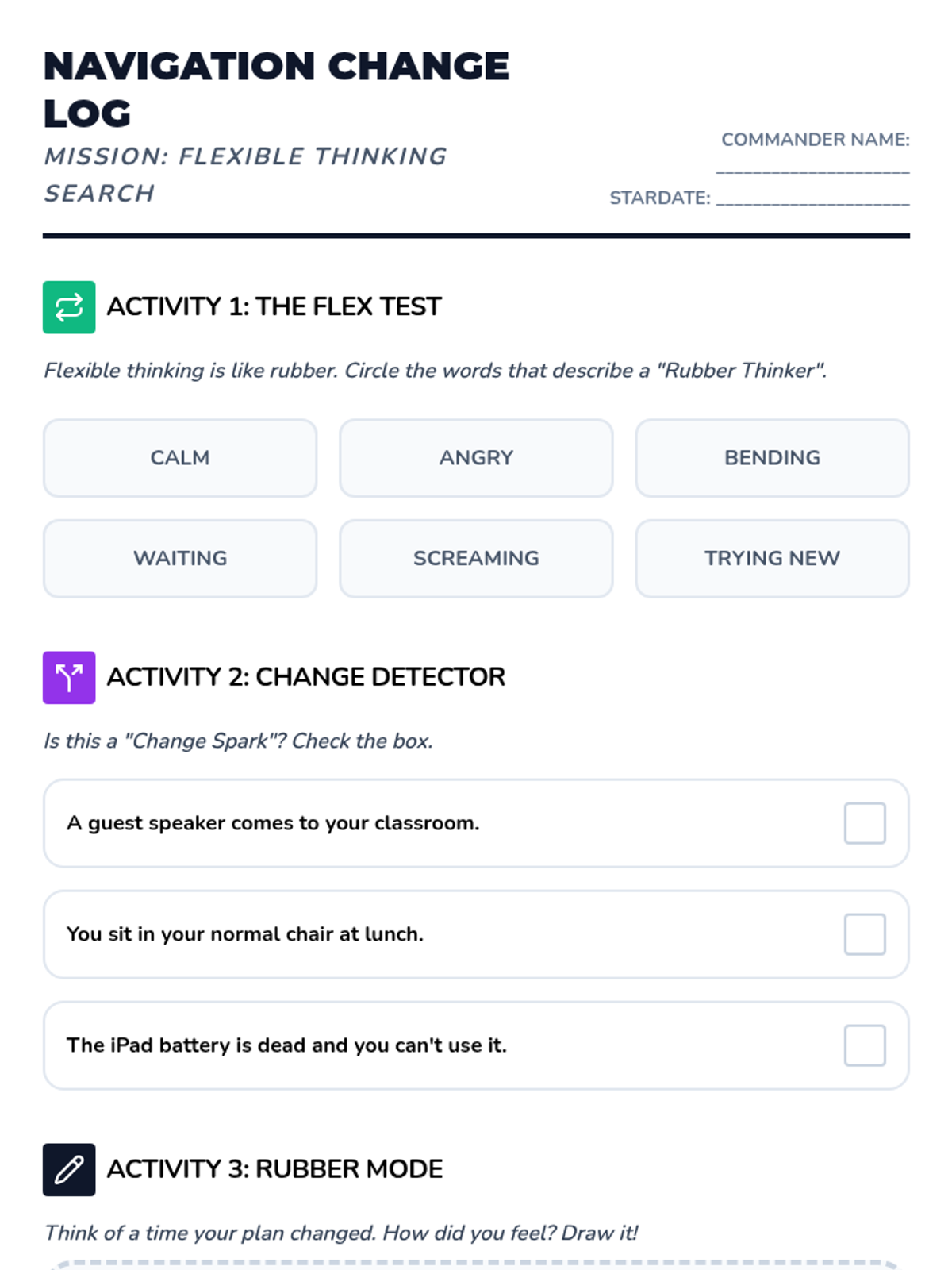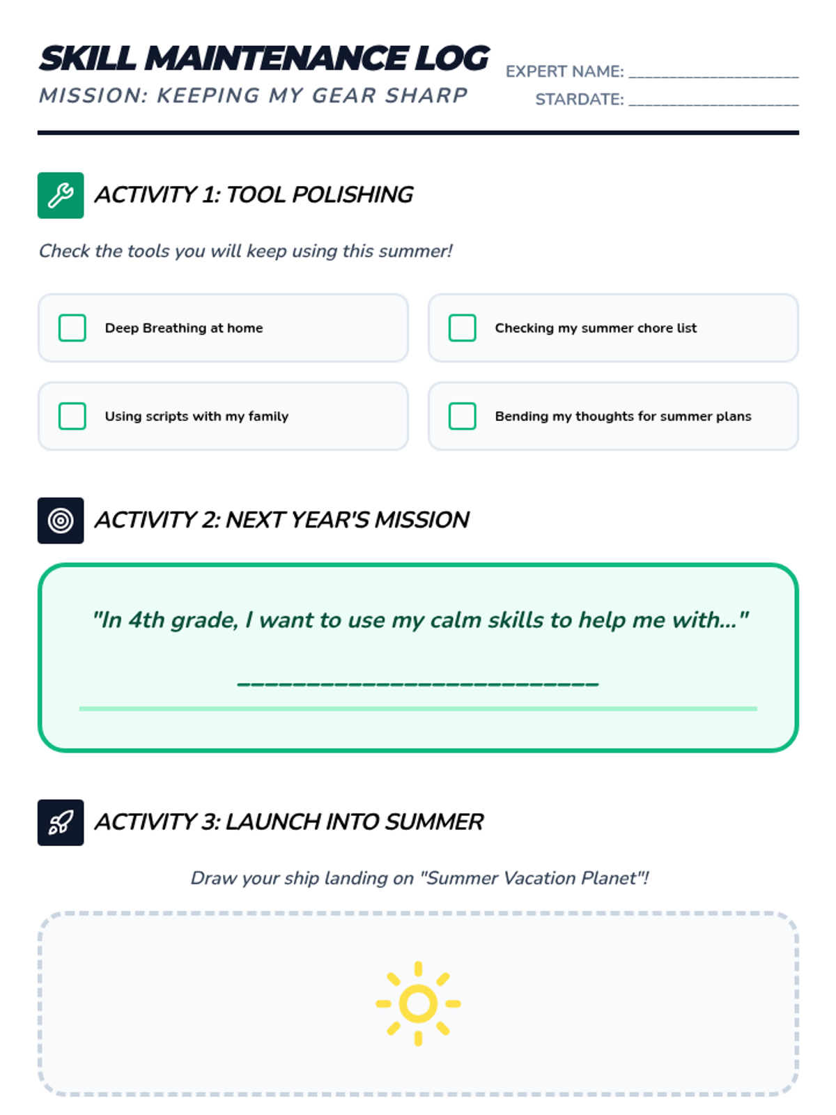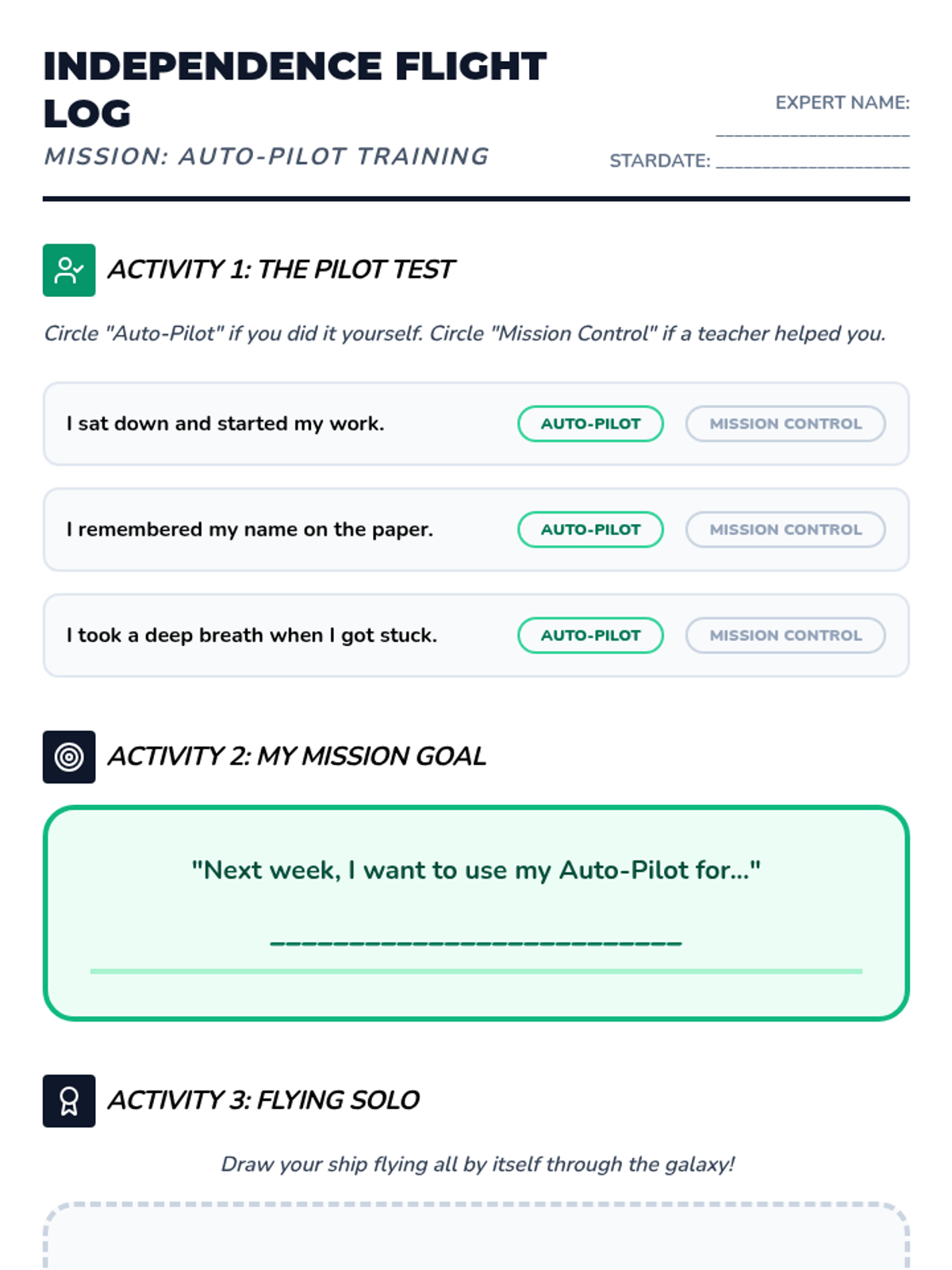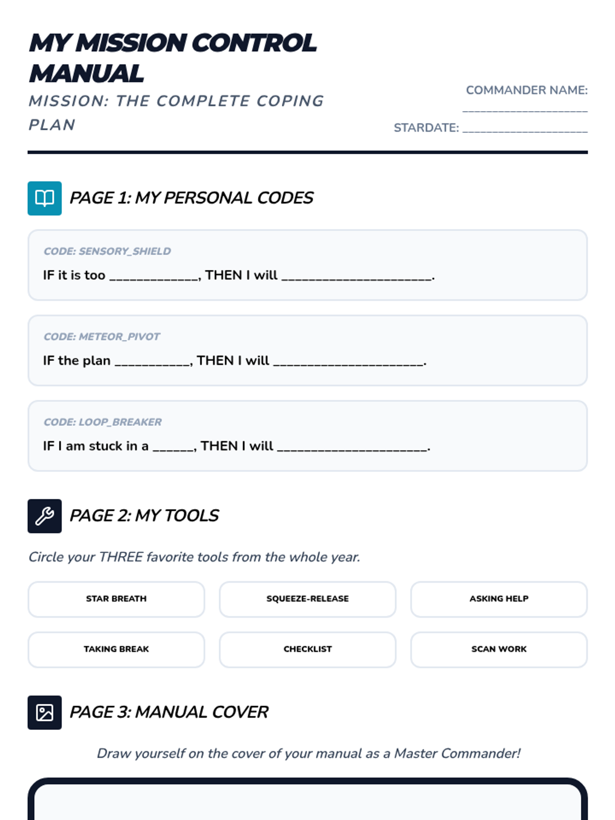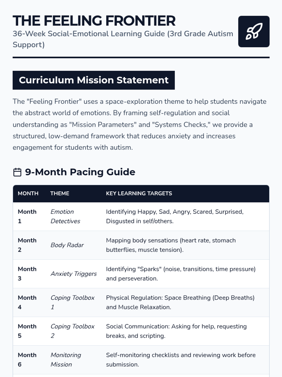 A 36-week social-emotional learning curriculum for a 3rd-grade student with autism, focusing on emotion identification, anxiety management, coping strategies, and flexible thinking. The program uses a 'Feeling Frontier' space-exploration theme to make abstract concepts concrete and engaging.
