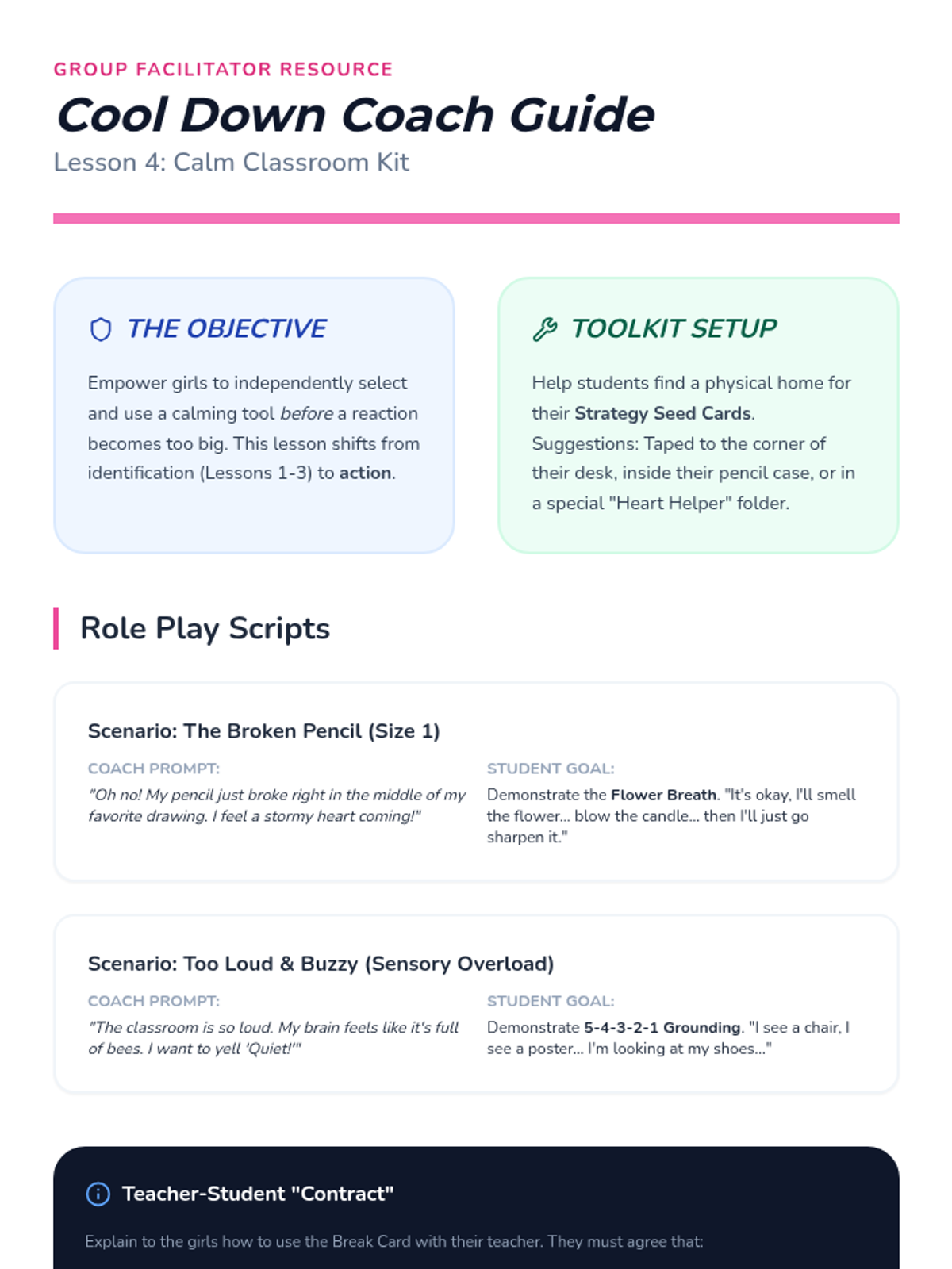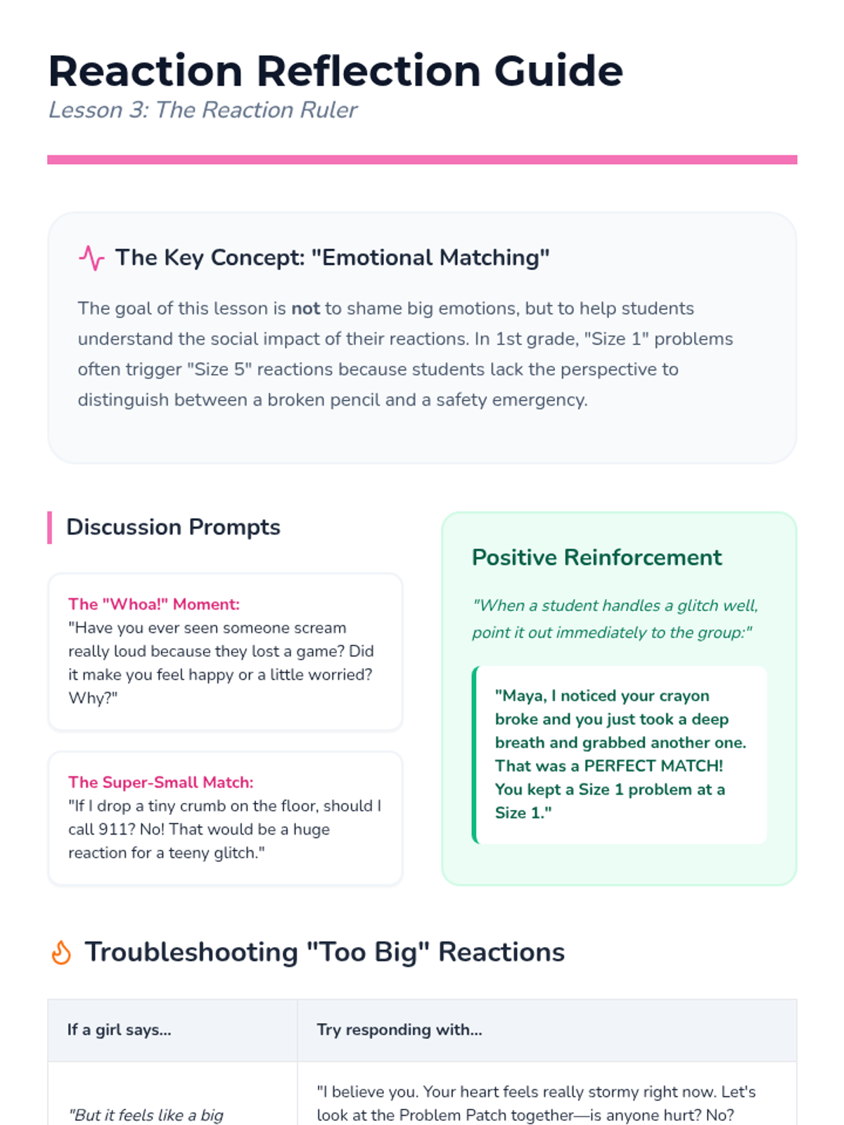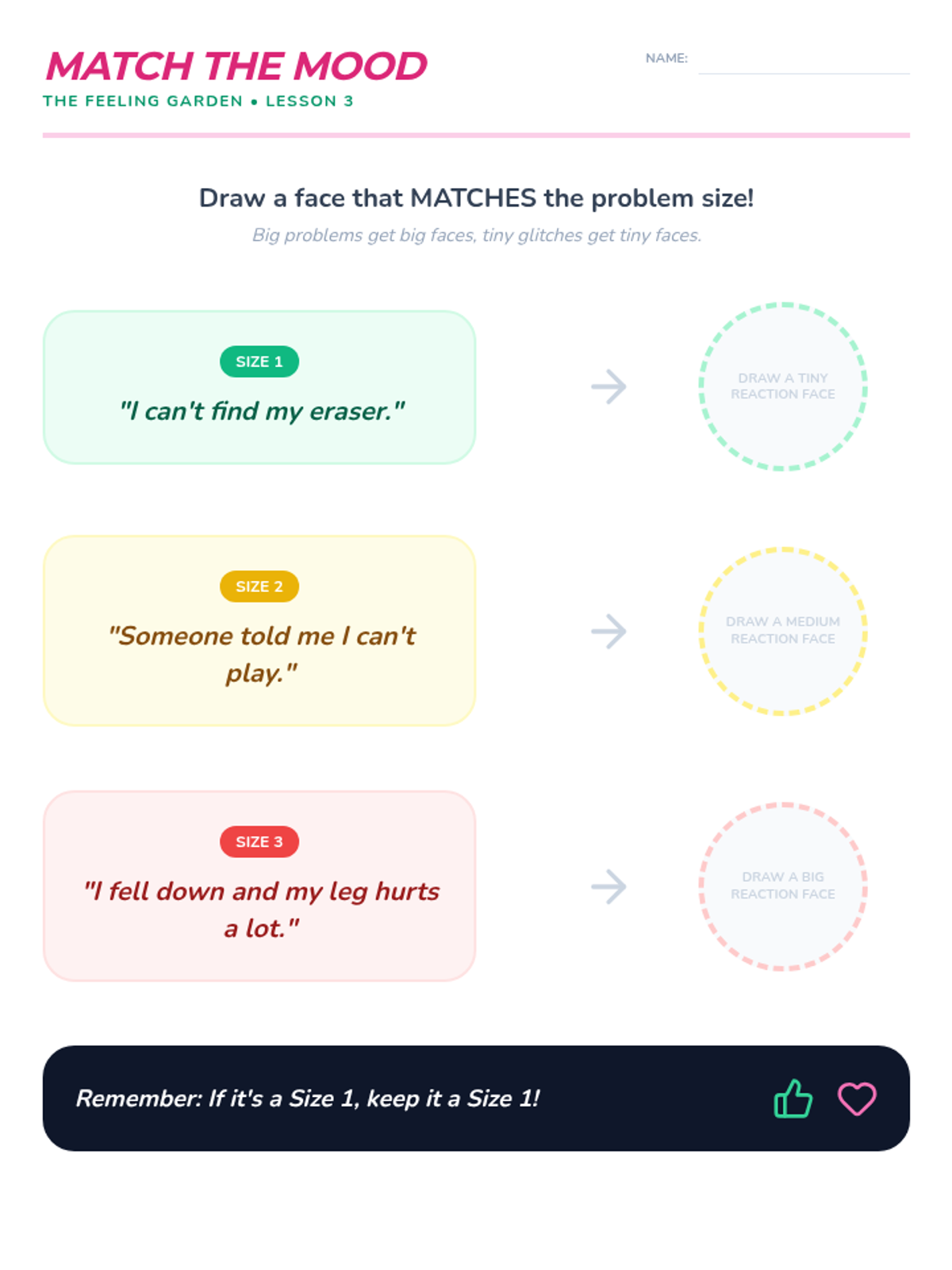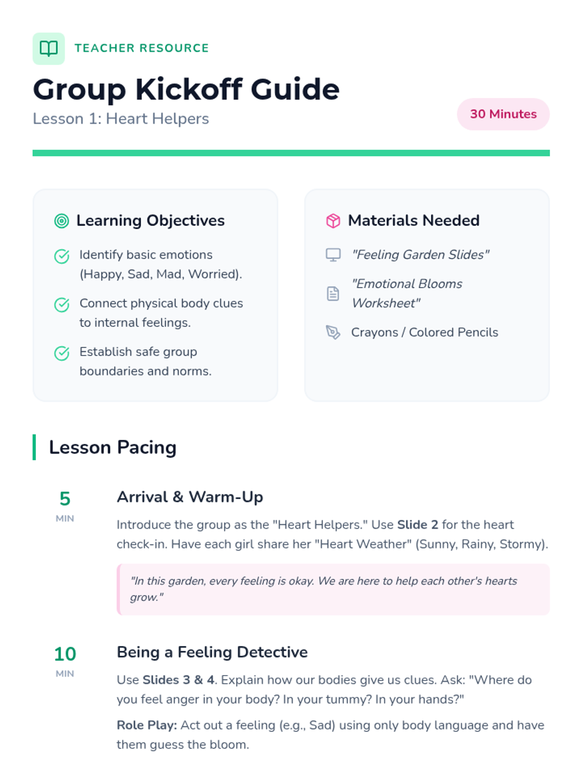A 5-lesson emotion regulation sequence for 1st grade girls focusing on identifying feelings, sizing problems versus reactions, and classroom-specific calming strategies using a "Feeling Garden" theme.