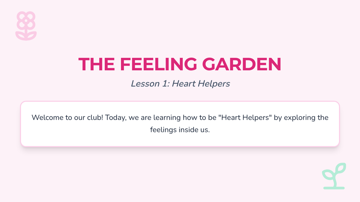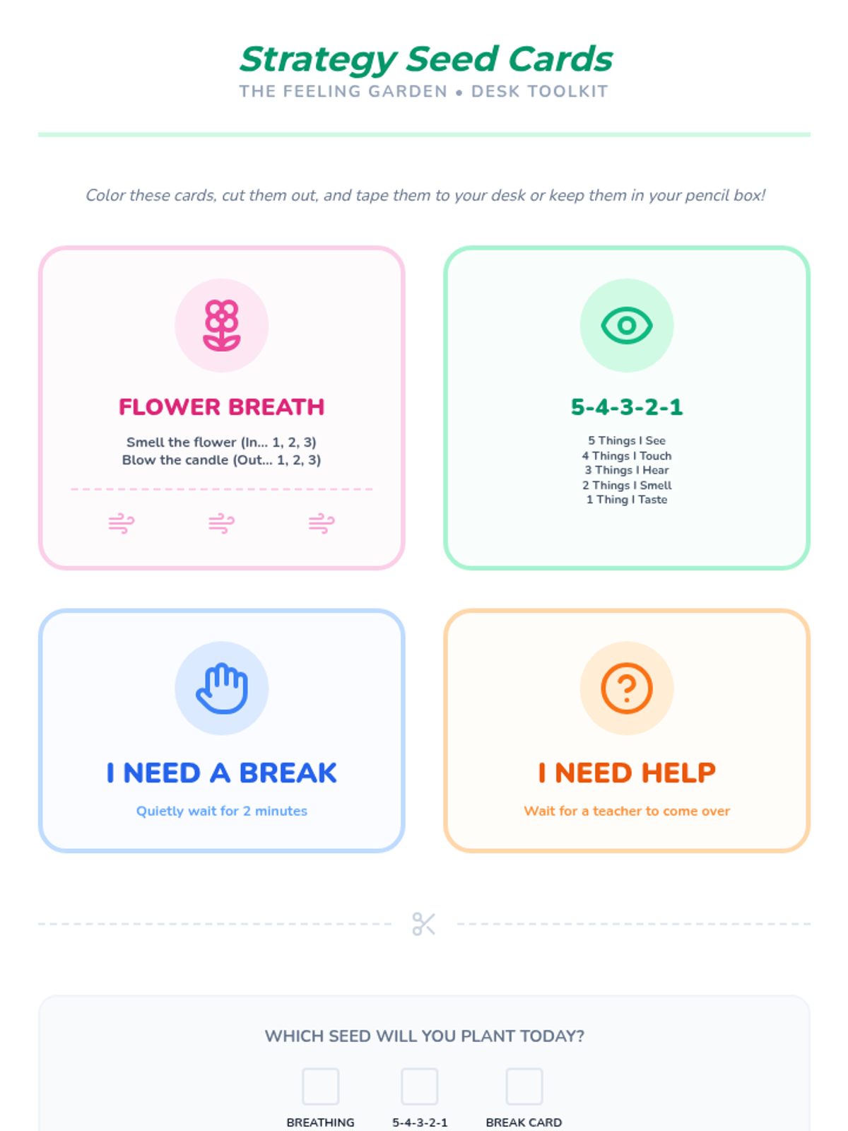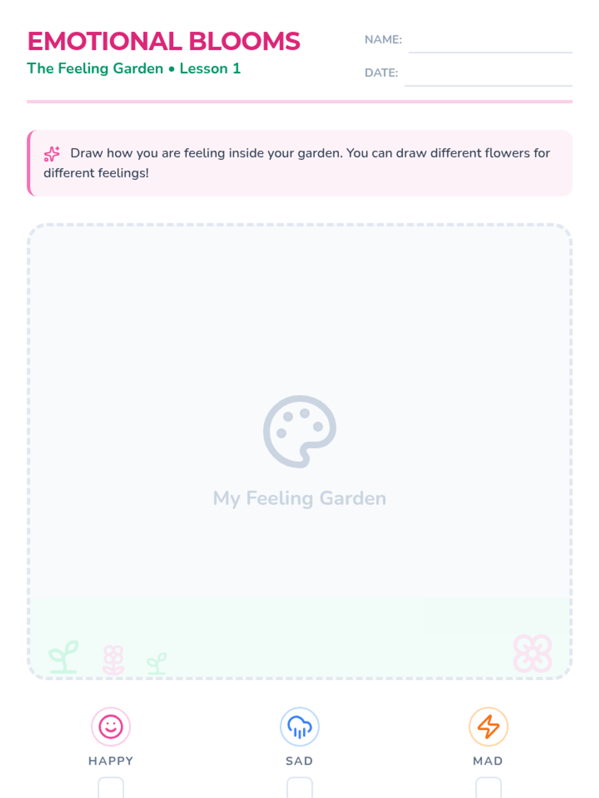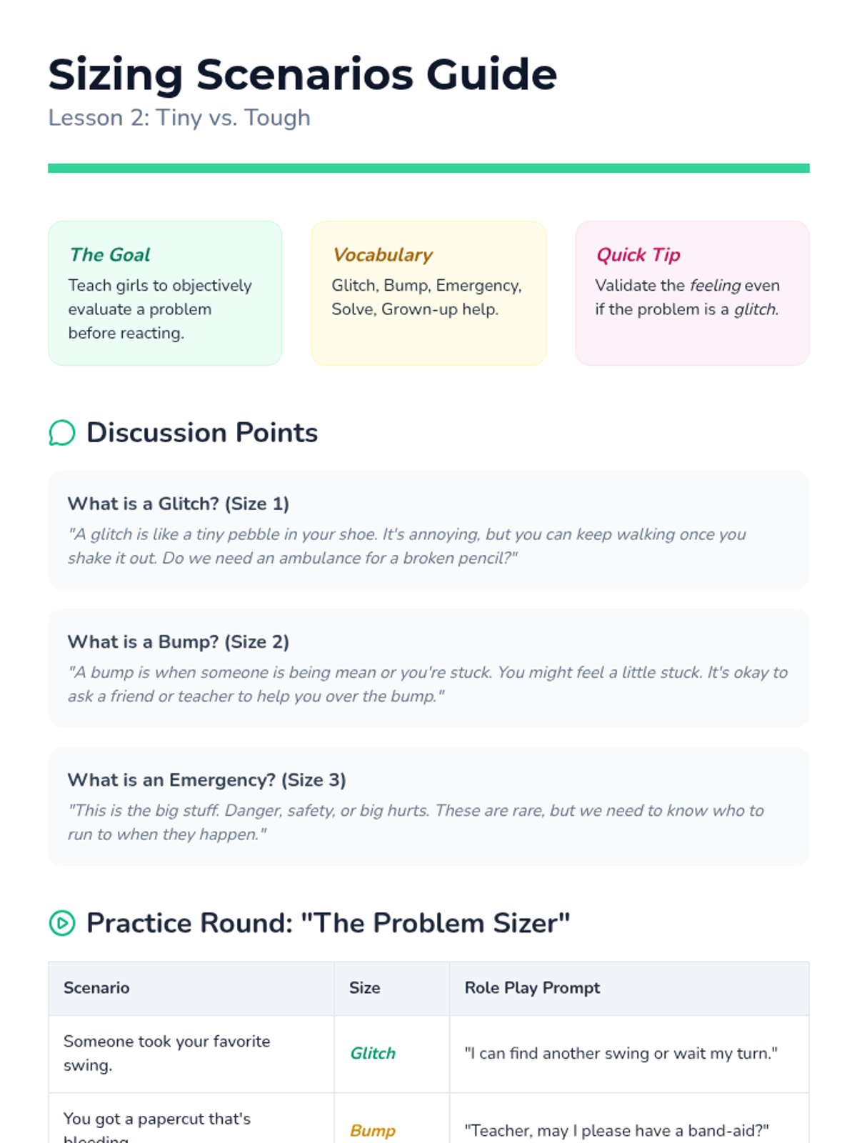 A 5-lesson emotion regulation sequence for 1st grade girls focusing on identifying feelings, sizing problems versus reactions, and classroom-specific calming strategies using a "Feeling Garden" theme.