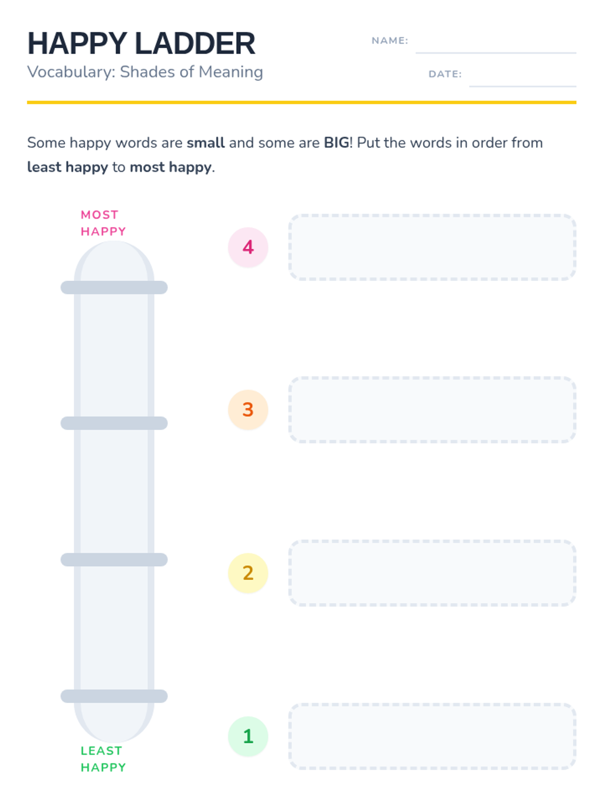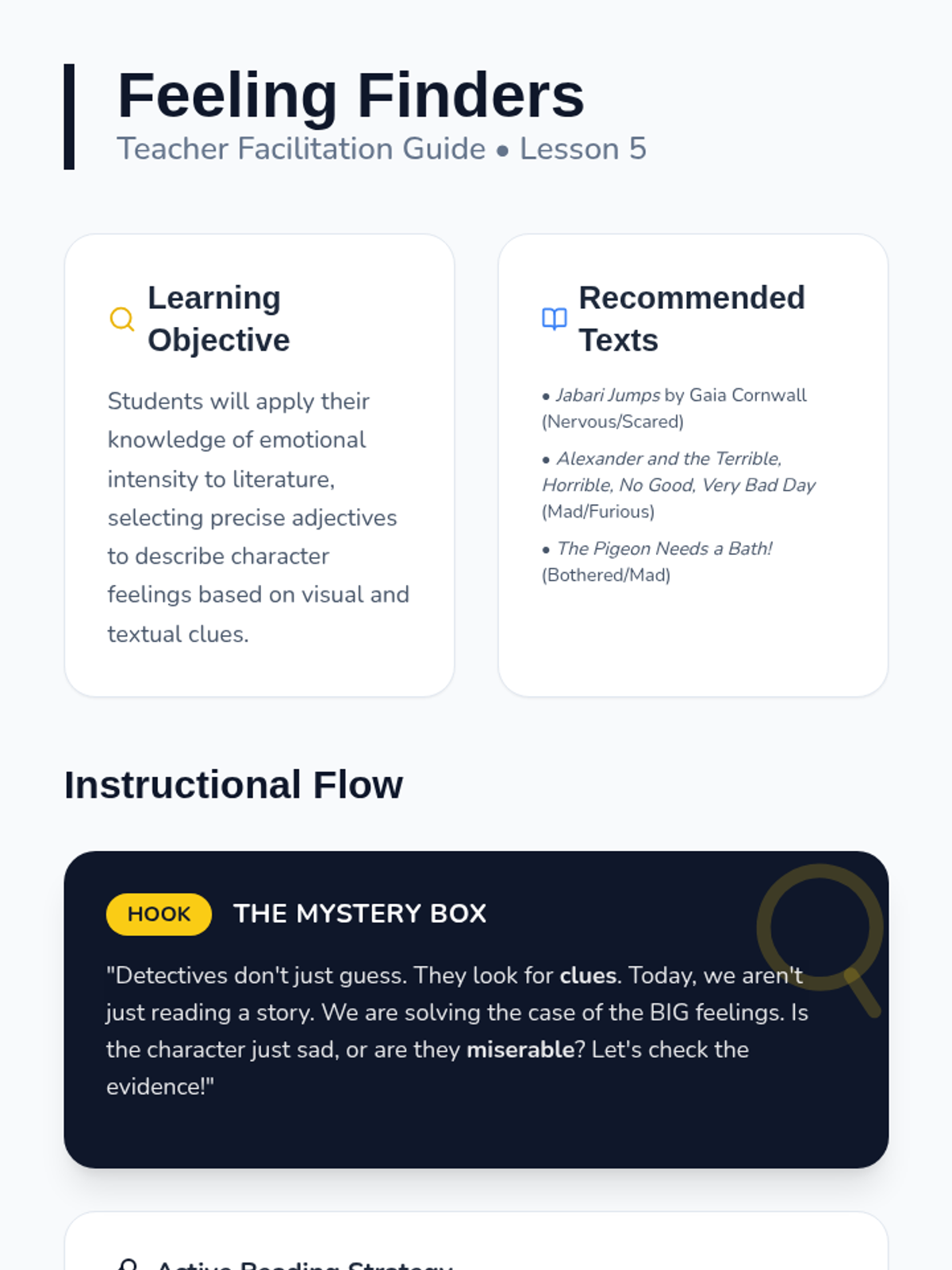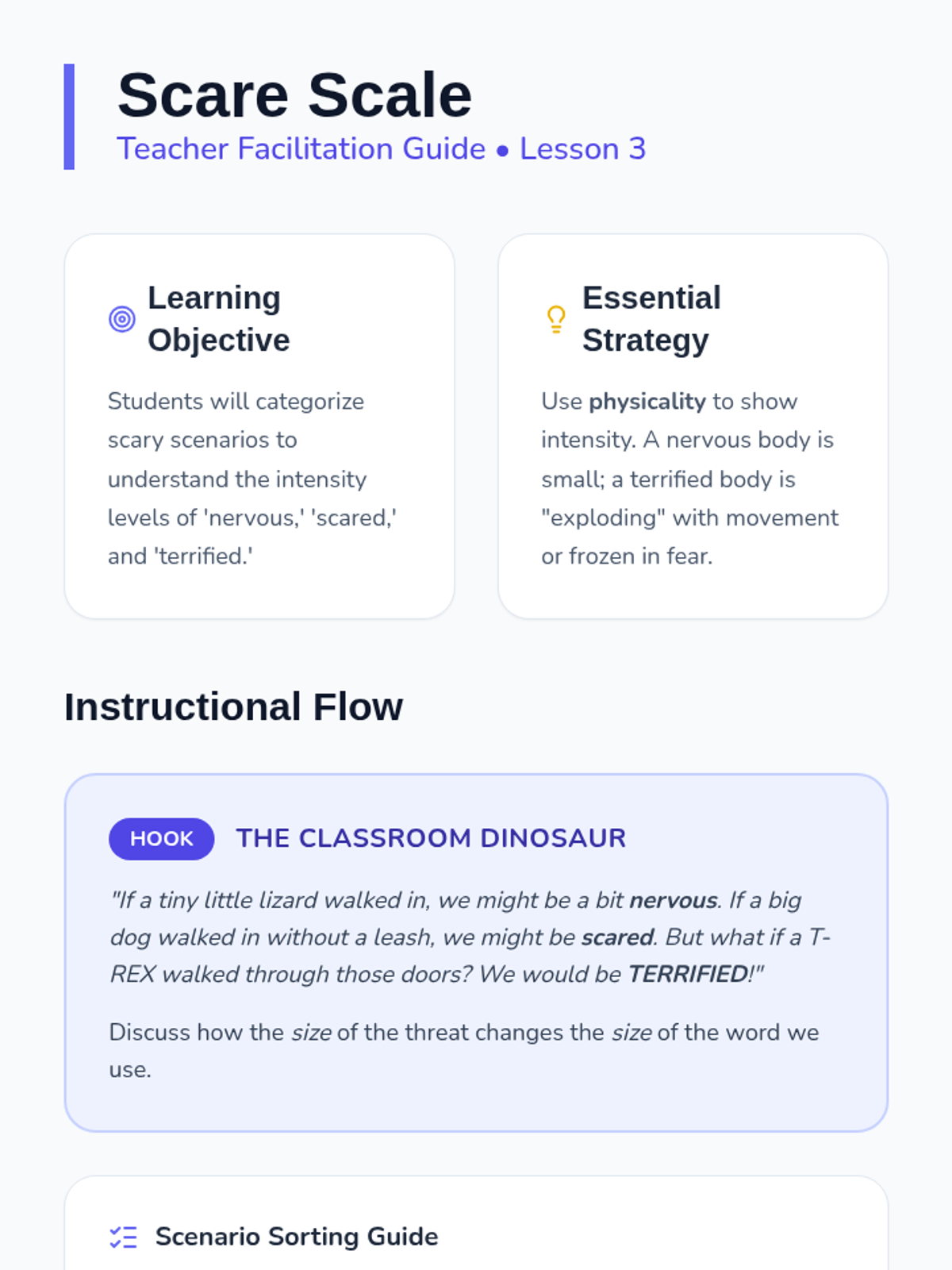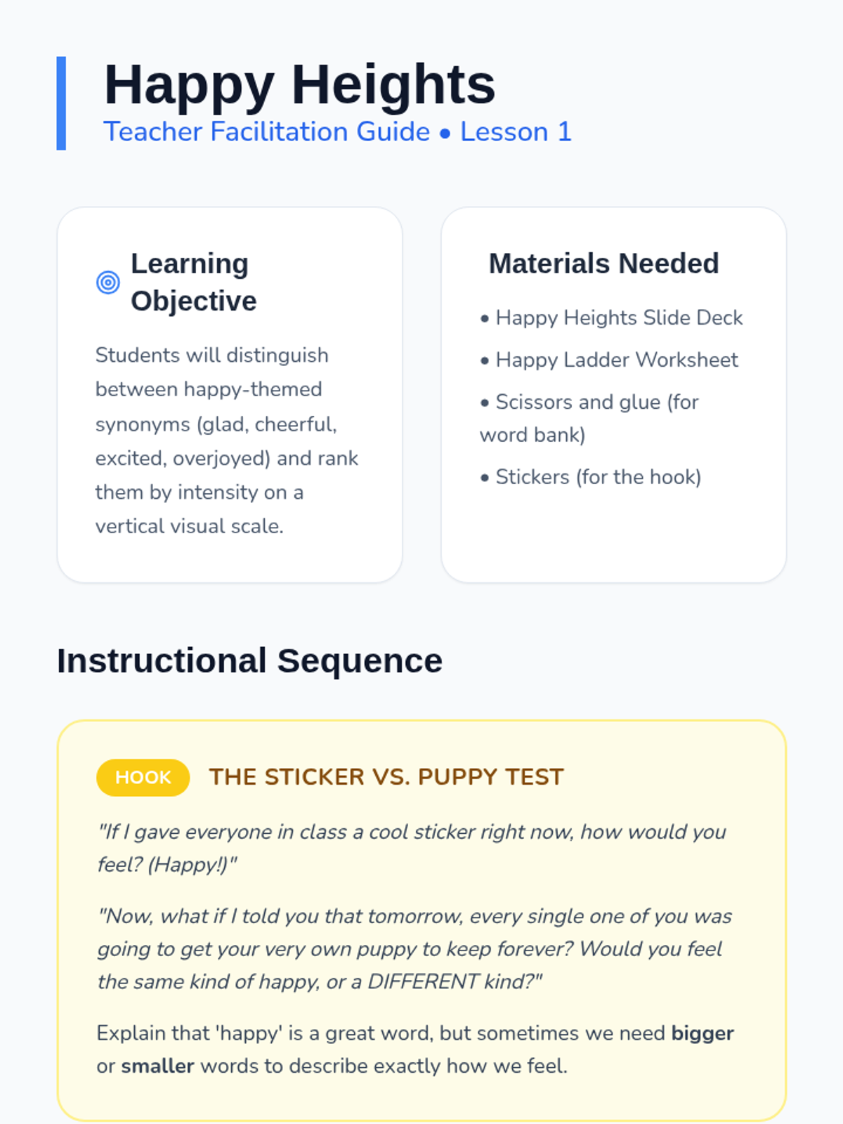 A Kindergarten ELA sequence focused on 'Shades of Meaning' for emotional vocabulary. Students learn to distinguish between varying degrees of intensity in adjectives (e.g., happy vs. overjoyed, mad vs. furious) through visual scales, thermometers, and character analysis.