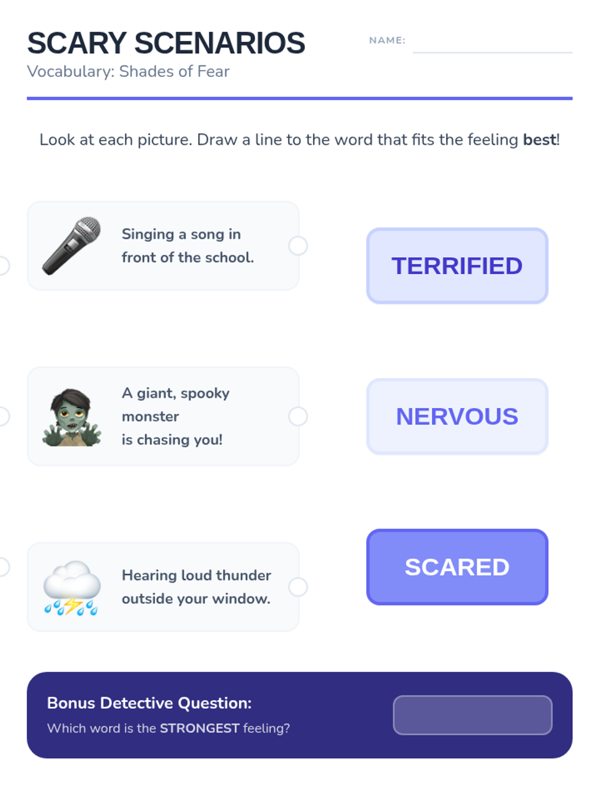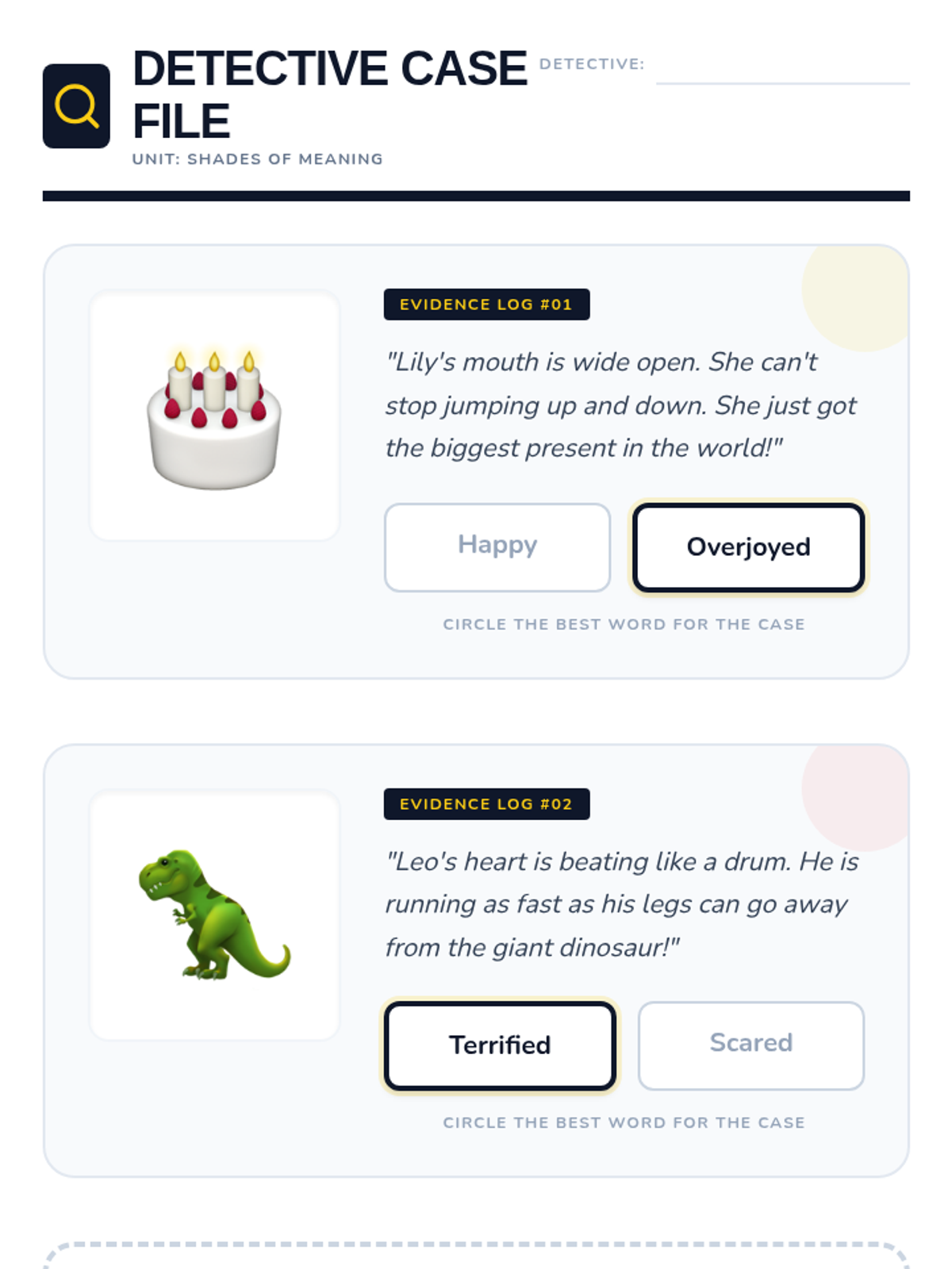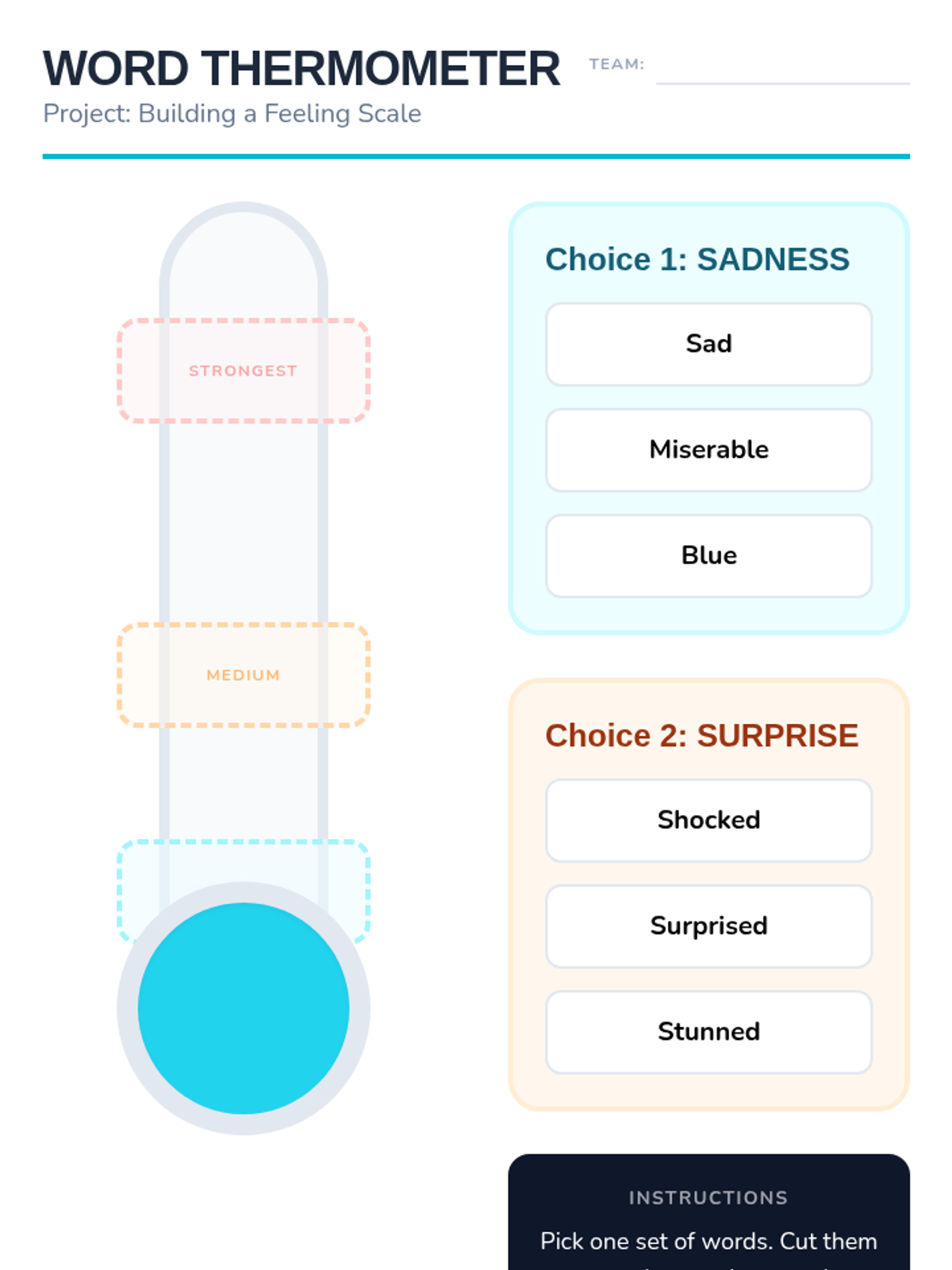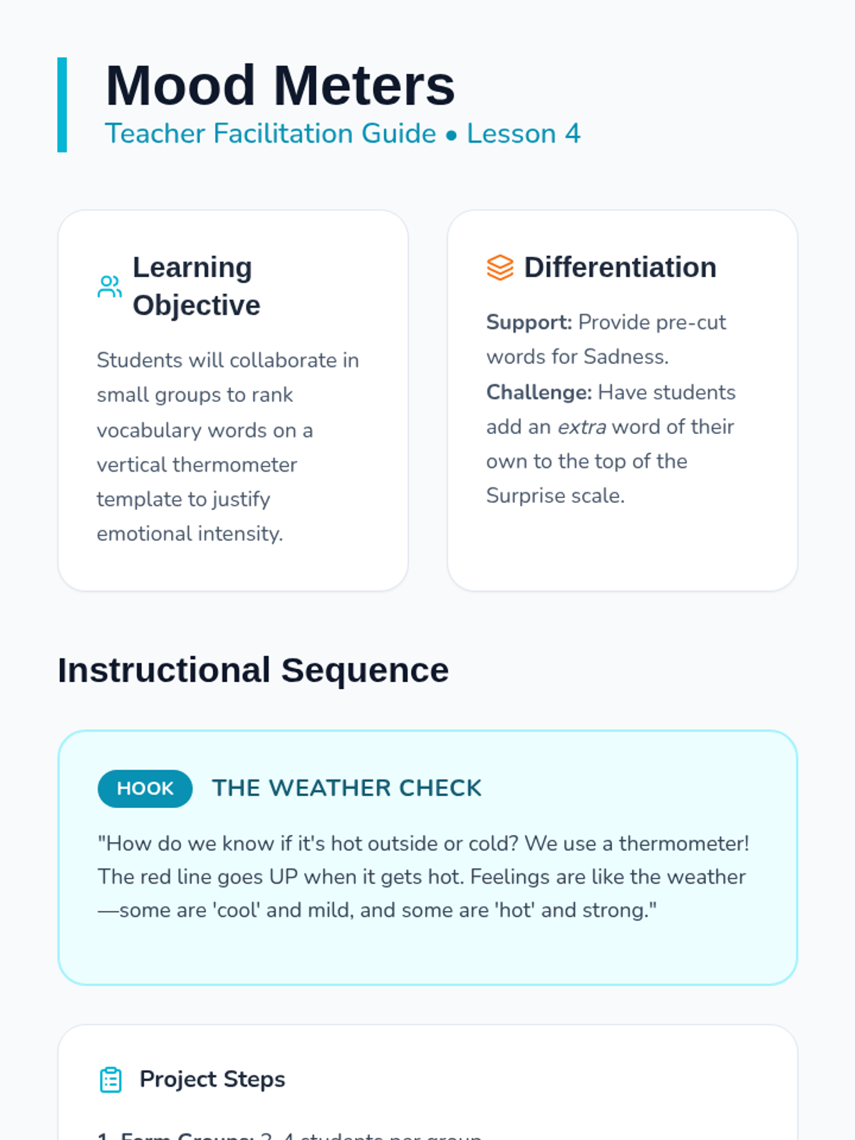 A Kindergarten ELA sequence focused on 'Shades of Meaning' for emotional vocabulary. Students learn to distinguish between varying degrees of intensity in adjectives (e.g., happy vs. overjoyed, mad vs. furious) through visual scales, thermometers, and character analysis.
