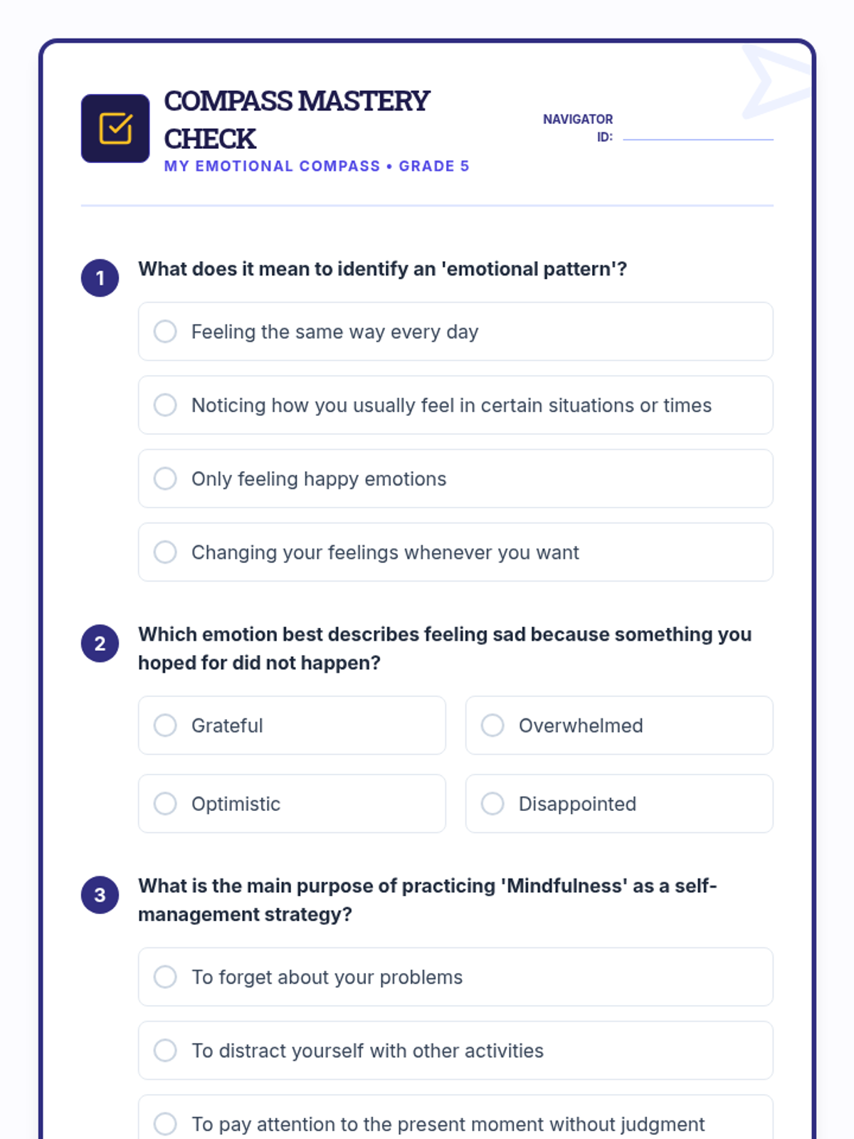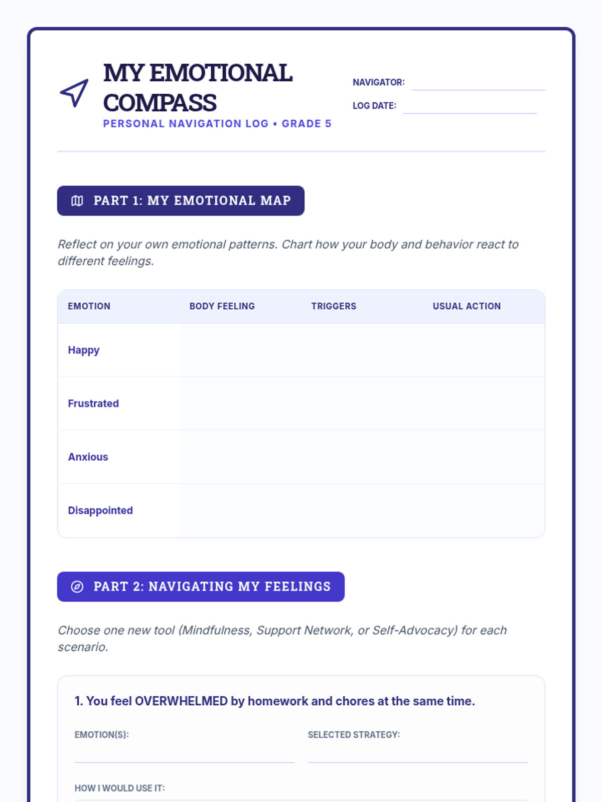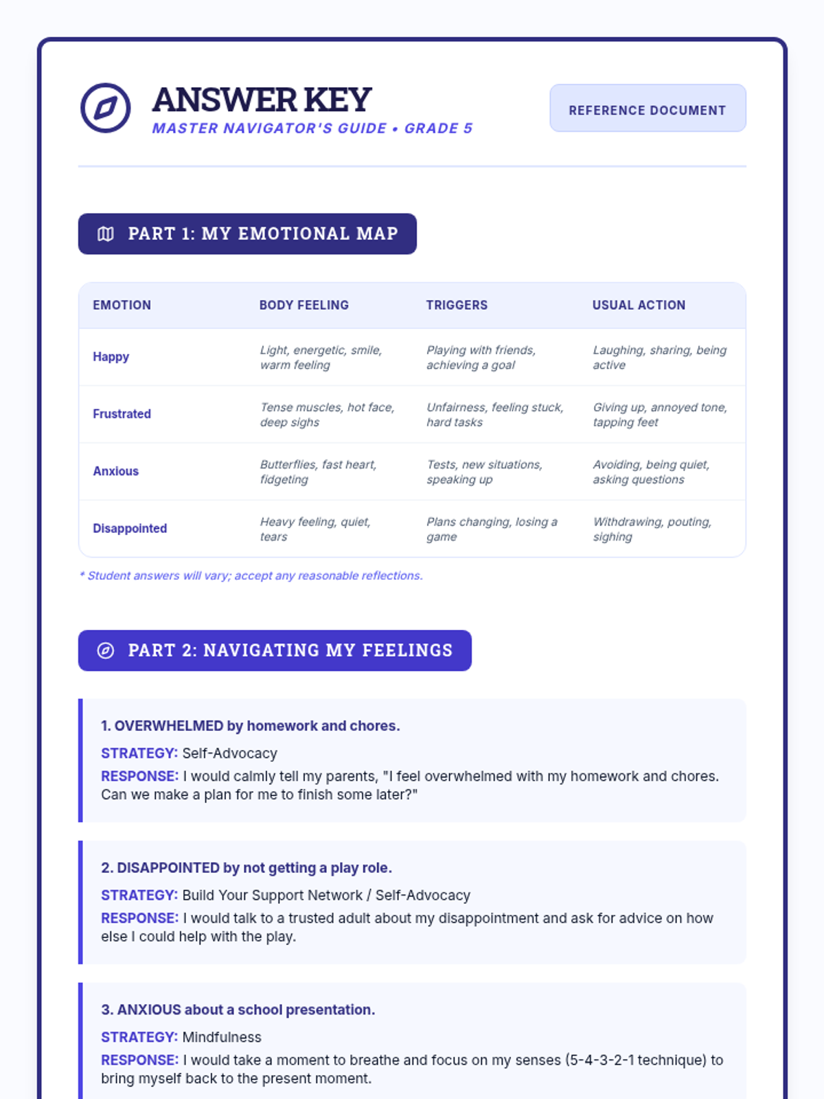 A comprehensive SEL sequence for grades 3-5, guiding students through the identification of emotions, understanding triggers, and mastering self-regulation strategies through an explorer-themed journey.