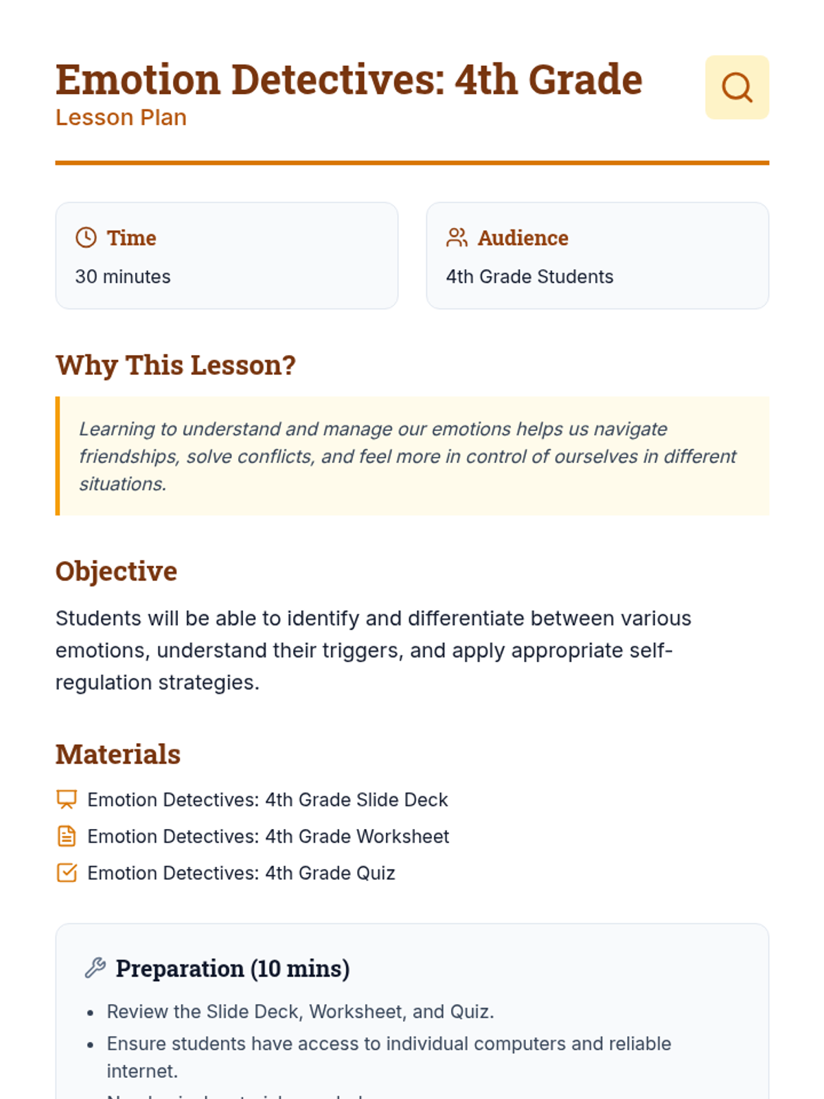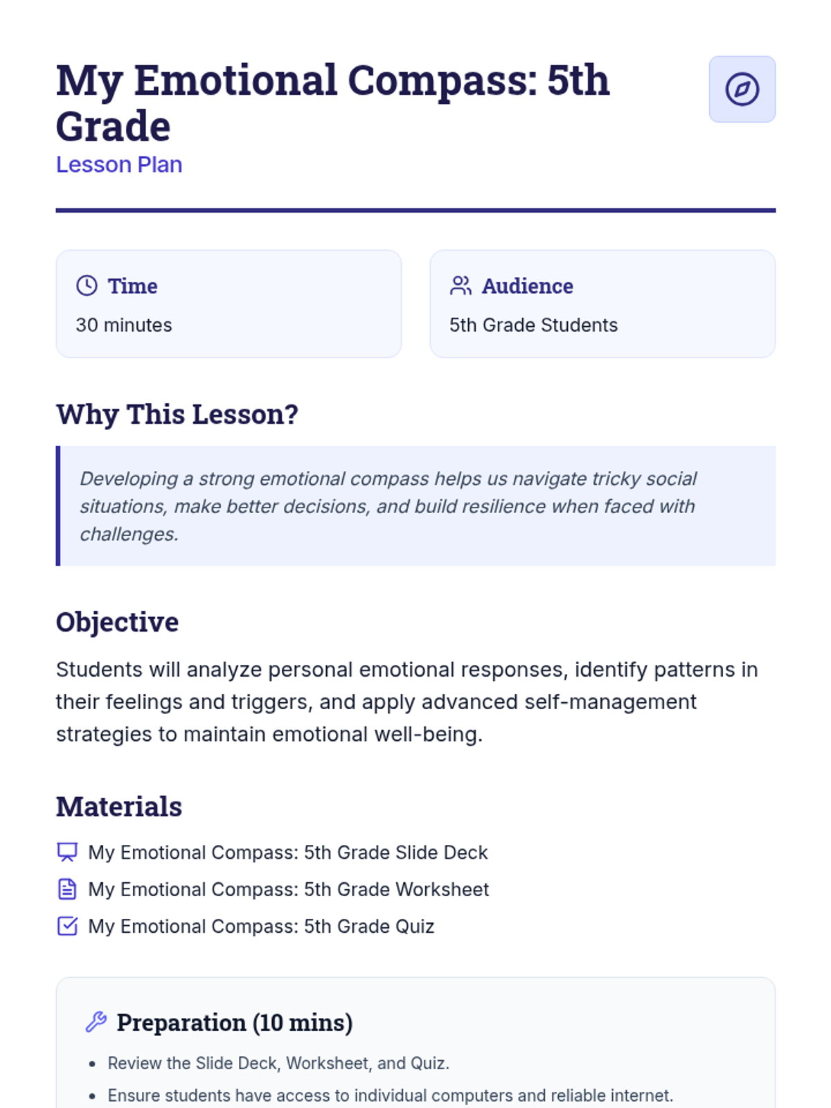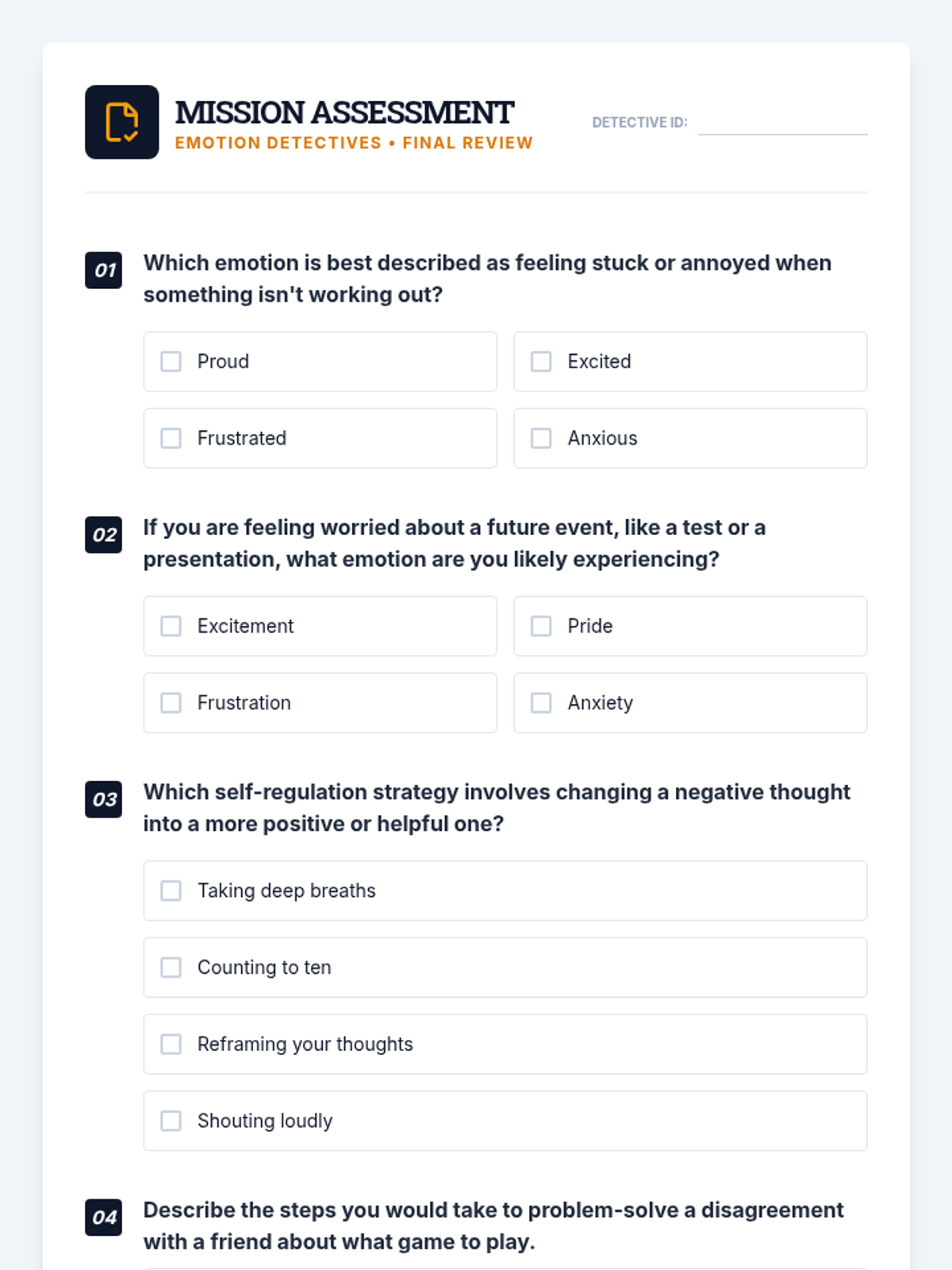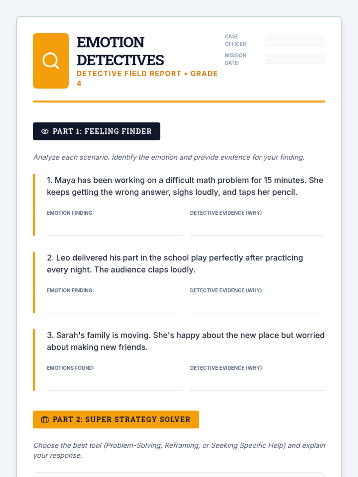 A comprehensive SEL sequence for grades 3-5, guiding students through the identification of emotions, understanding triggers, and mastering self-regulation strategies through an explorer-themed journey.