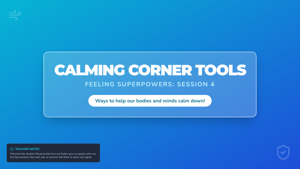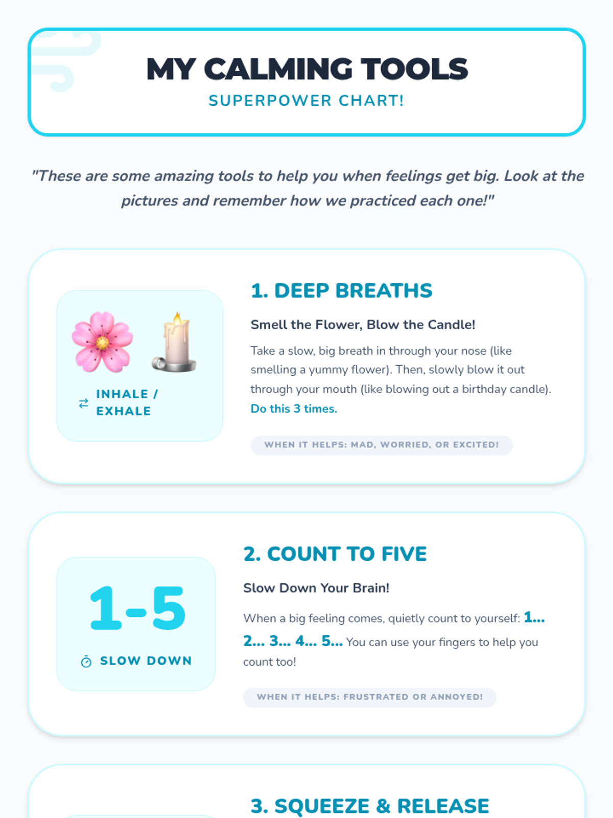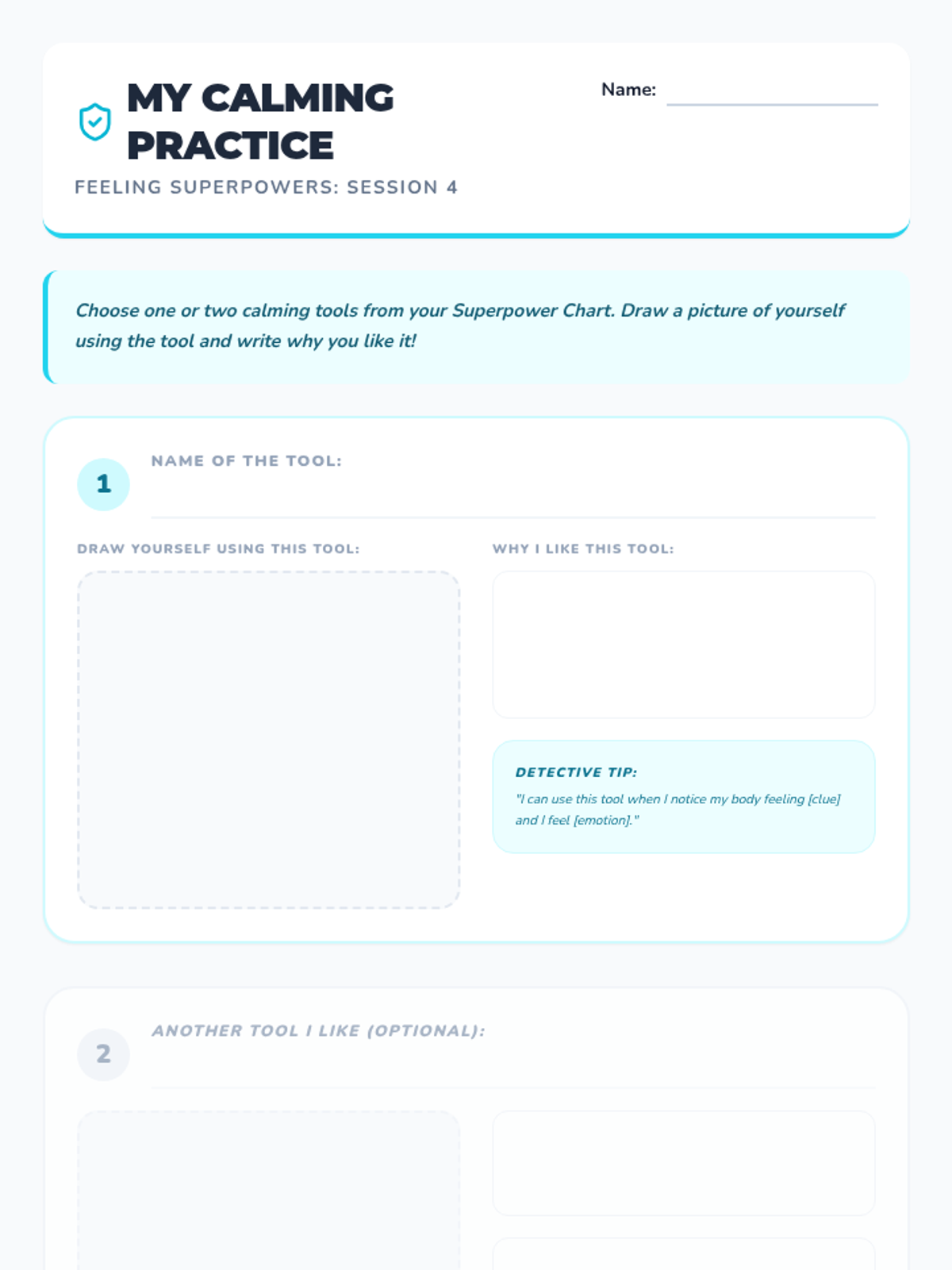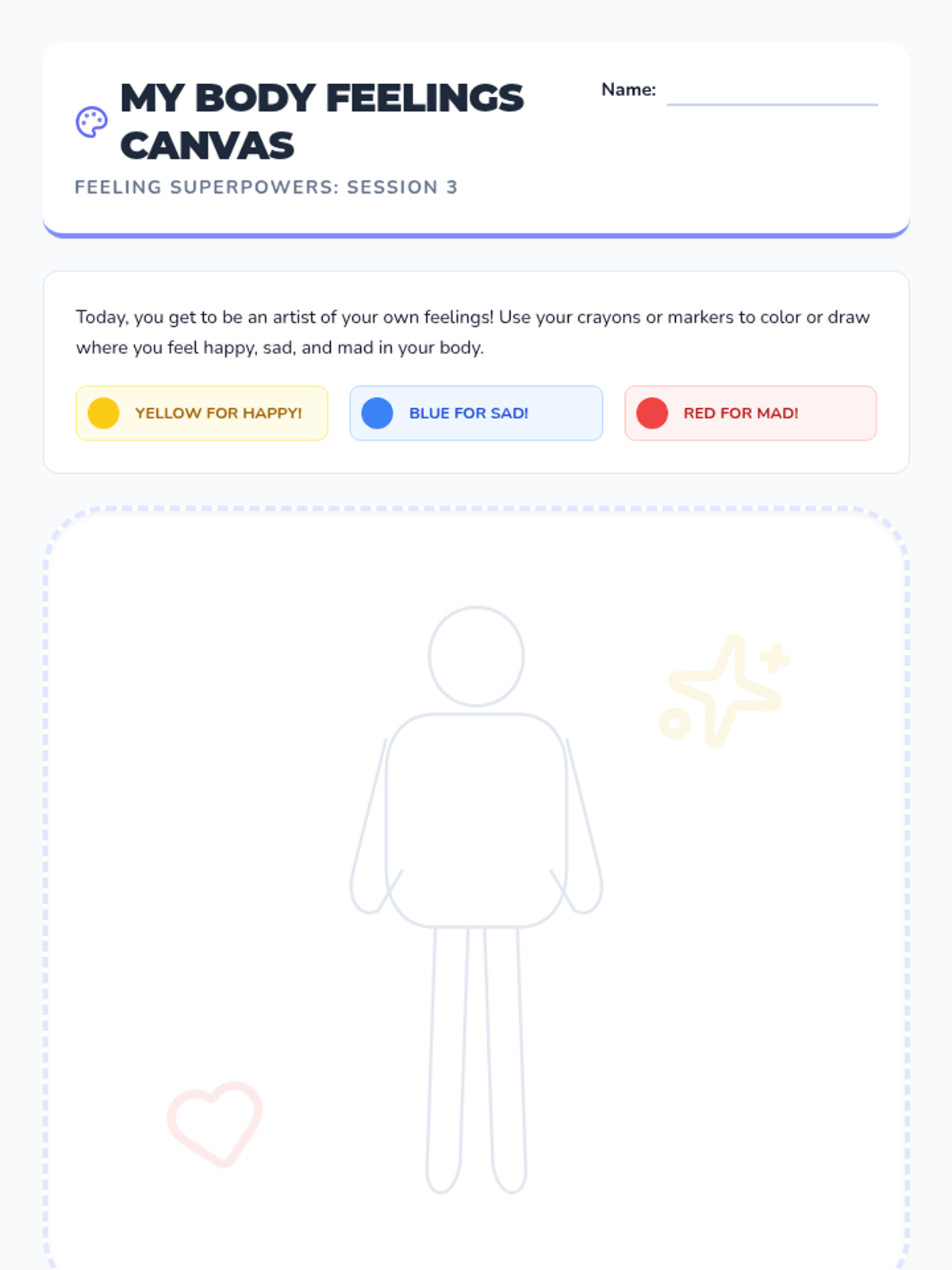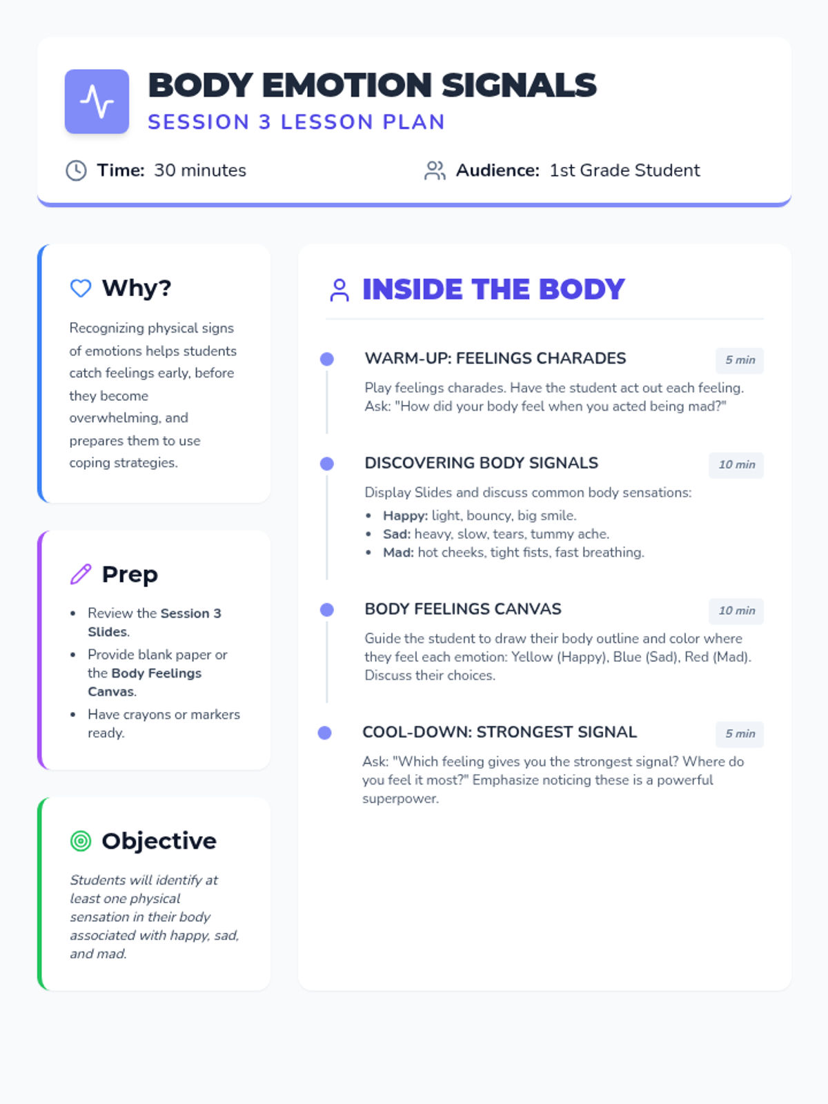 A 6-7 week individual counseling program for 1st grade students to develop emotional literacy, body awareness, and self-regulation skills through a 'superpower' theme.