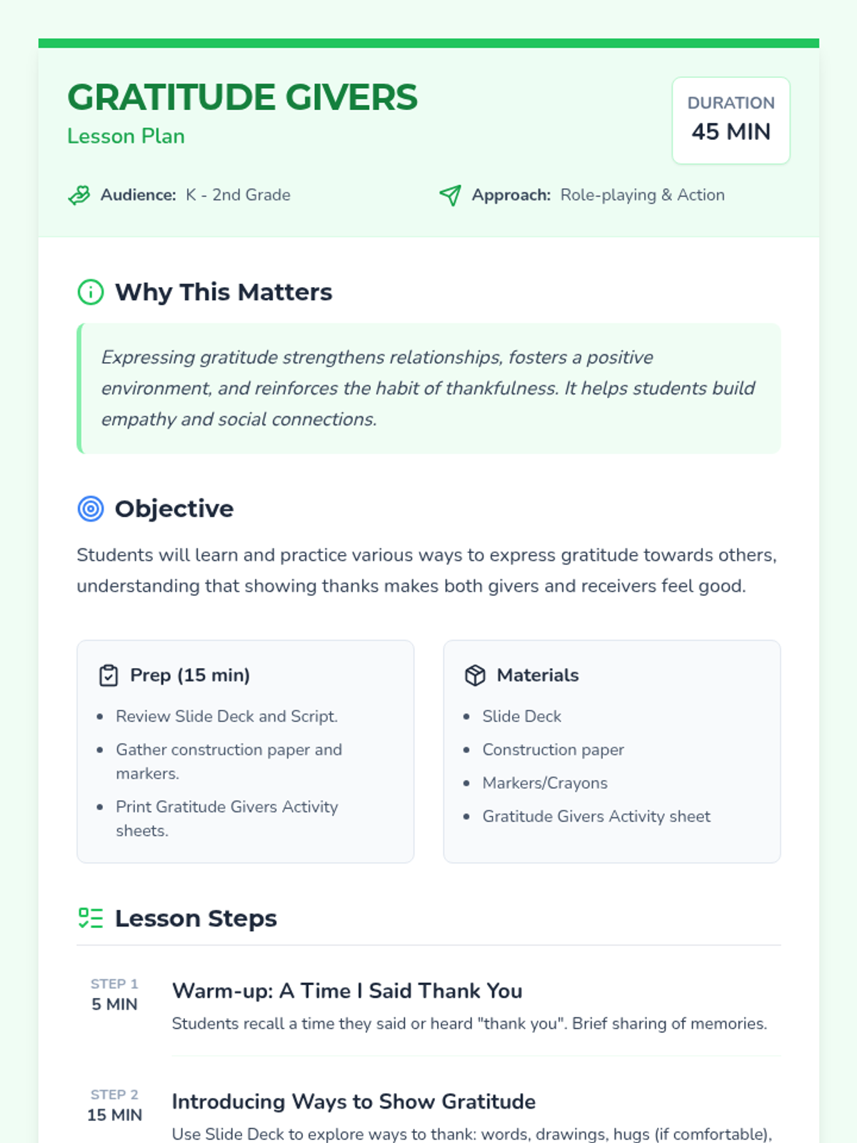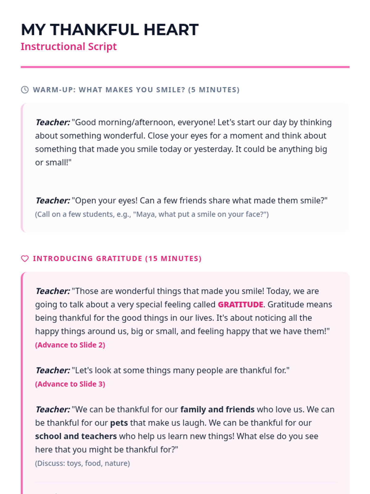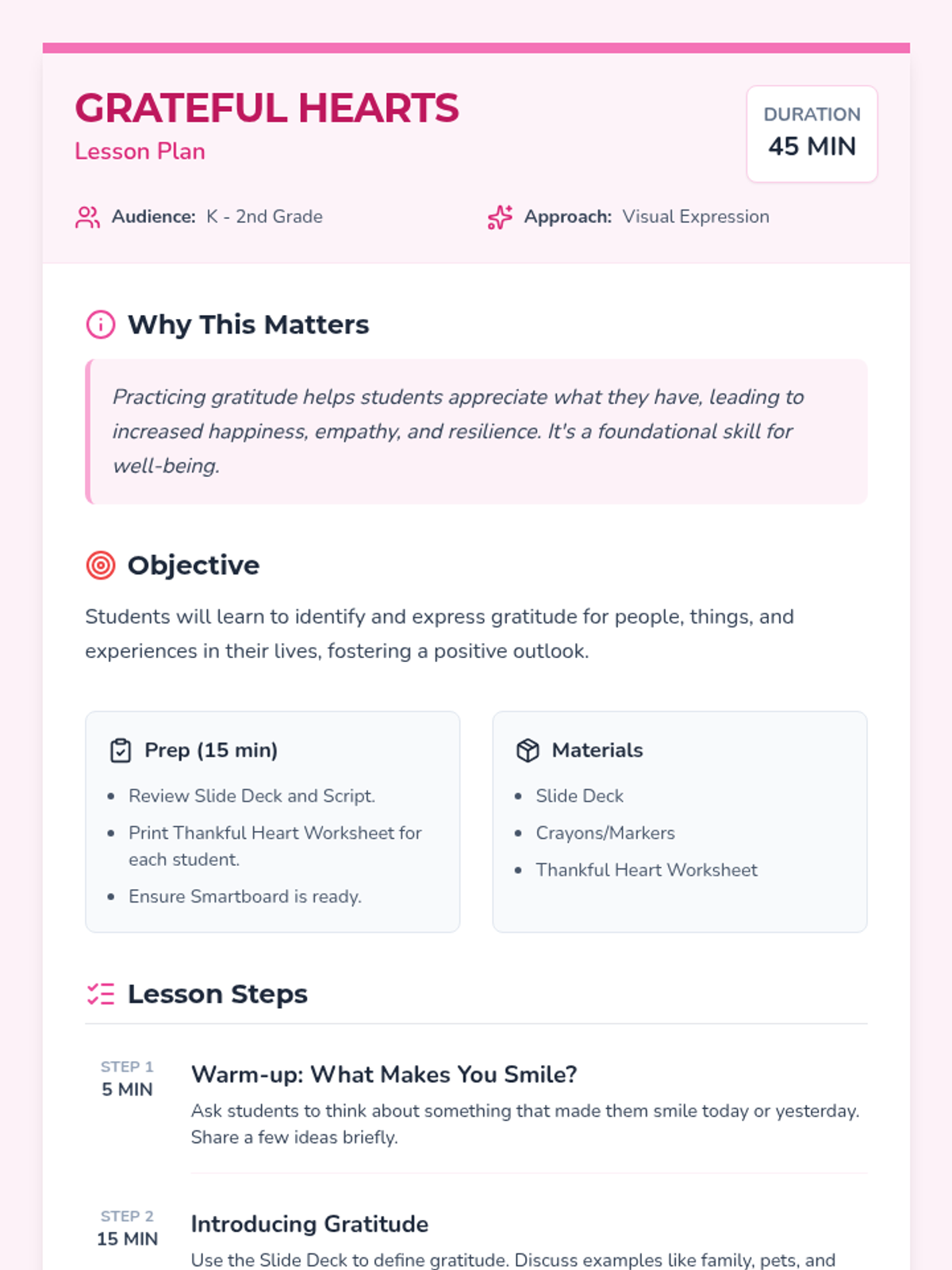 A comprehensive Social-Emotional Learning unit for K-2 students focused on identifying emotions, practicing gratitude, and developing self-management skills through interactive activities and creative expression.