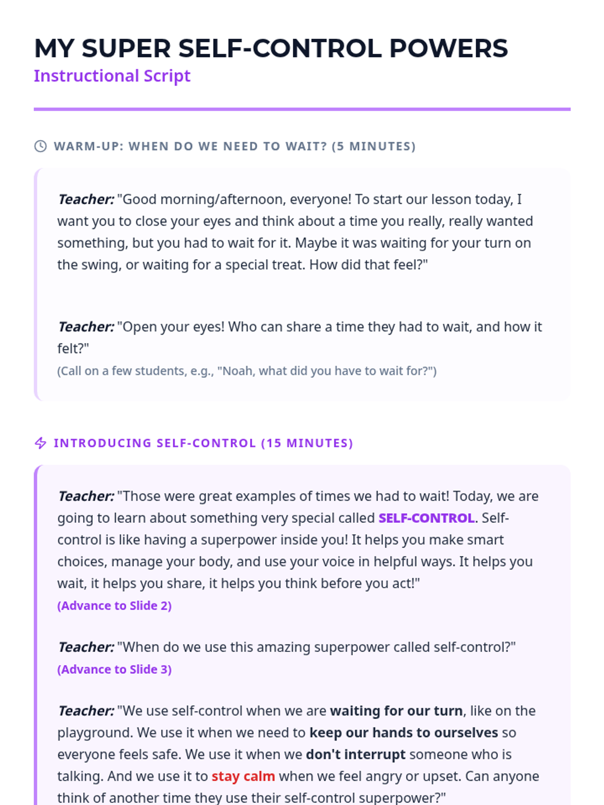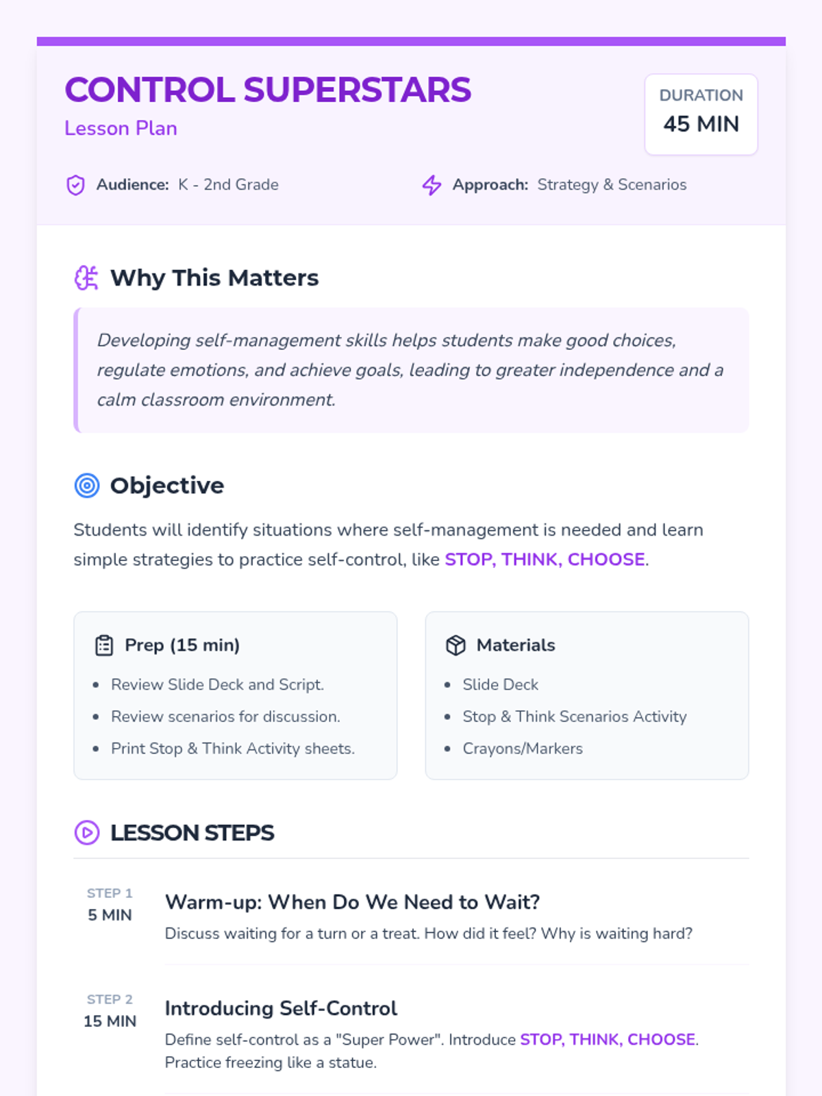 A collection of lessons focused on essential social-emotional skills across primary grades, including anger management, following directions, and mindfulness.
