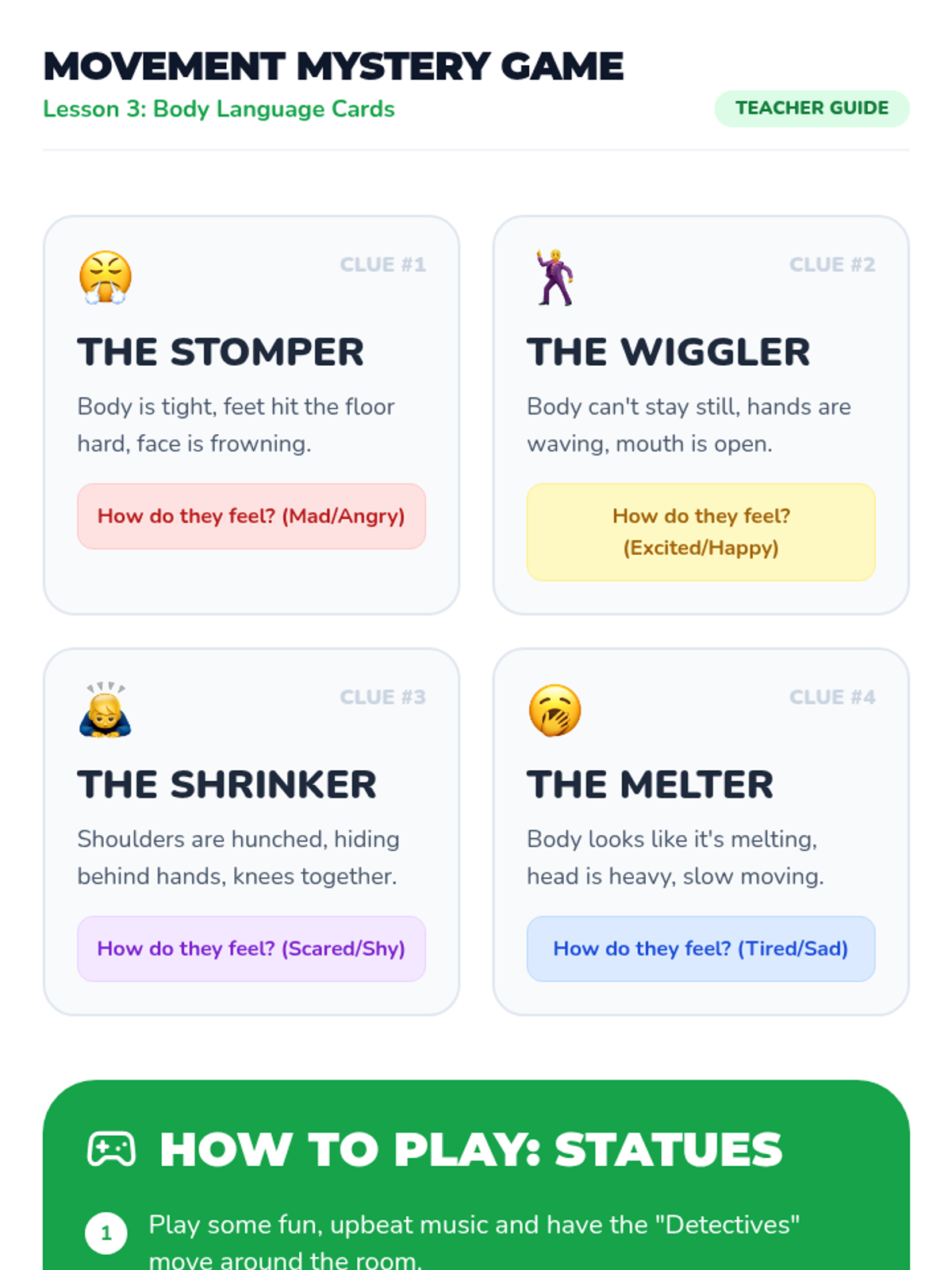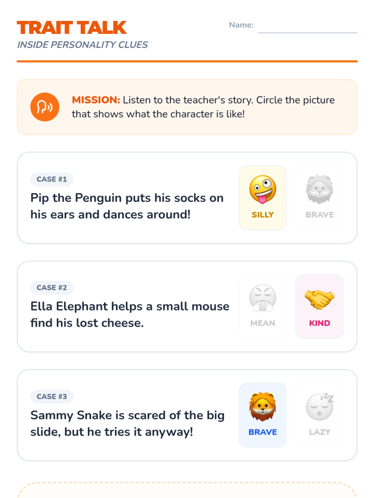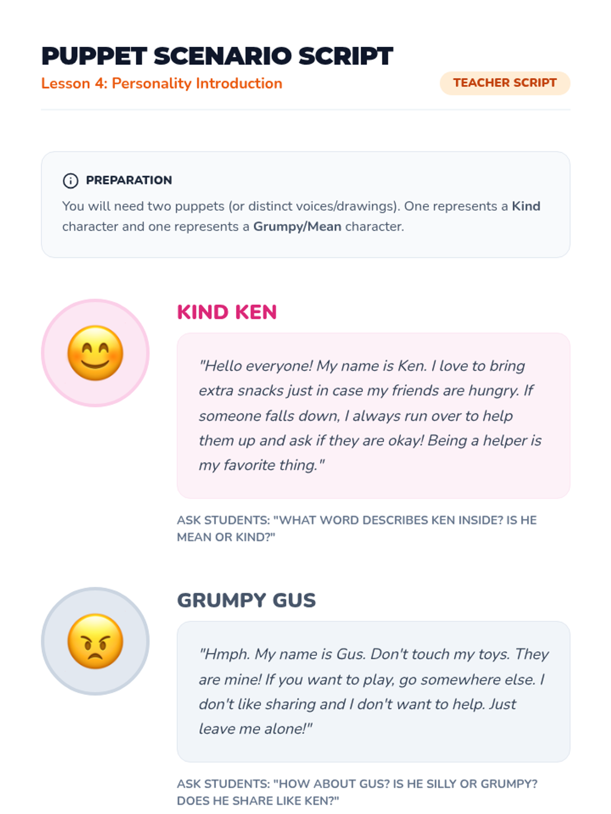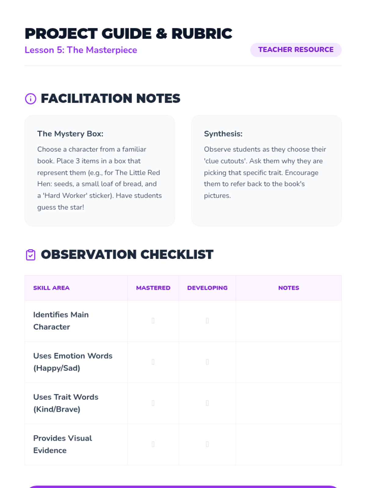 A comprehensive Pre-K sequence focused on identifying main characters, interpreting their facial expressions and body language, and developing vocabulary for personality traits. Students use detective-themed visual cues to understand character emotions and internal traits through picture books and interactive activities.