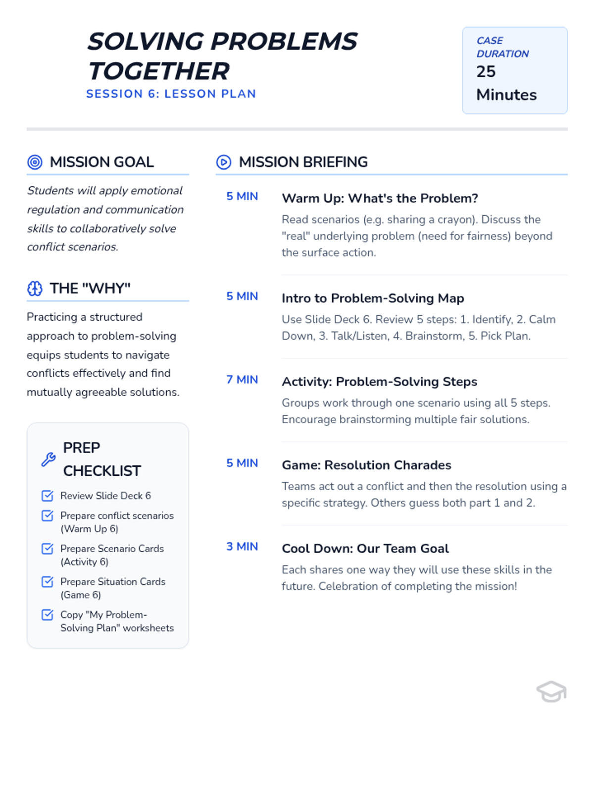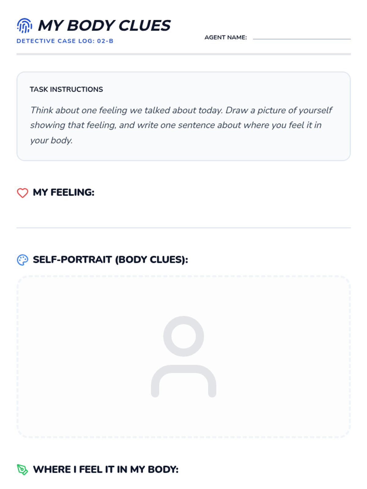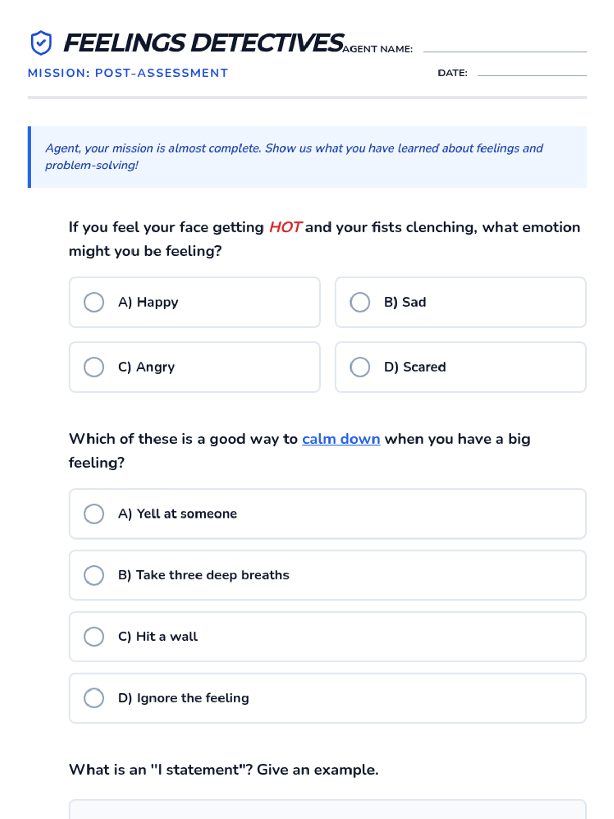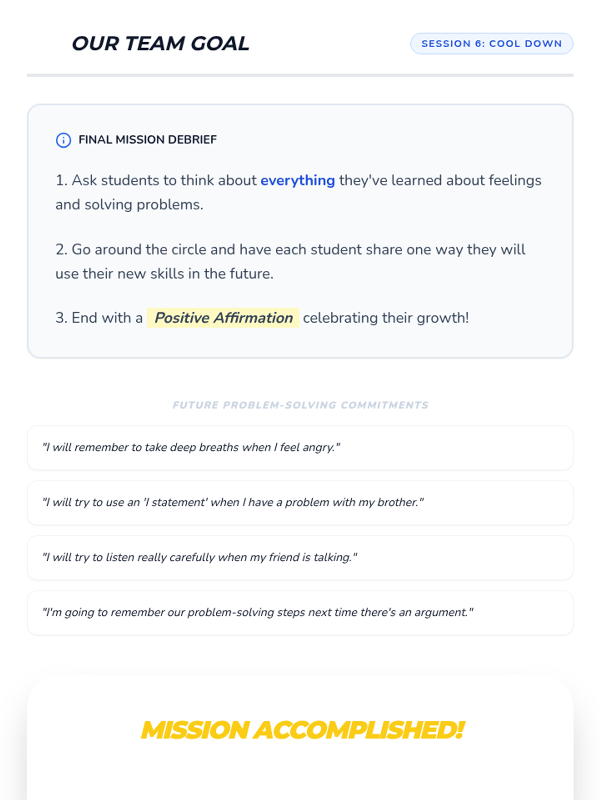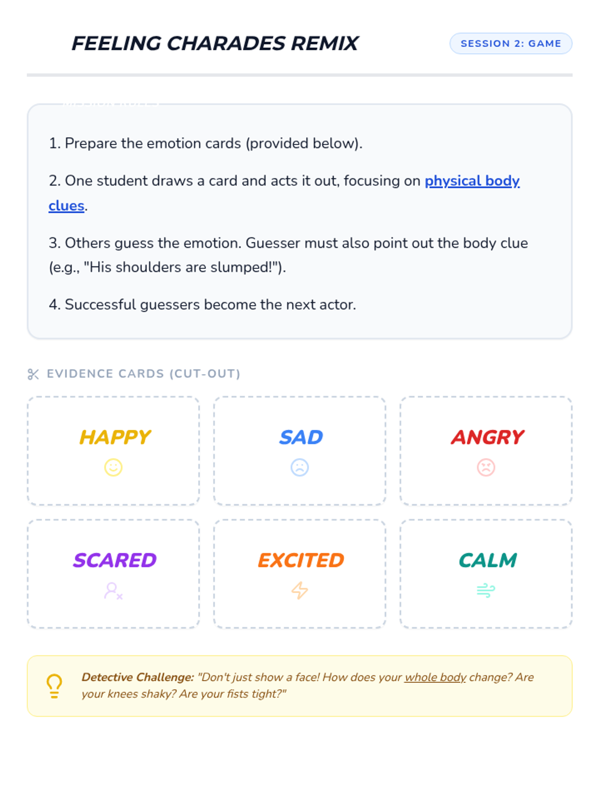 A six-session social-emotional learning program for 2nd and 3rd-grade boys focused on identifying emotions, physical regulation, and peaceful conflict resolution through a fun 'Feelings Detectives' theme.