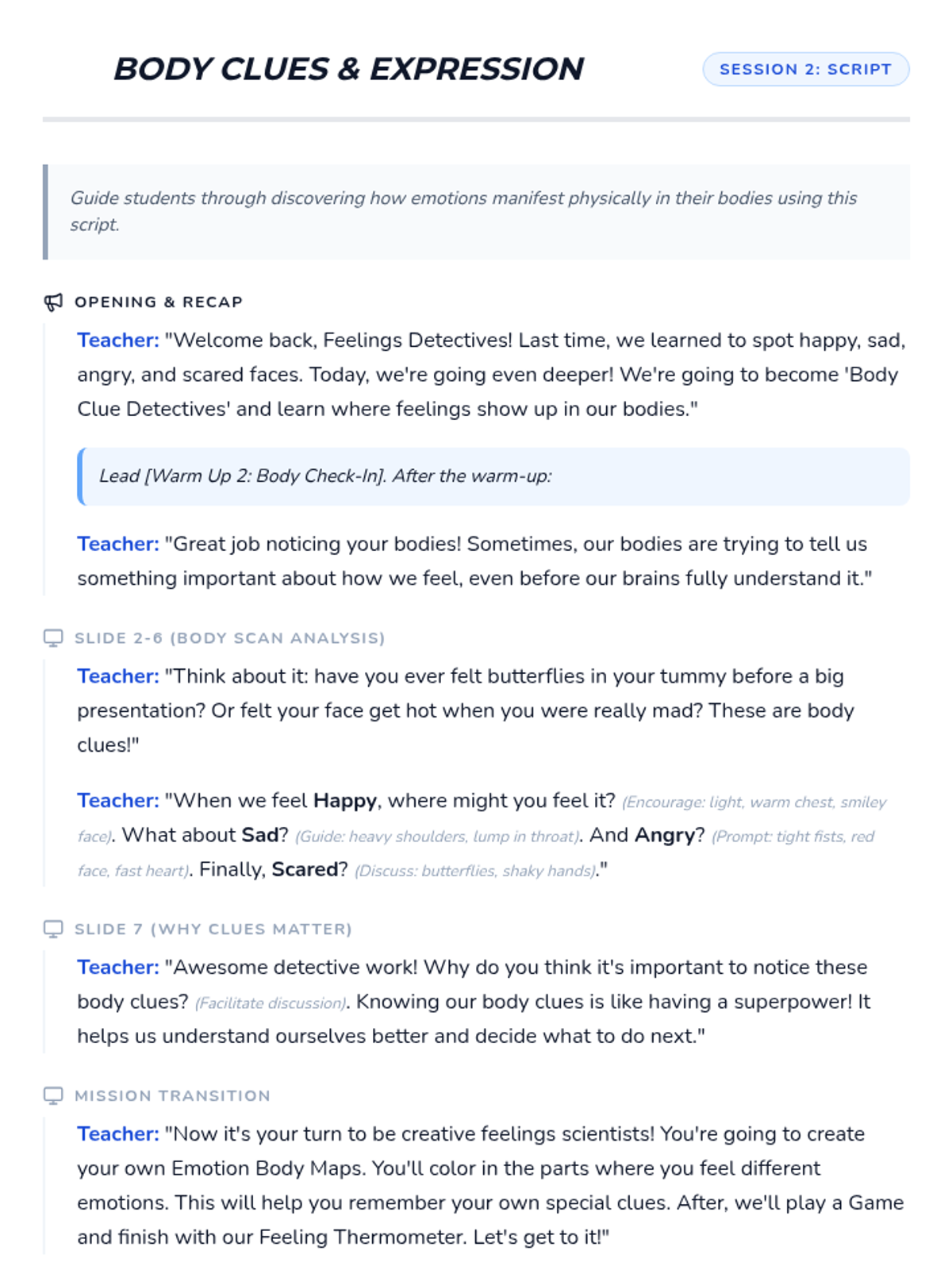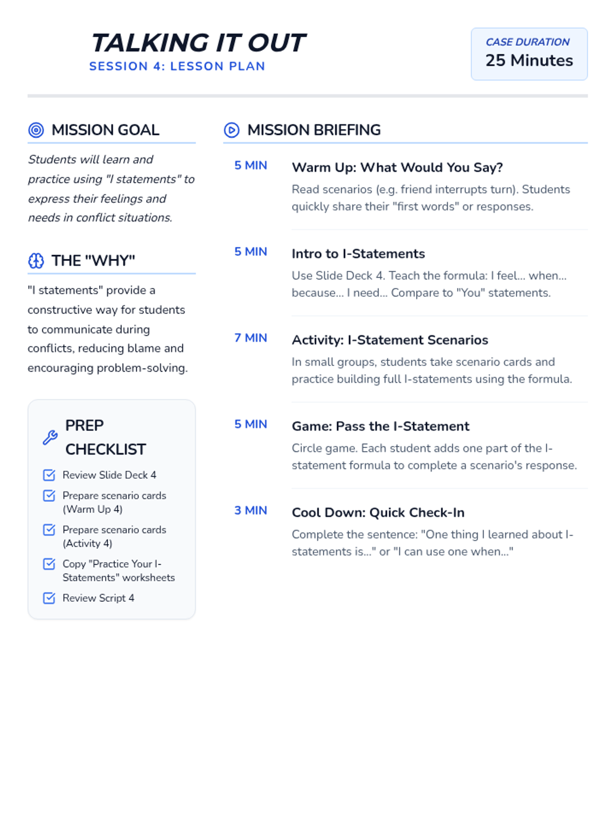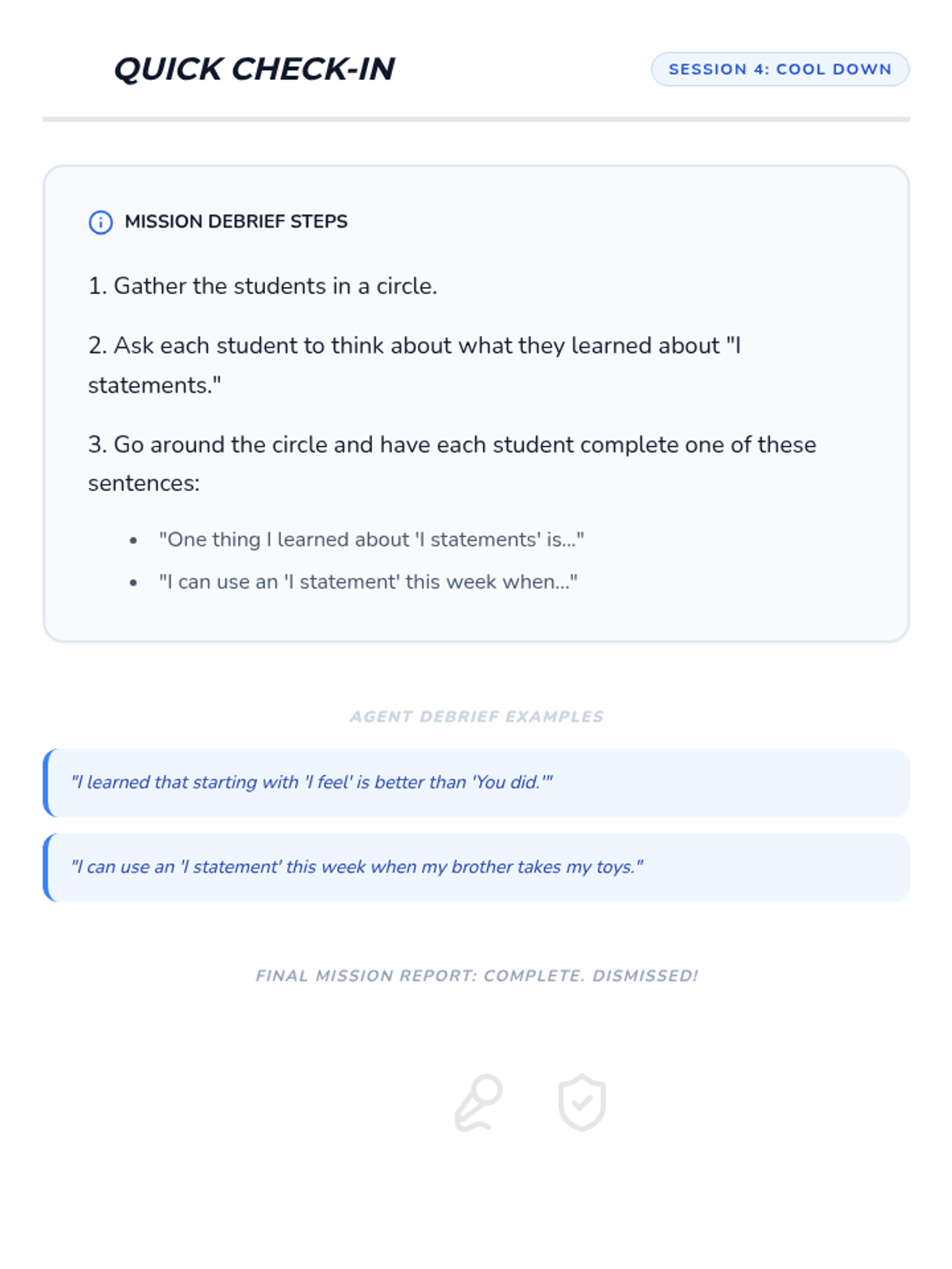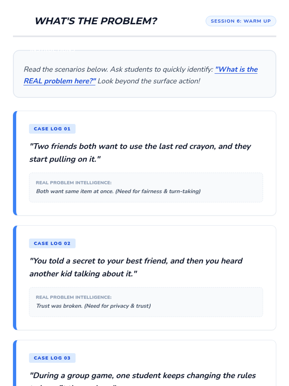 A six-session social-emotional learning program for 2nd and 3rd-grade boys focused on identifying emotions, physical regulation, and peaceful conflict resolution through a fun 'Feelings Detectives' theme.