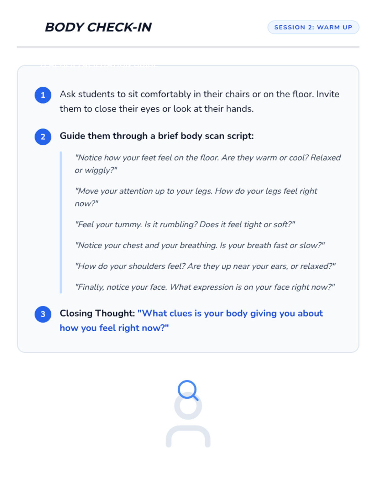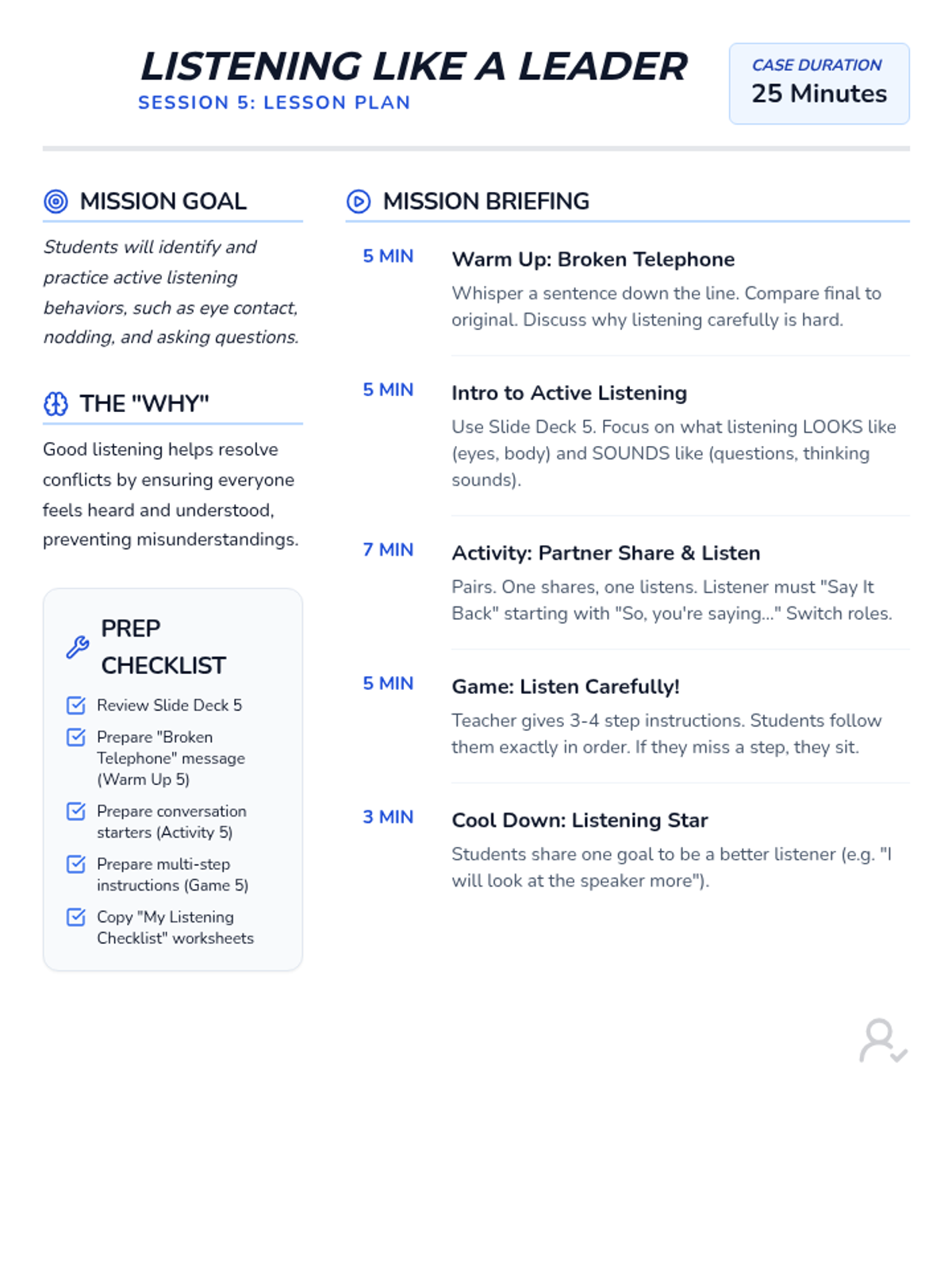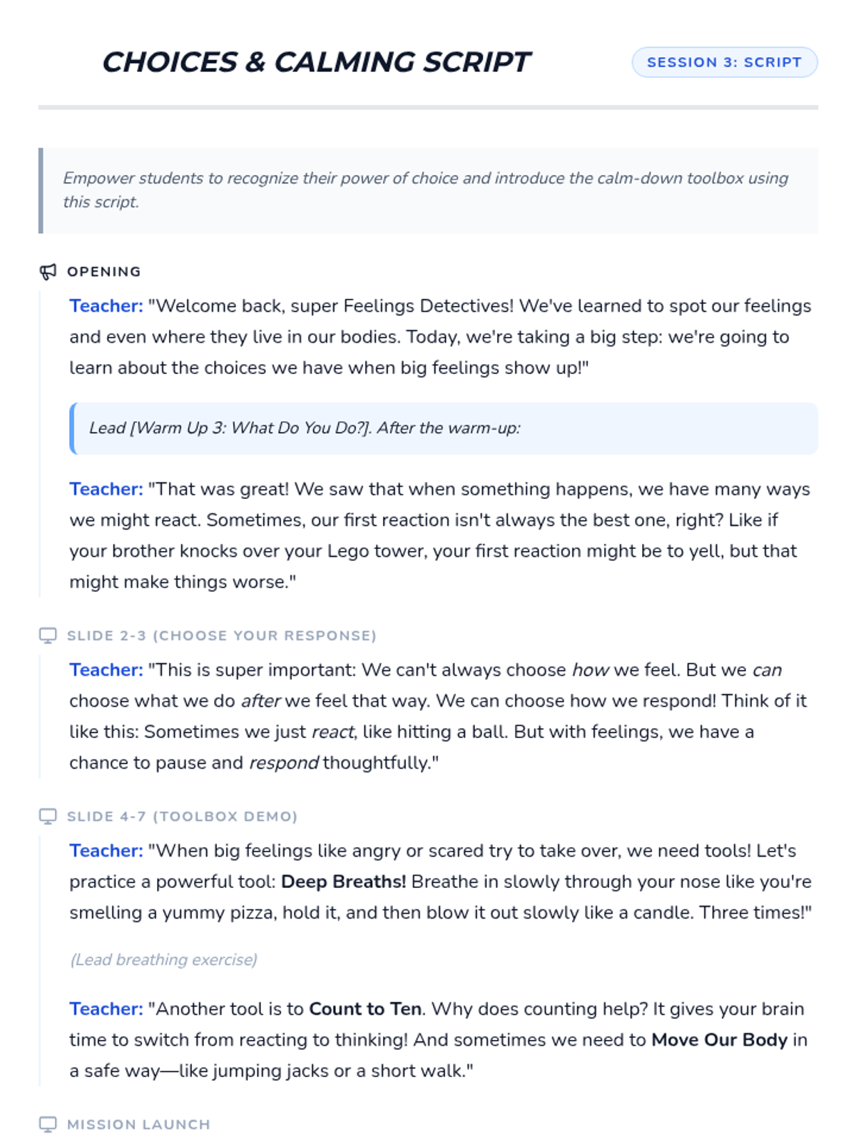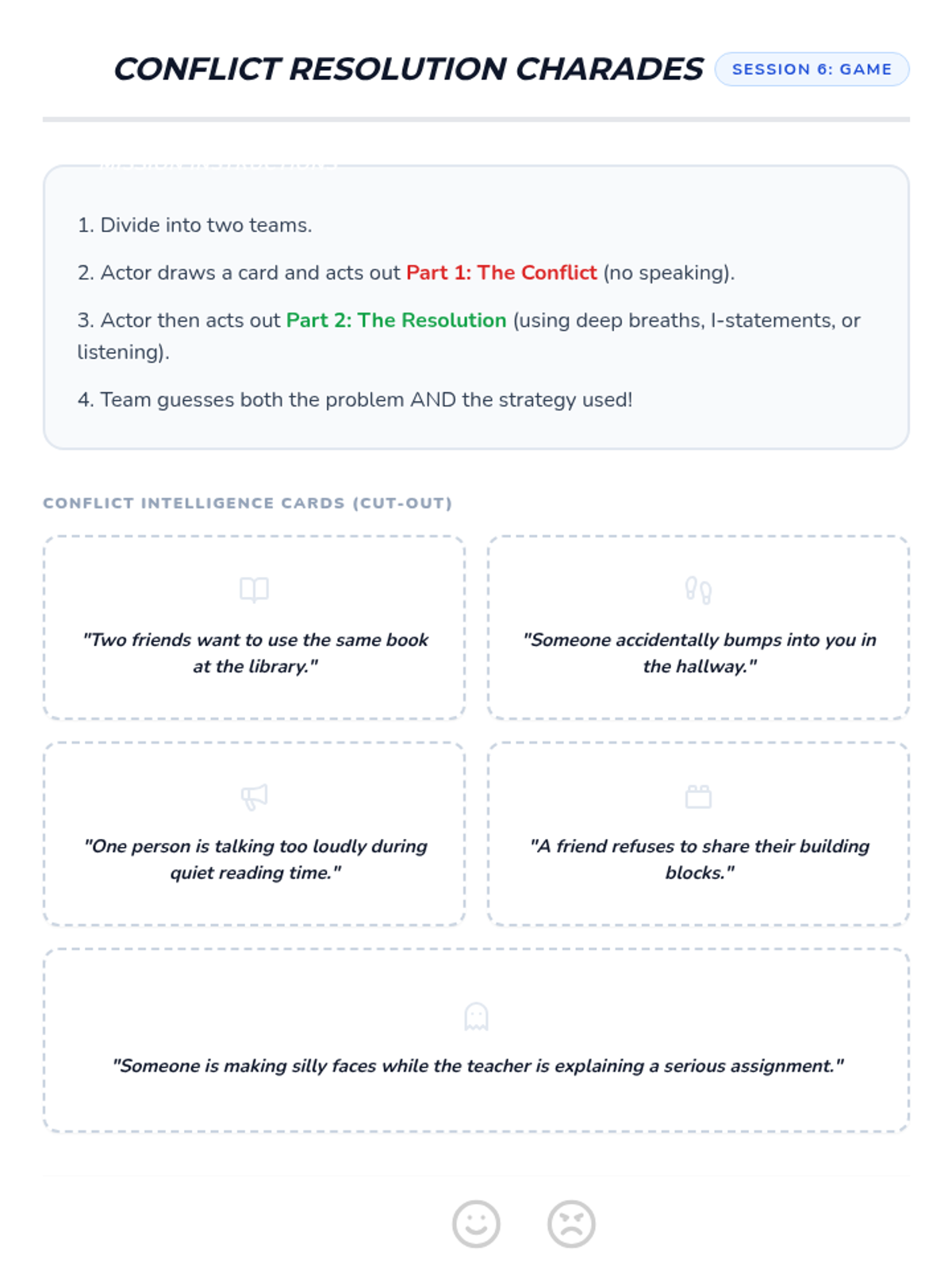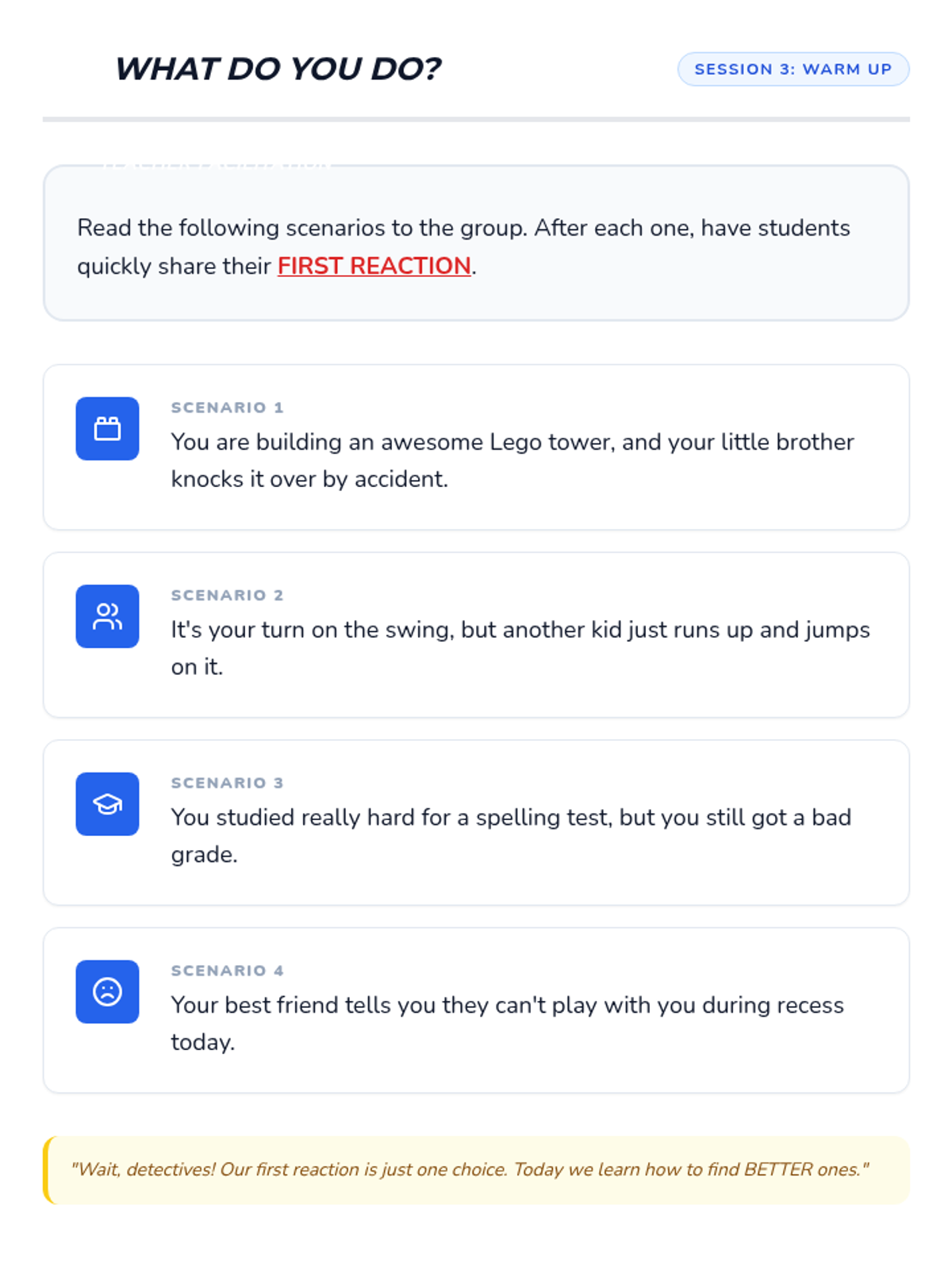 A six-session social-emotional learning program for 2nd and 3rd-grade boys focused on identifying emotions, physical regulation, and peaceful conflict resolution through a fun 'Feelings Detectives' theme.