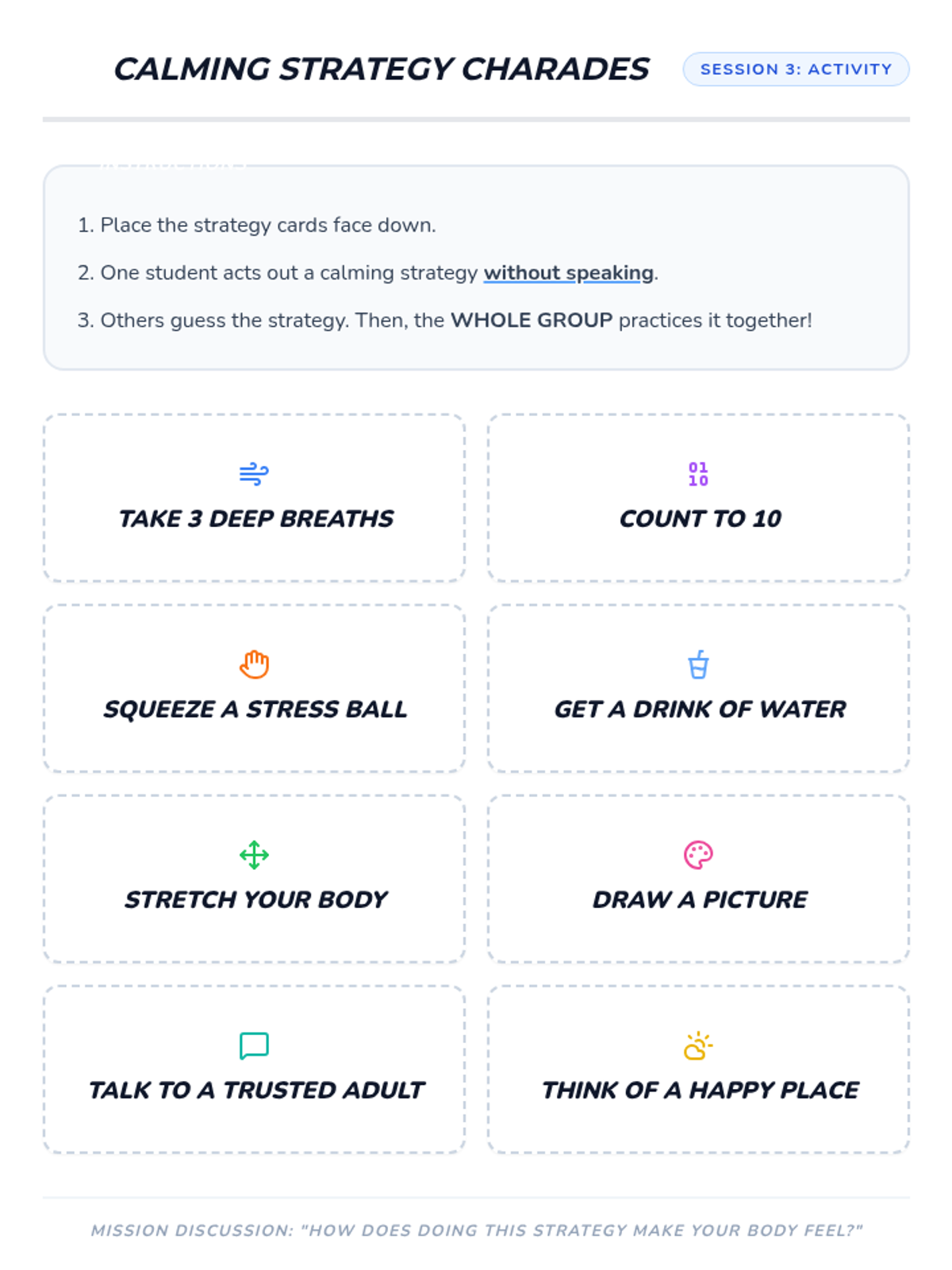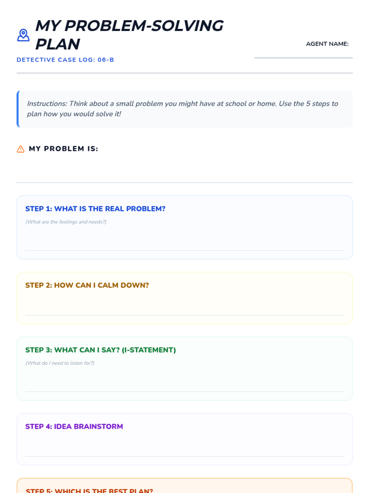 An intensive, Tier 3 individual intervention program designed to help students master self-regulation and problem-solving through a 'Calm Construction' theme. The sequence provides structured, visual tools for identifying anger triggers, implementing cooling strategies, and applying logical problem-solving frameworks.