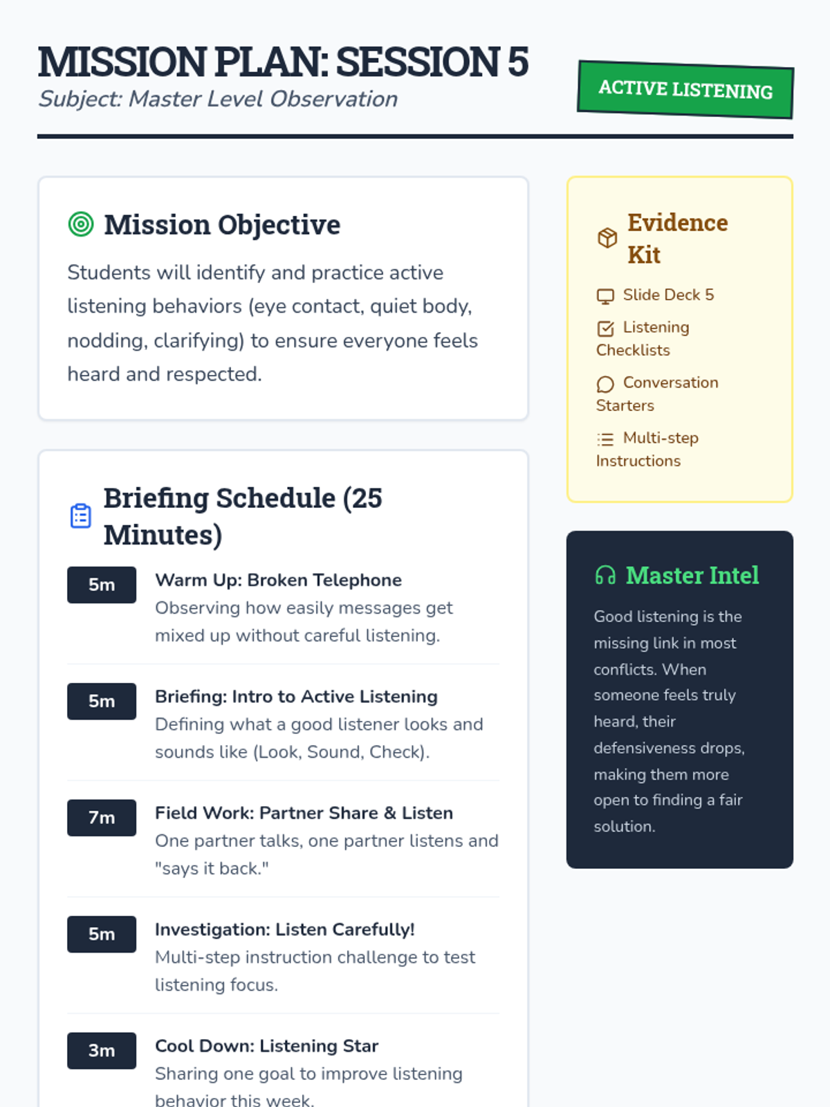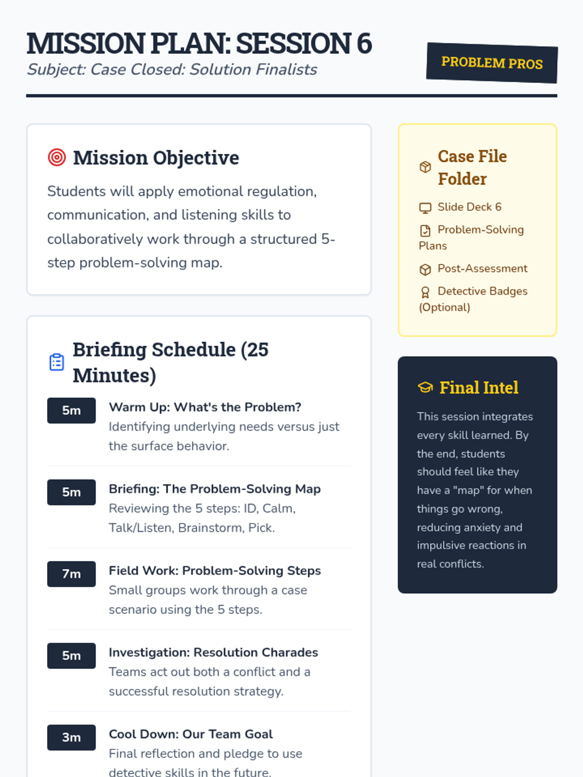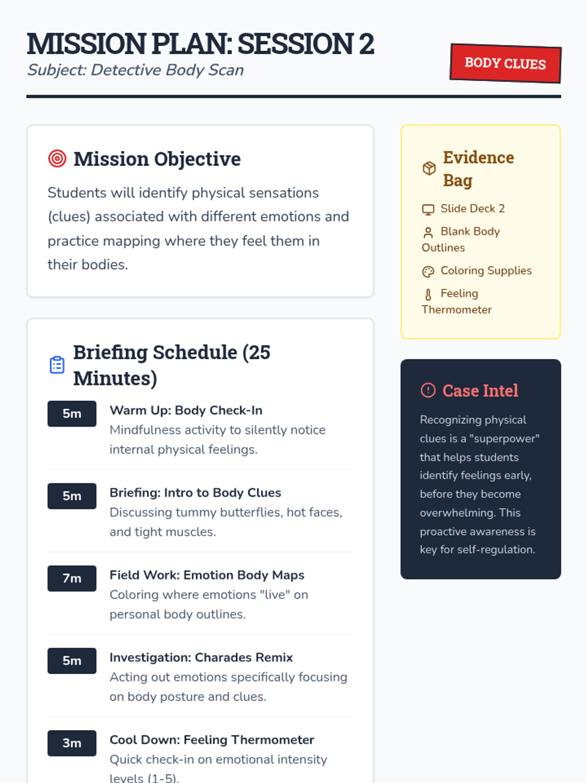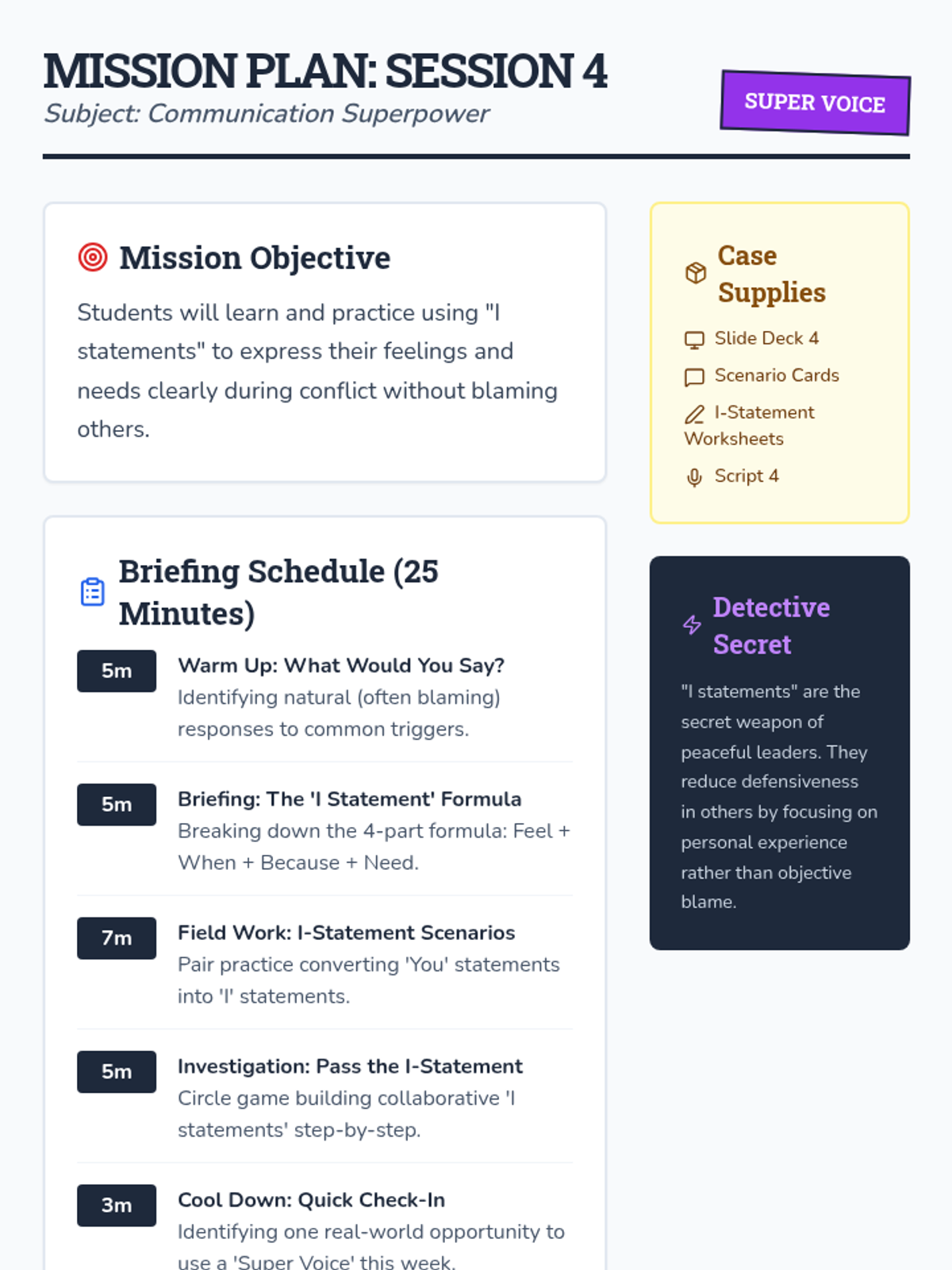 A six-session social-emotional learning program designed for 2nd and 3rd-grade boys. This sequence uses a 'detective' theme to teach emotion identification, body awareness, calming strategies, 'I statements', active listening, and collaborative problem-solving.