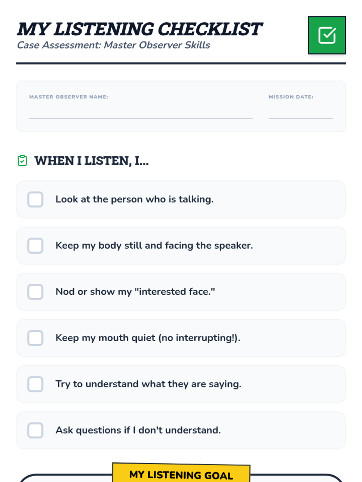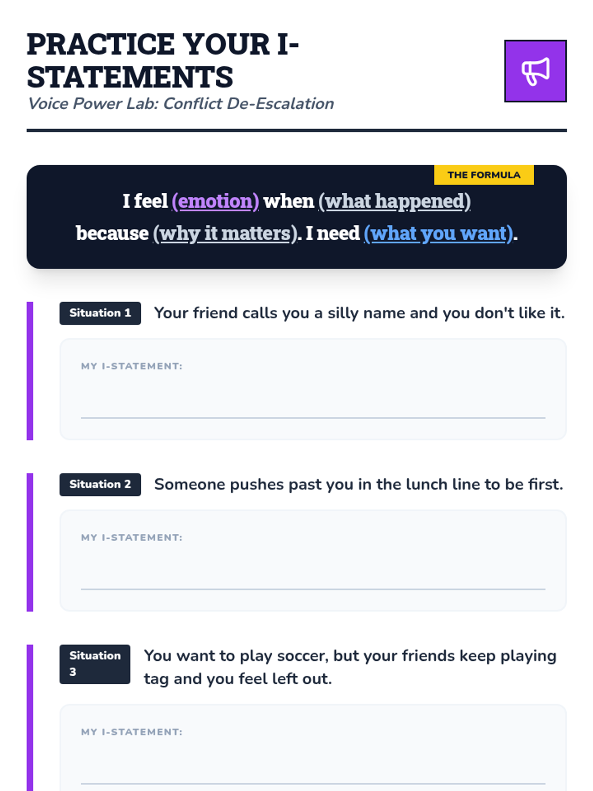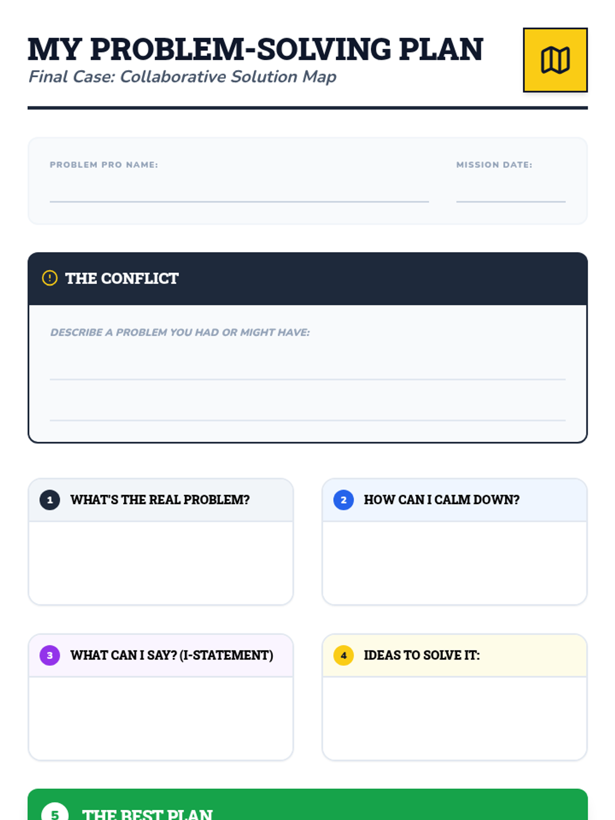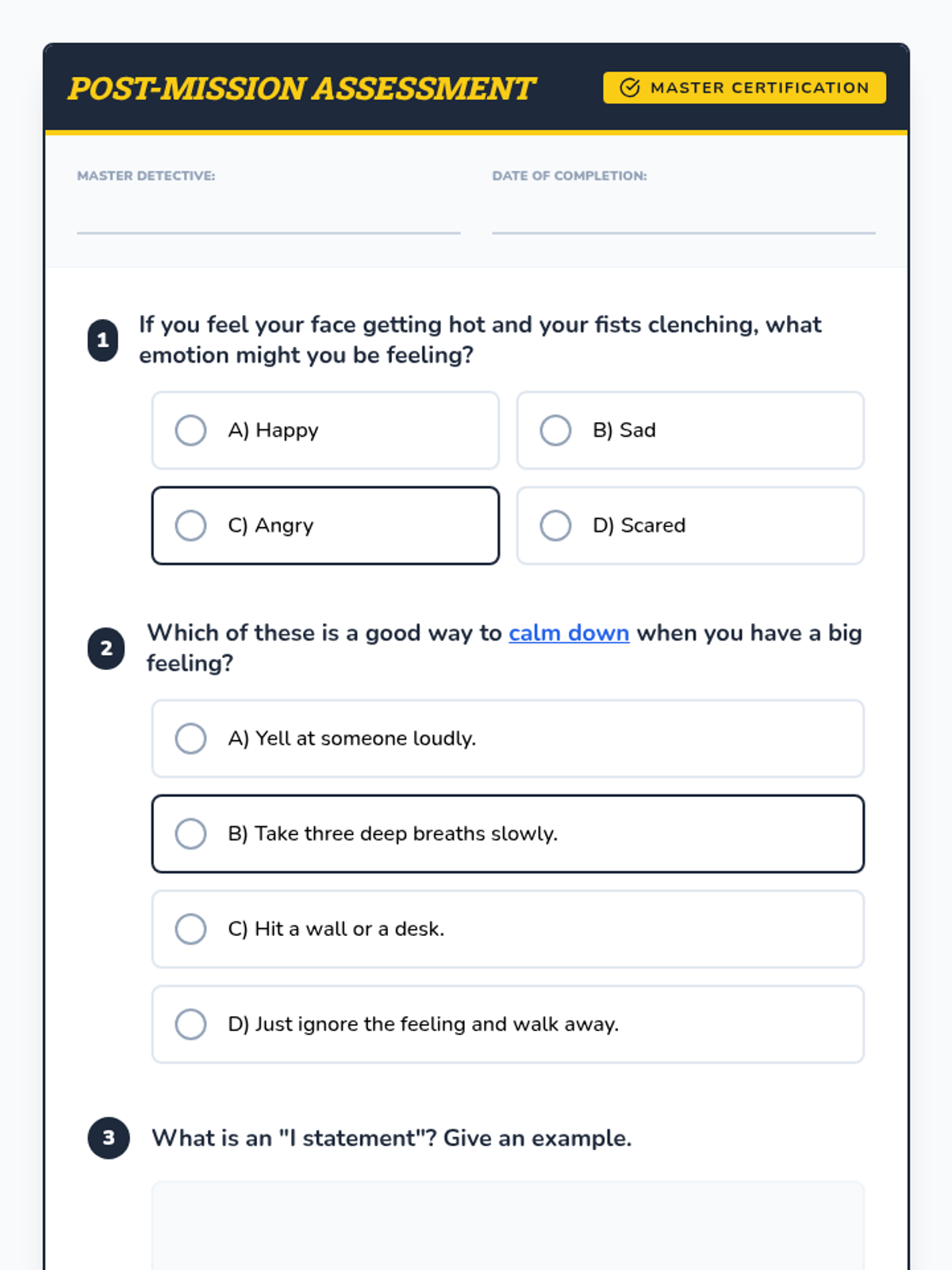 A six-session social-emotional learning program designed for 2nd and 3rd-grade boys. This sequence uses a 'detective' theme to teach emotion identification, body awareness, calming strategies, 'I statements', active listening, and collaborative problem-solving.