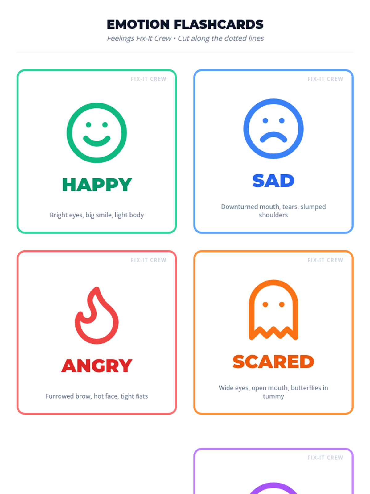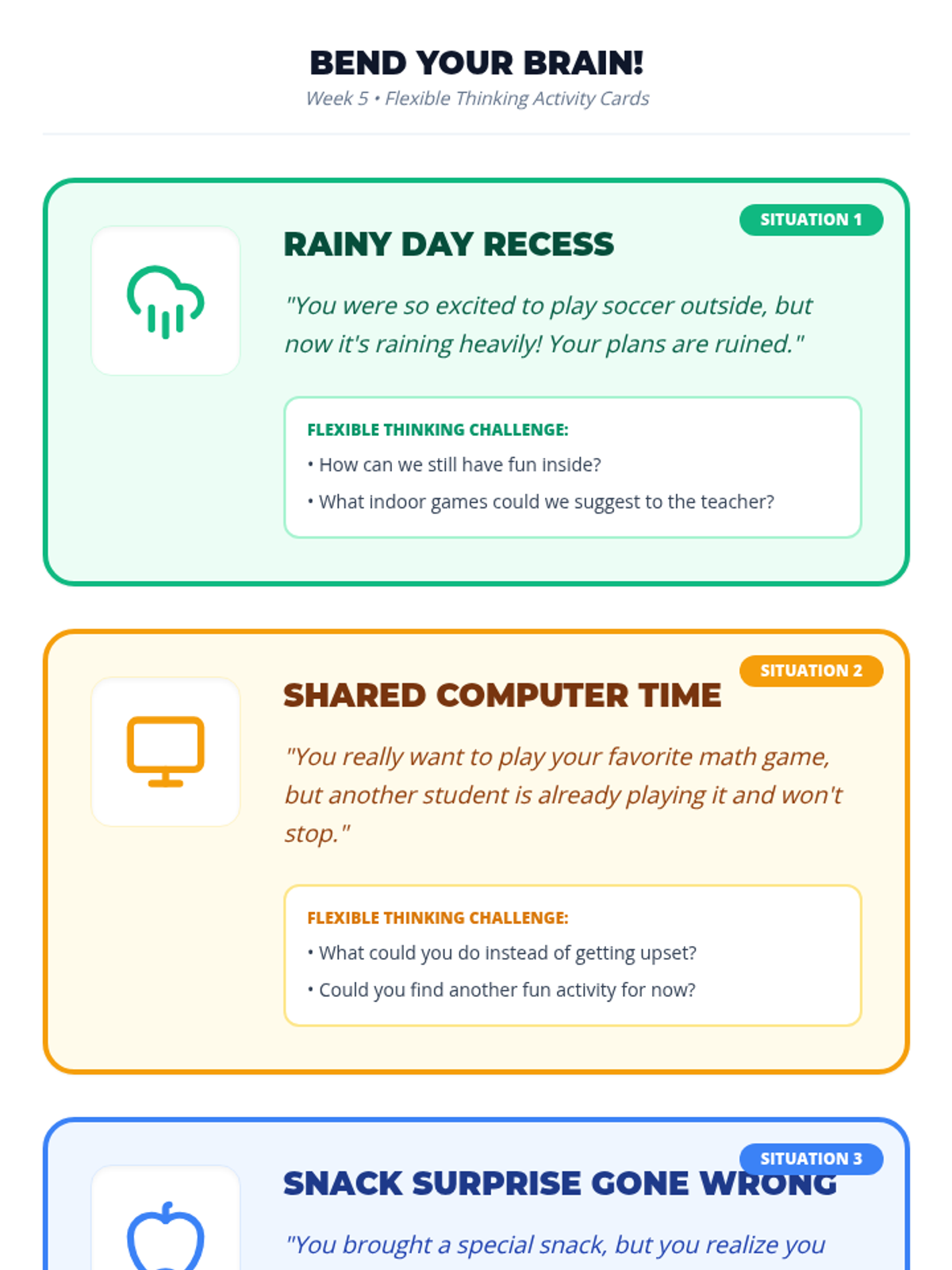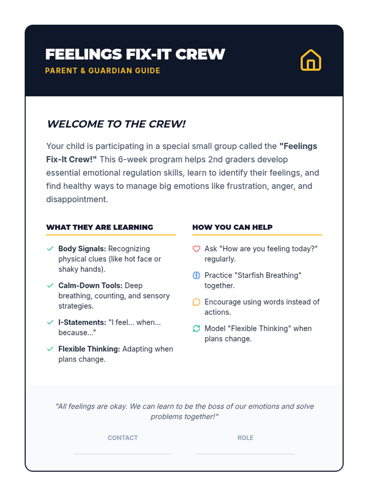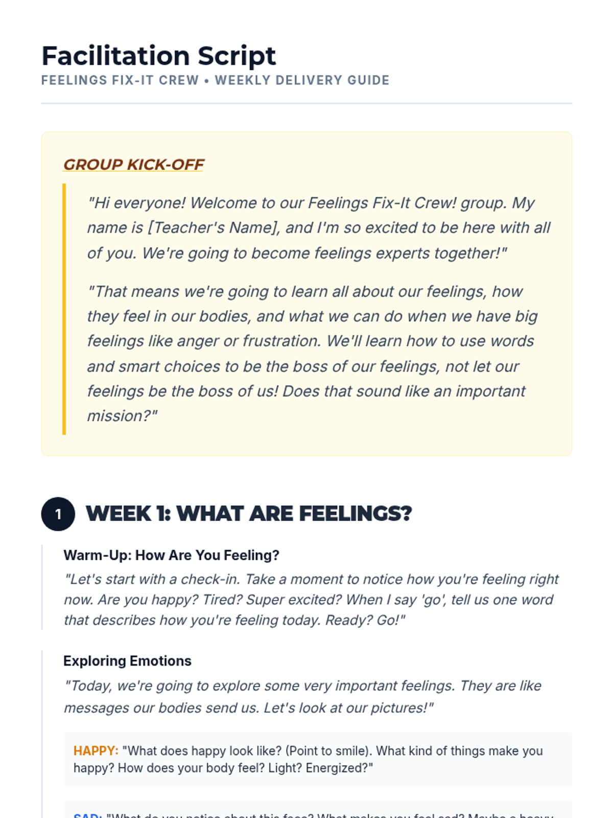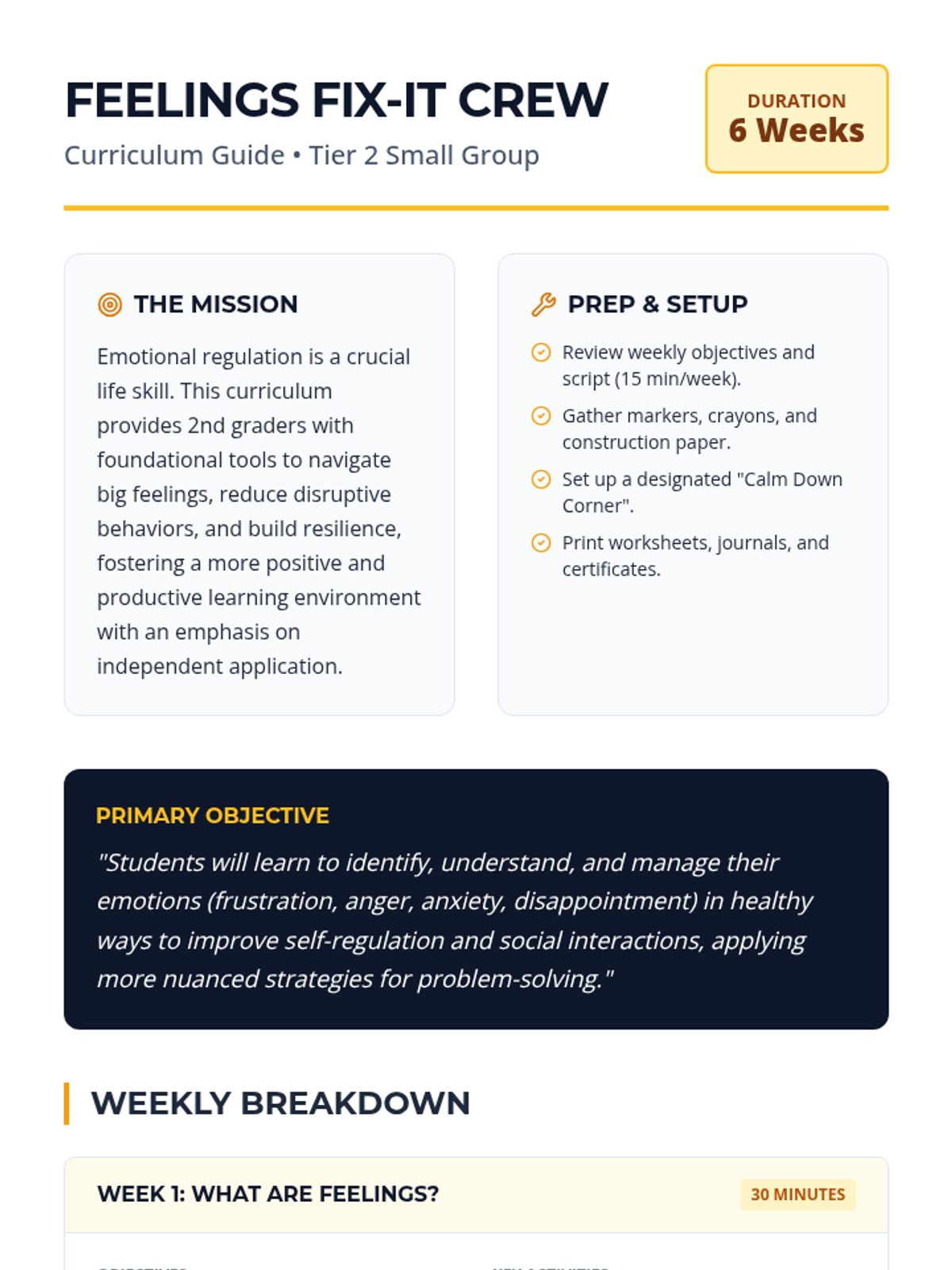 A comprehensive 6-week Tier 2 social-emotional learning curriculum for 2nd graders, focusing on emotional identification, body signals, calming strategies, assertive communication, and flexible thinking.