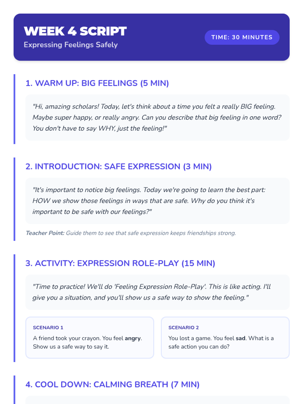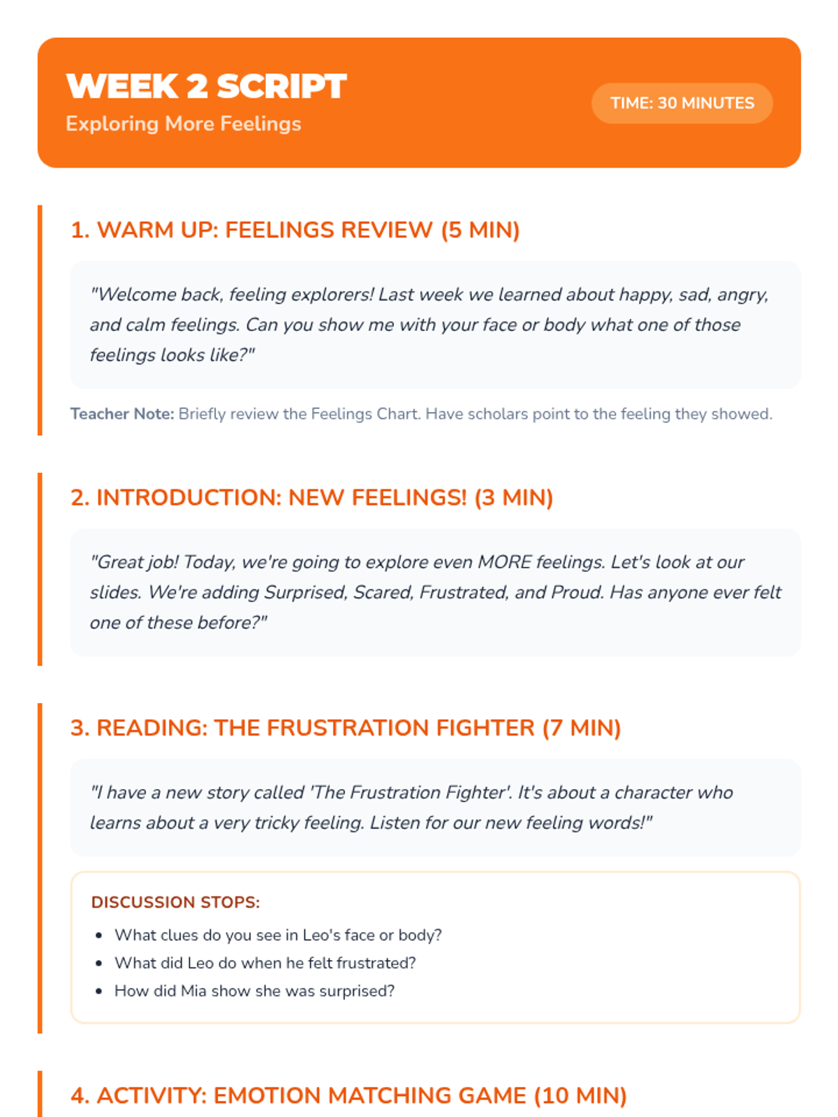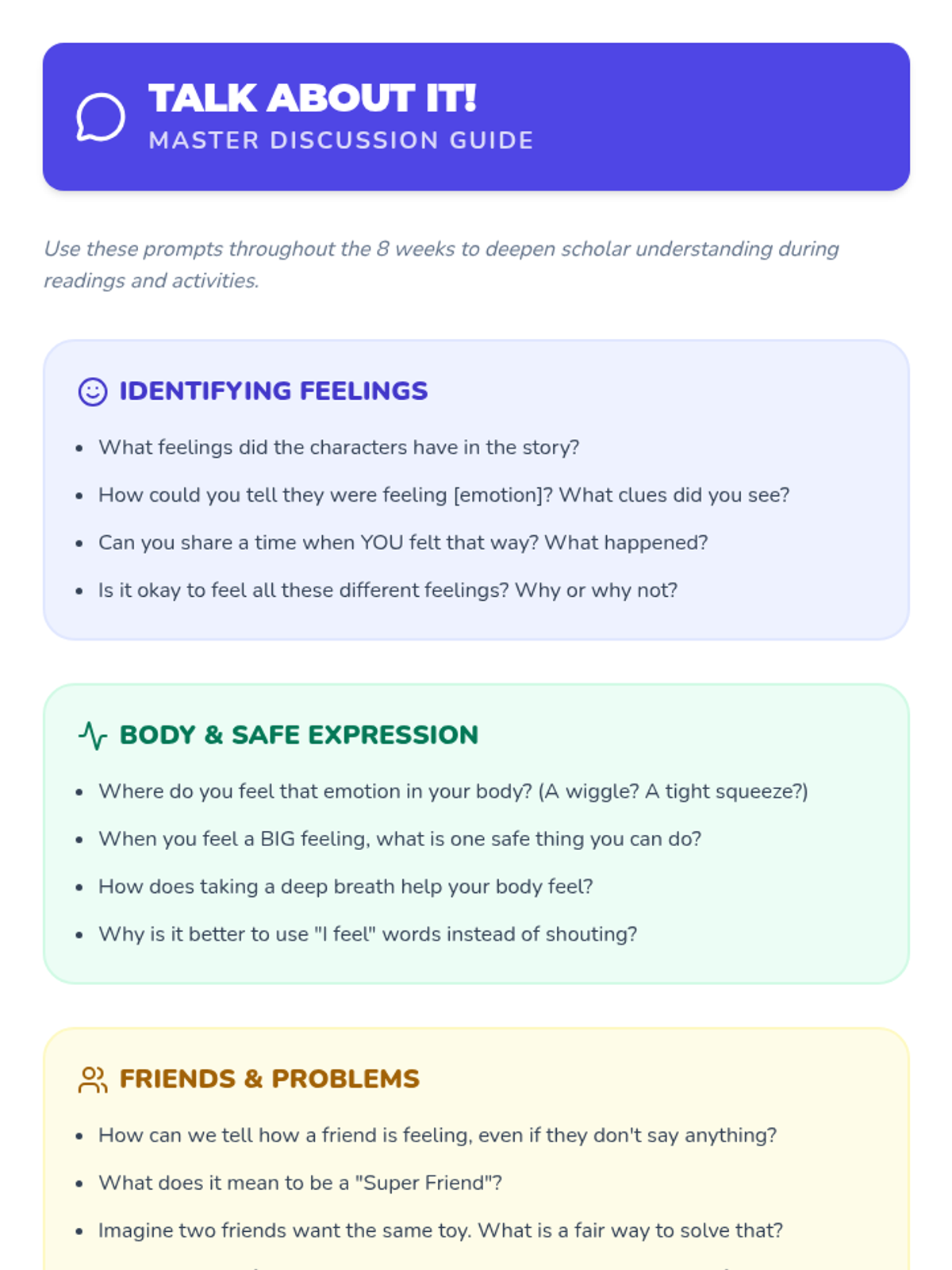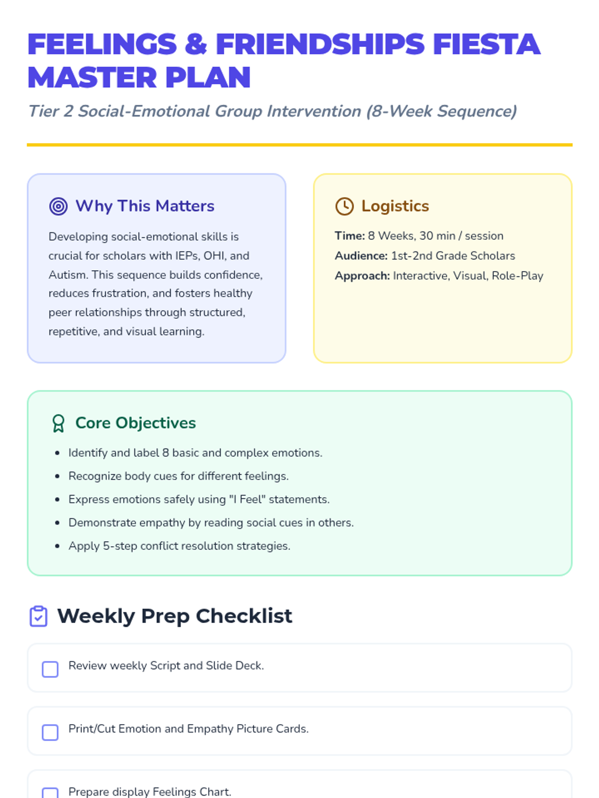 An 8-week Tier 2 small group social-emotional learning sequence for 1st and 2nd grade scholars focusing on identifying emotions, safe expression, empathy, and conflict resolution.