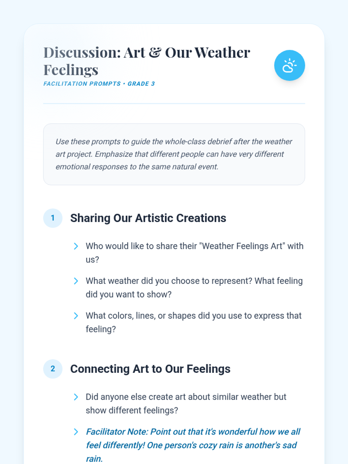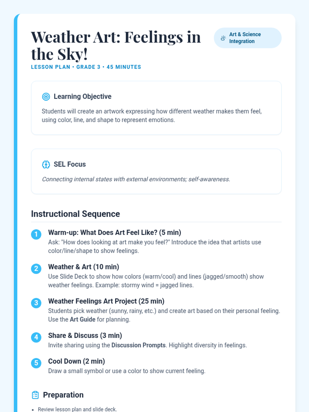 A multi-disciplinary Social-Emotional Learning curriculum integrating emotional literacy with core subjects including Social Studies, Art, Science, PE, and Music for grades K-6. Students explore perspectives, express emotions through various media, and develop self-awareness through hands-on activities.