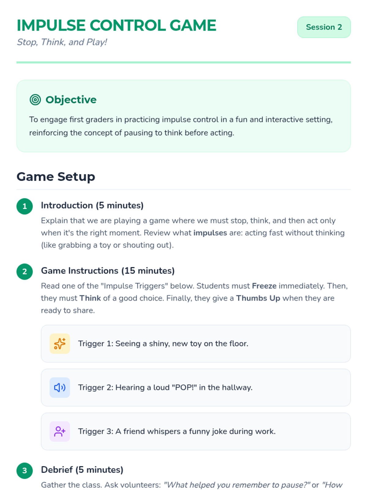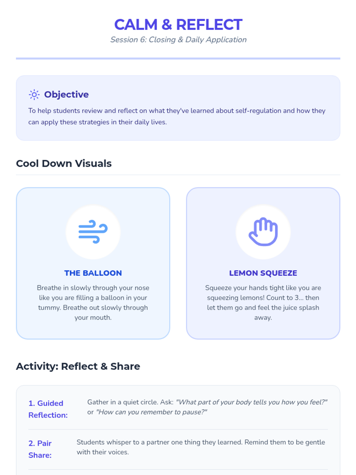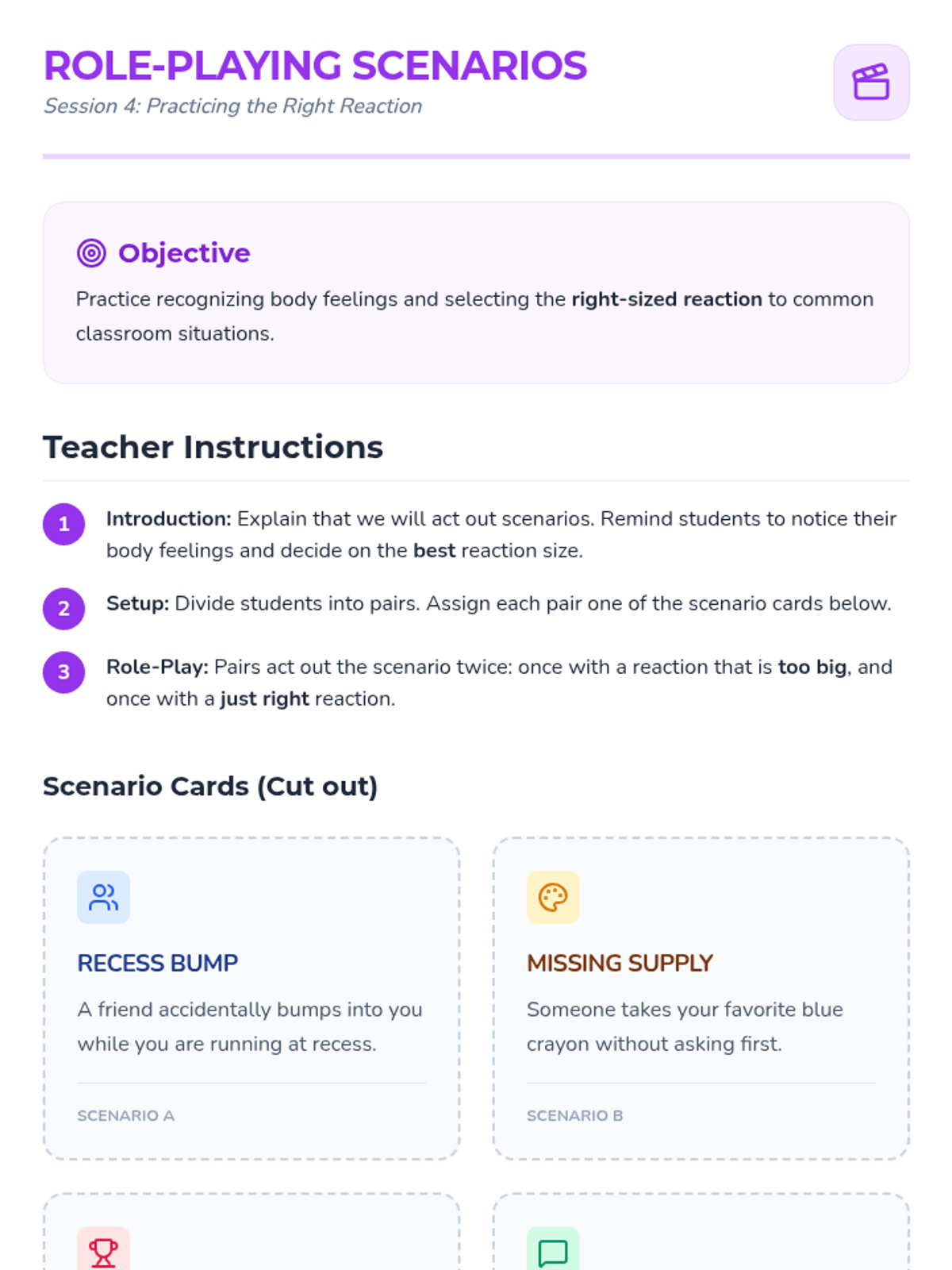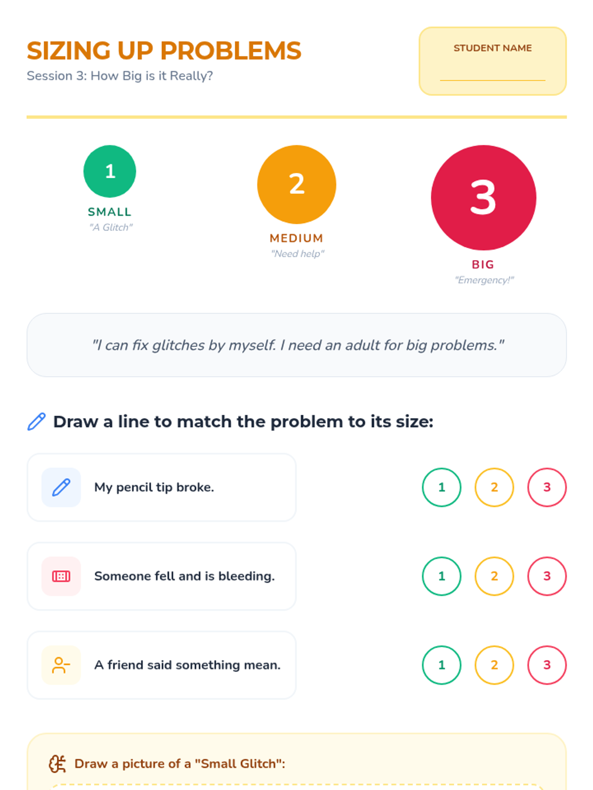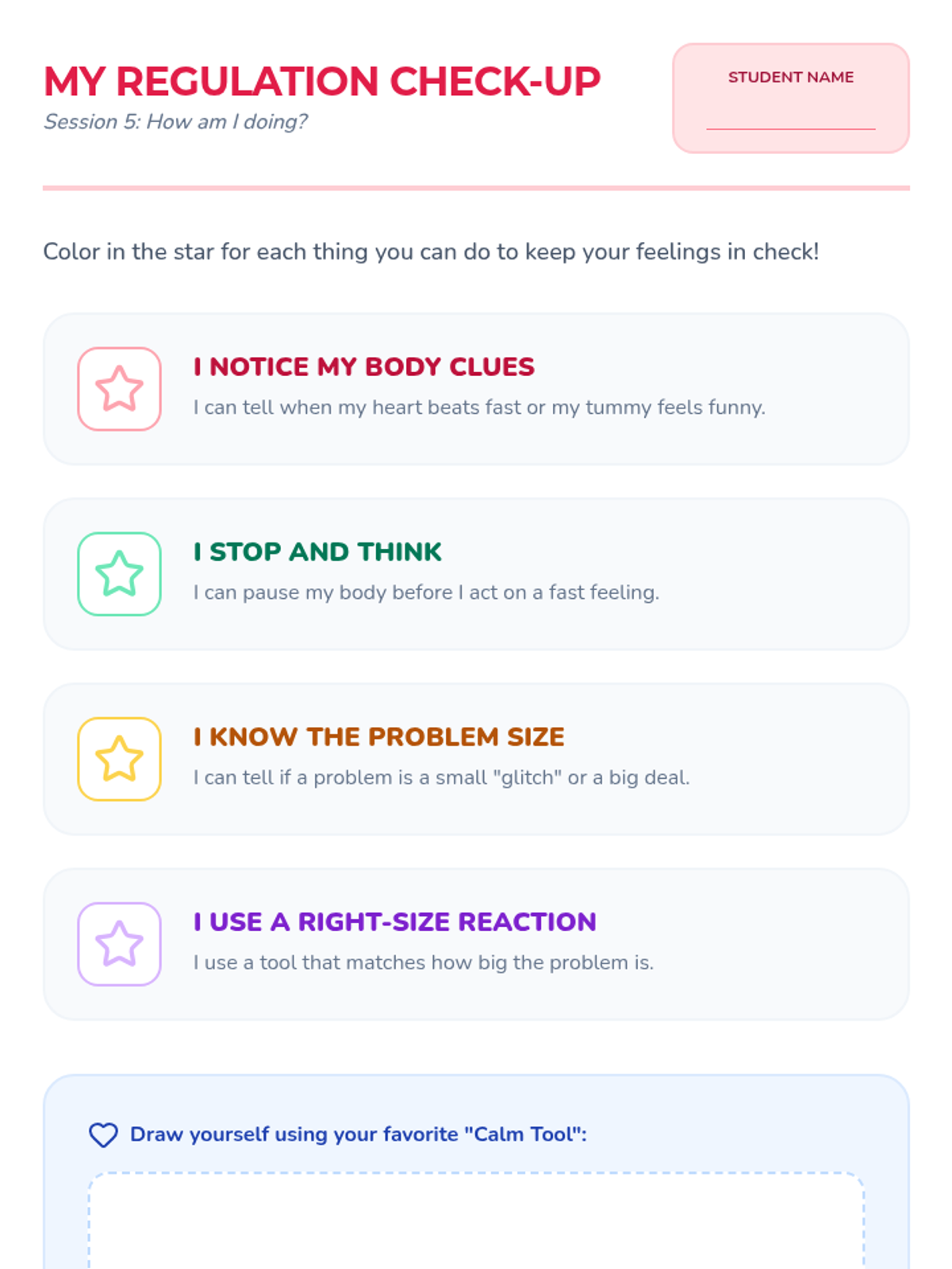 A 6-session series for first graders focusing on self-regulation, body awareness, impulse control, and matching reactions to the size of problems.