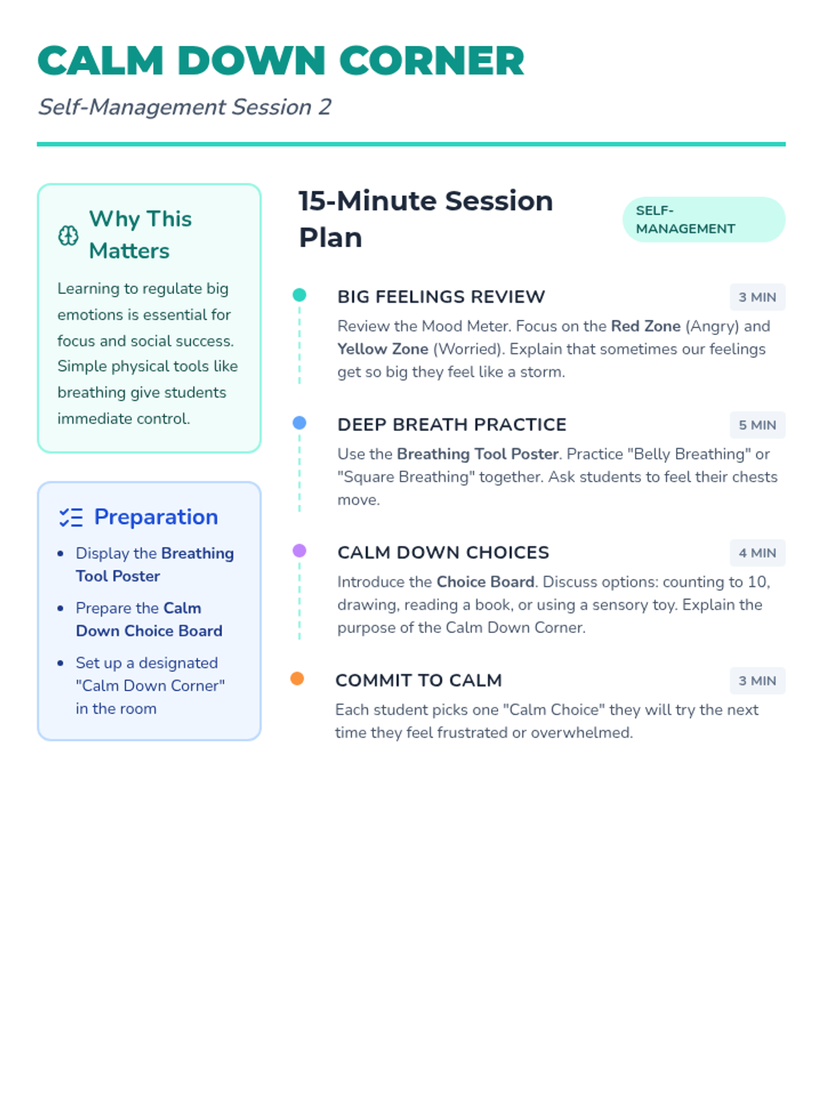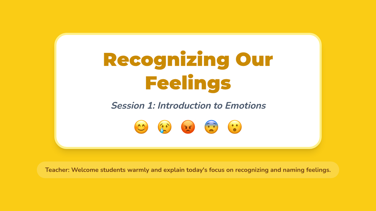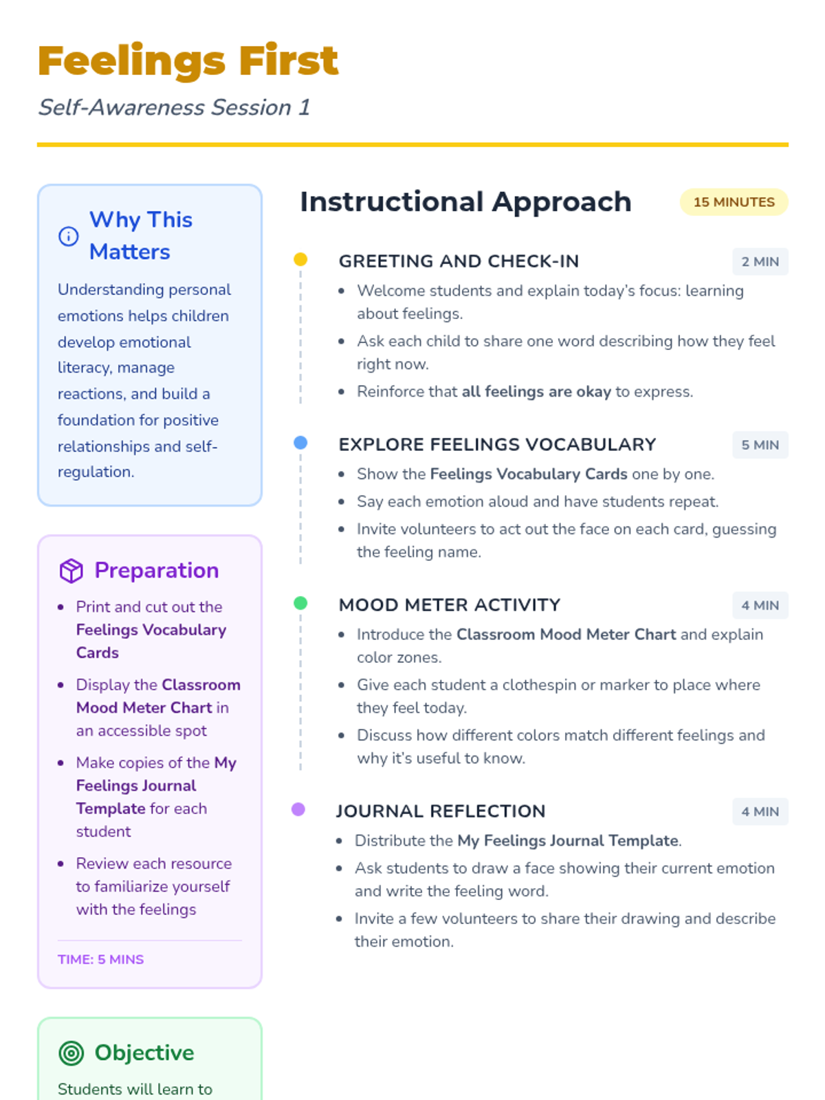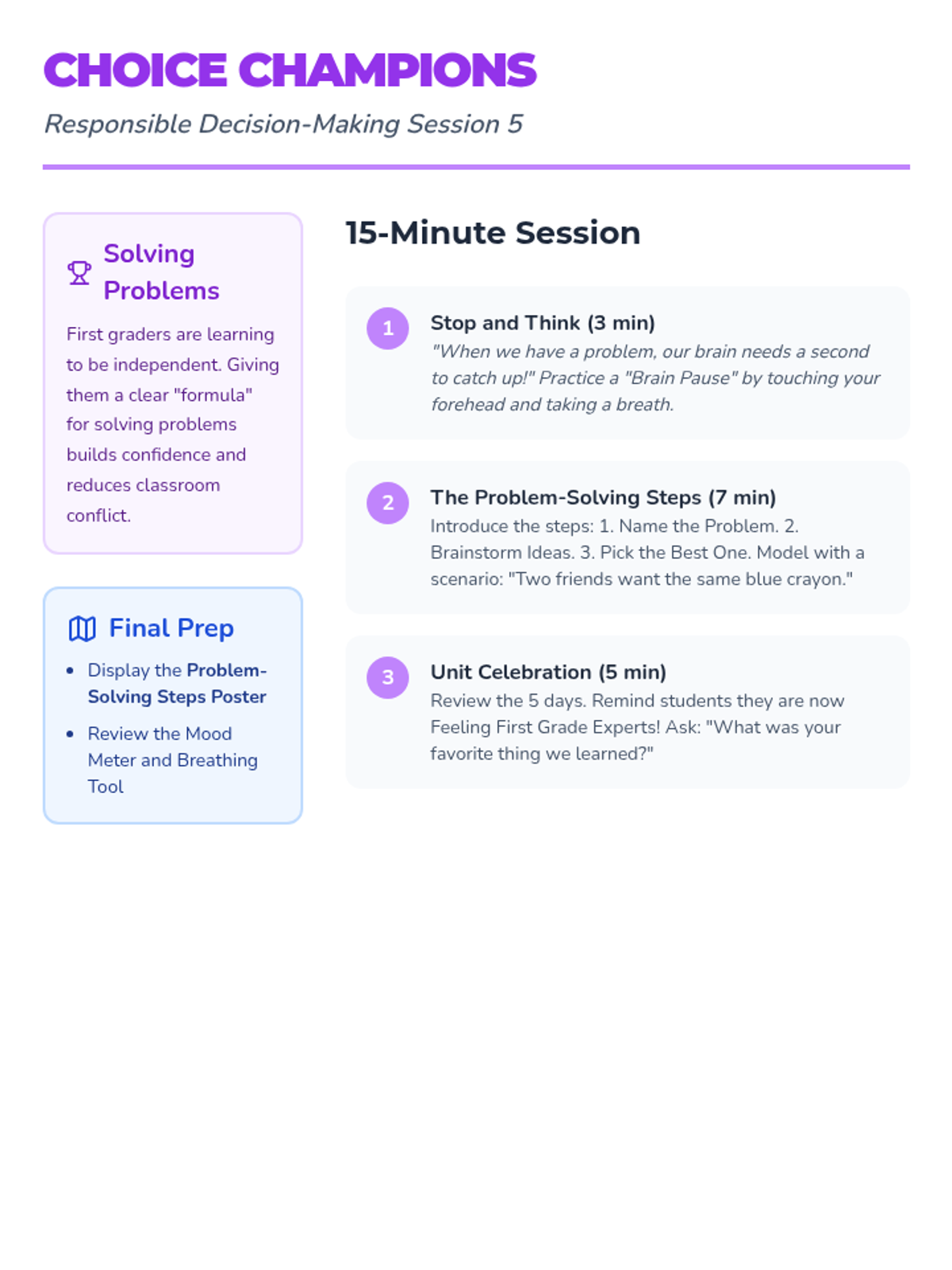 A comprehensive five-session Social-Emotional Learning unit for 1st graders. This unit covers the five core SEL competencies: self-awareness, self-management, social awareness, relationship skills, and responsible decision-making through 15-minute daily sessions.