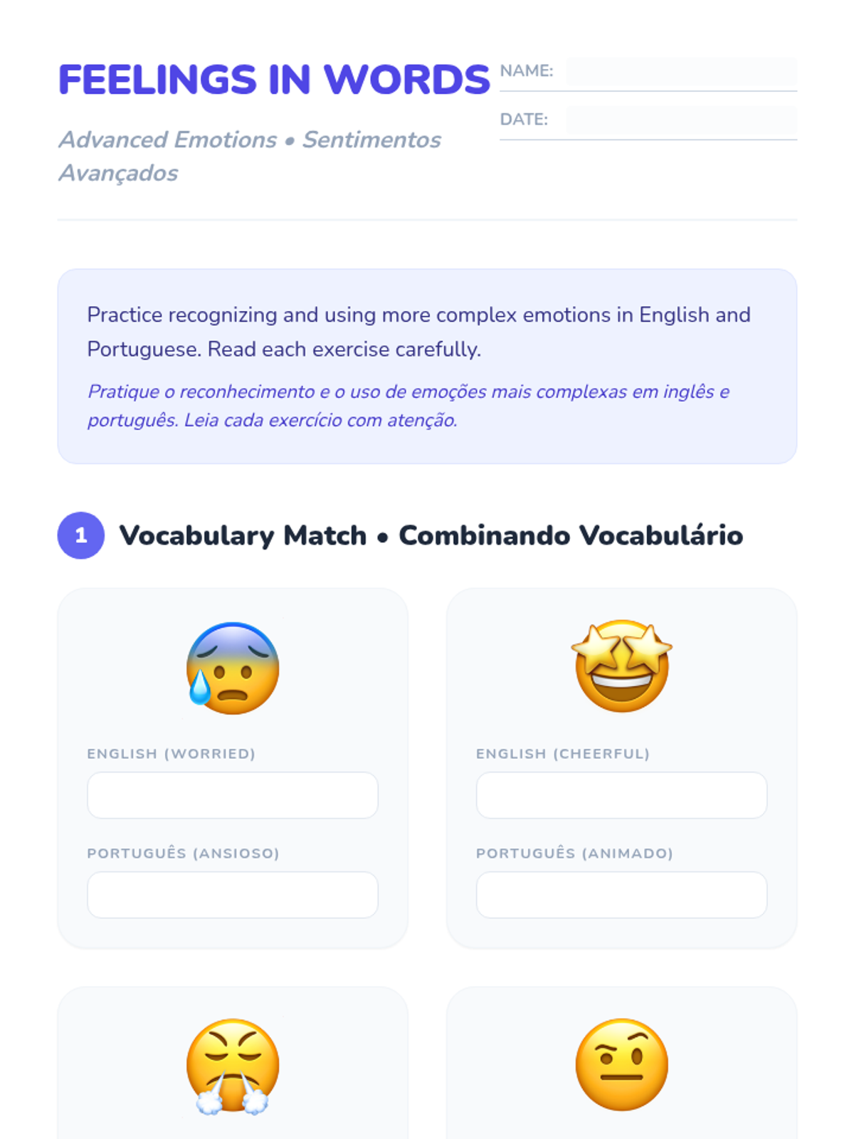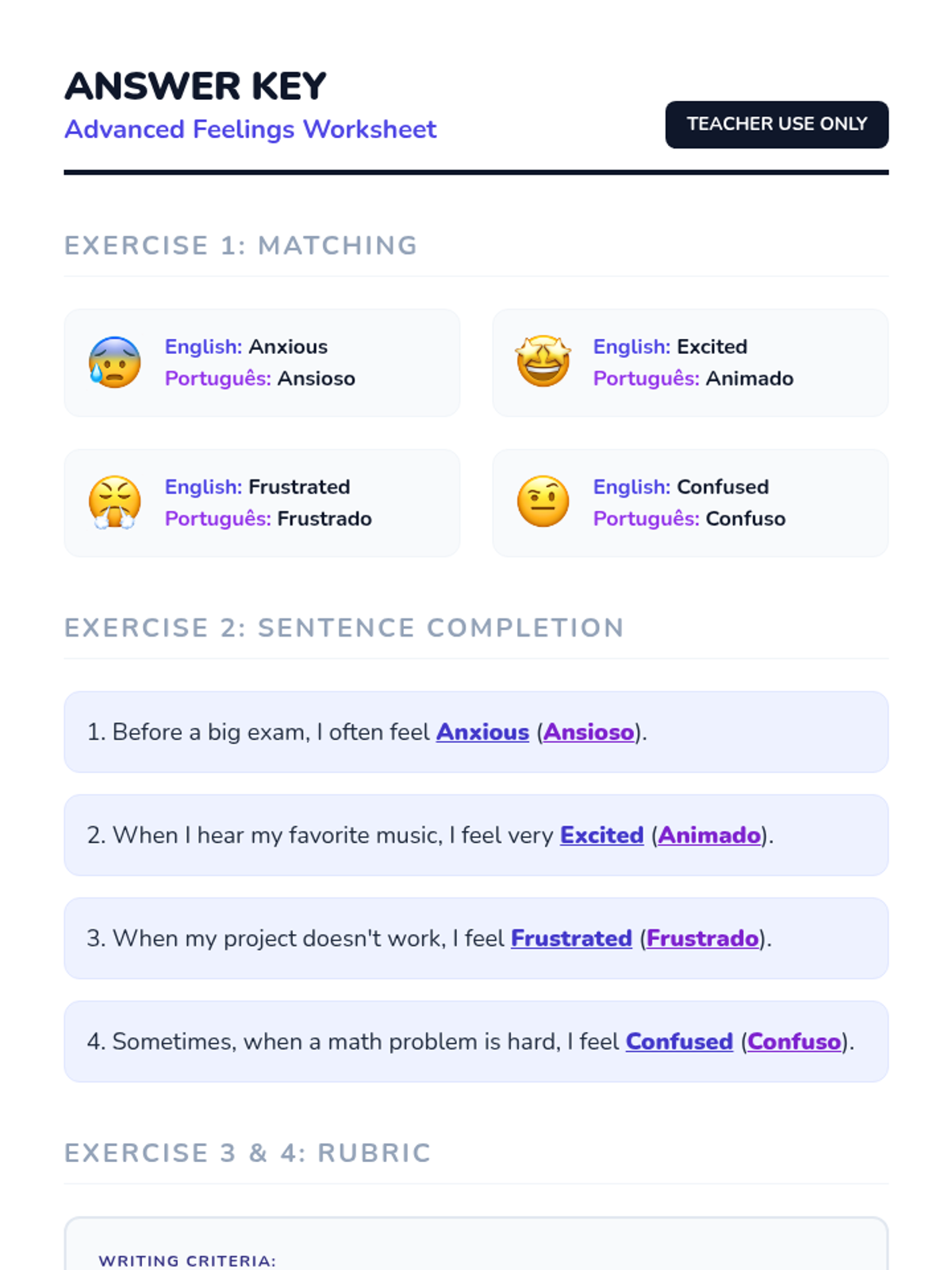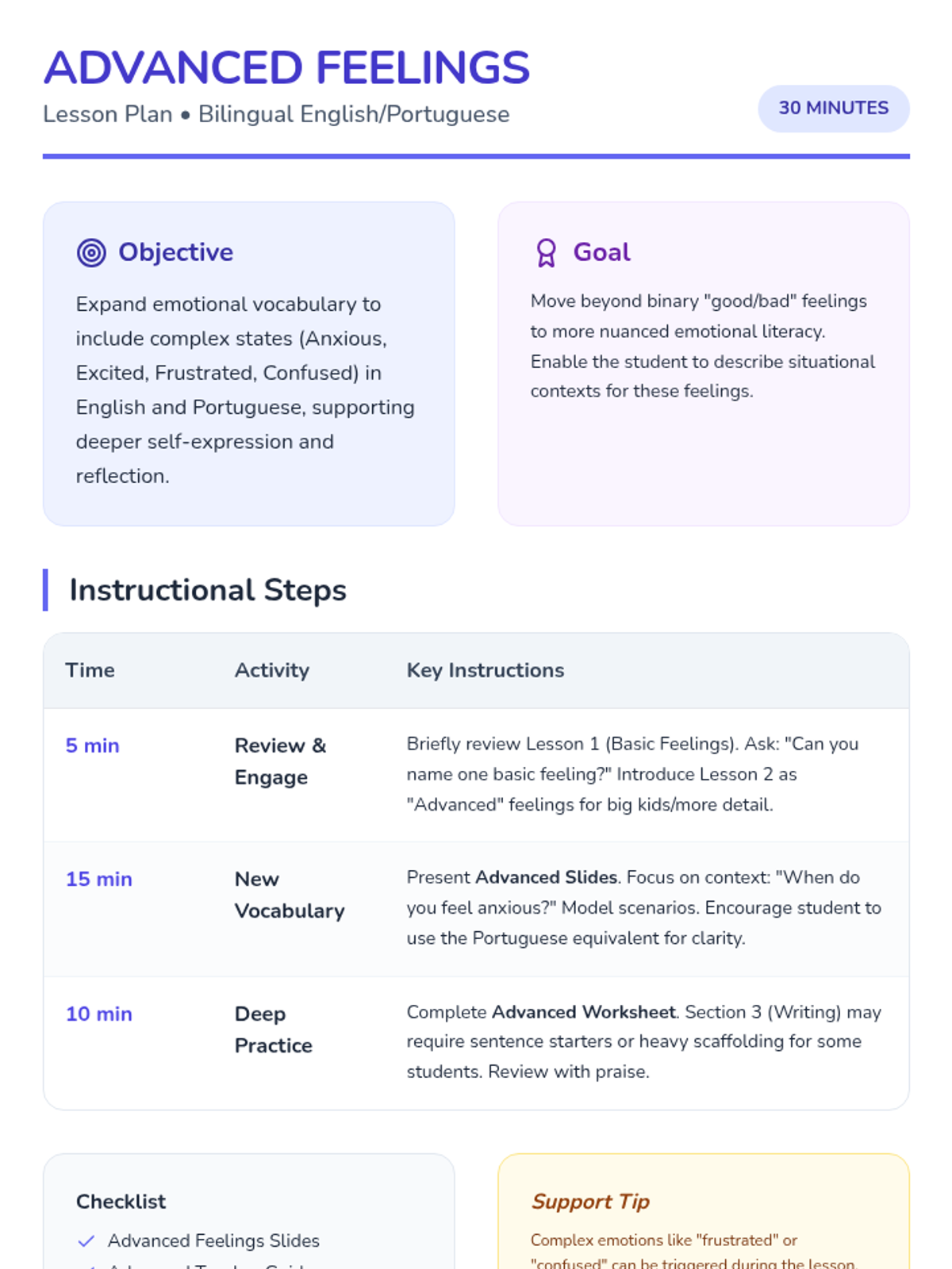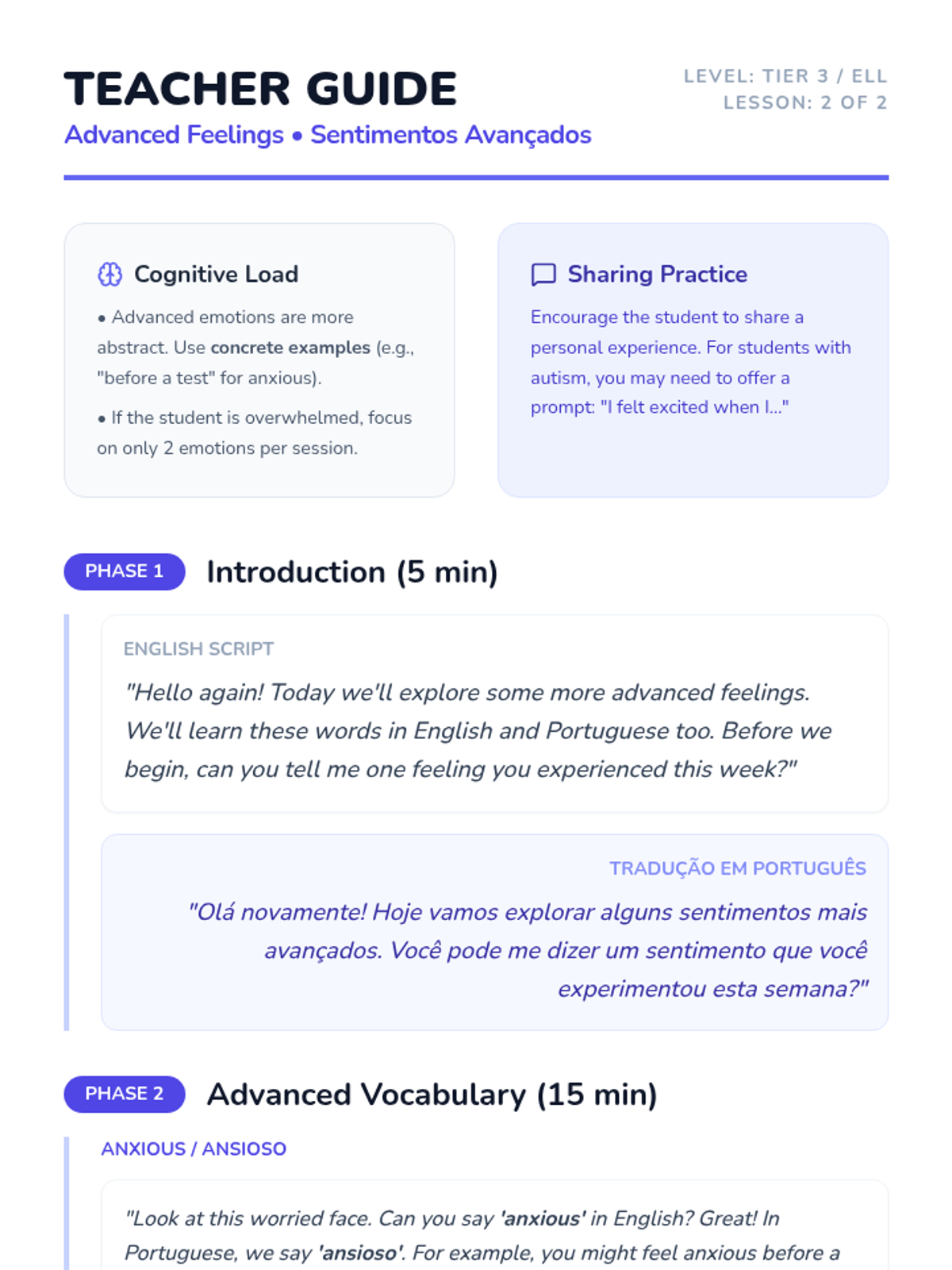 A bilingual sequence designed for ELL students with autism to develop emotional literacy in both English and Portuguese, moving from basic to complex feelings.