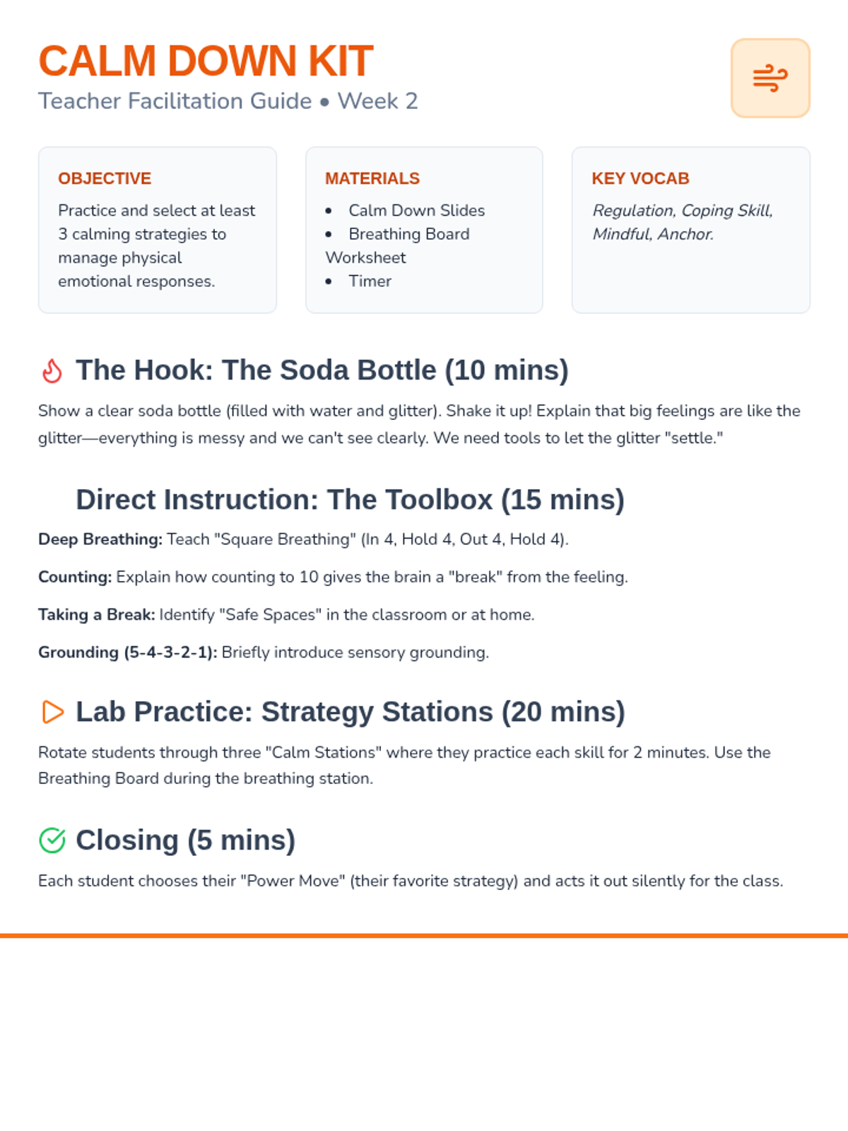 A comprehensive 3-session therapeutic sequence for 3rd grade students struggling with severe emotional dysregulation (DMDD/IED). The sequence focuses on physiological awareness, sensory-based coping strategies, and creating non-verbal safety plans for high-intensity moments.