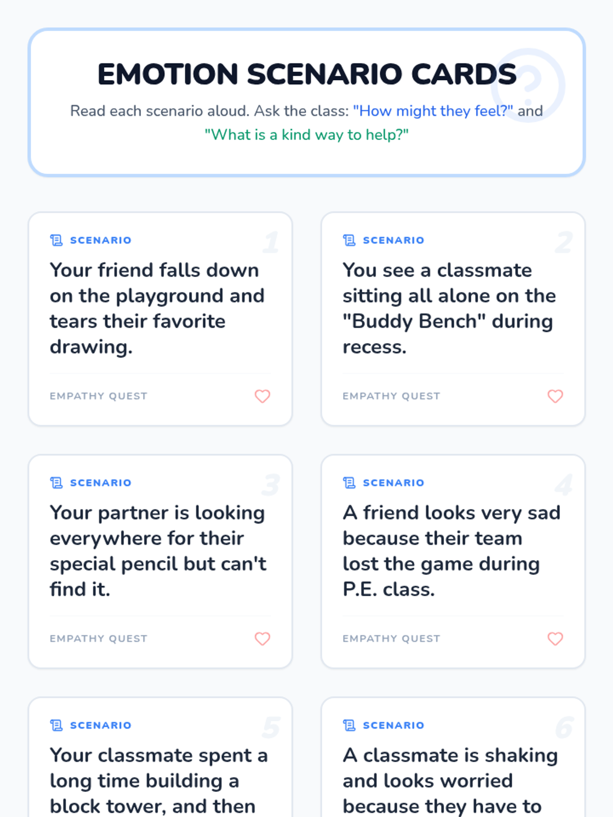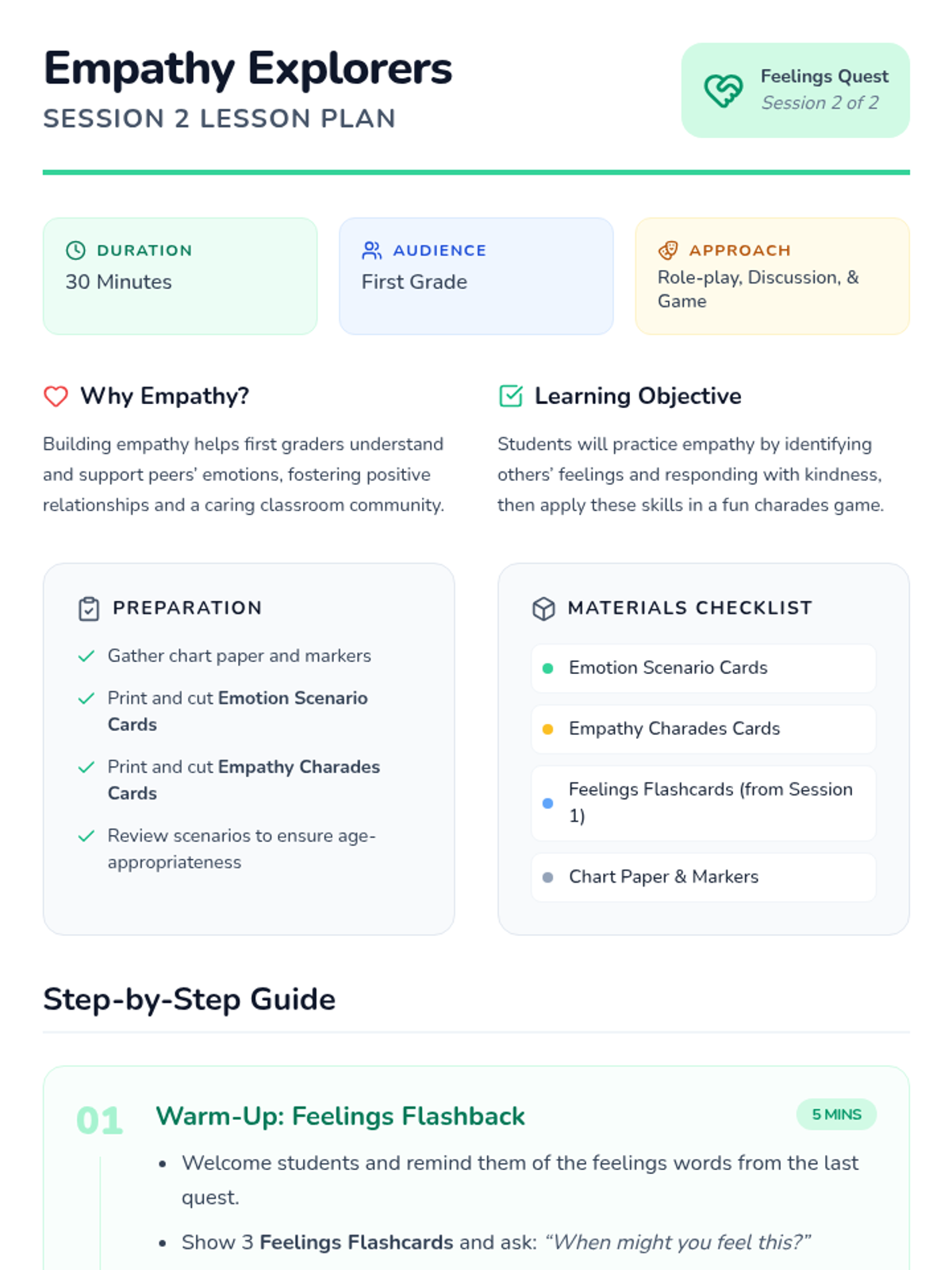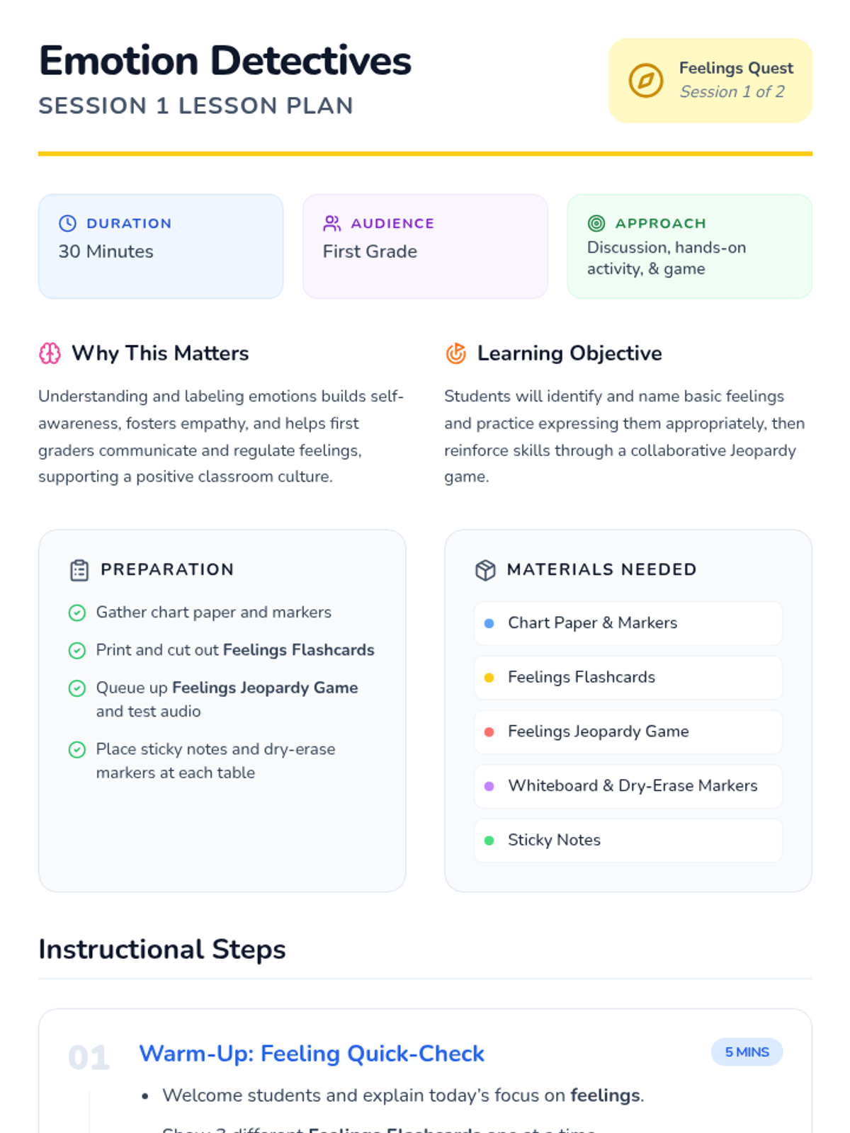 A two-session sequence for first graders to explore identifying emotions, building empathy, and learning healthy ways to express and manage feelings.