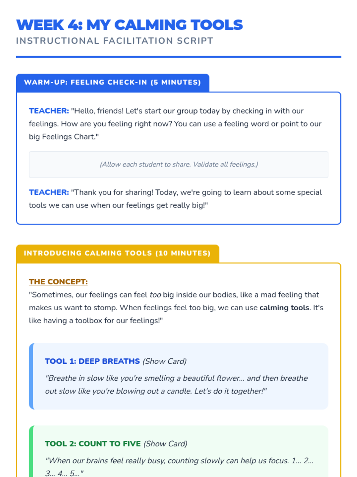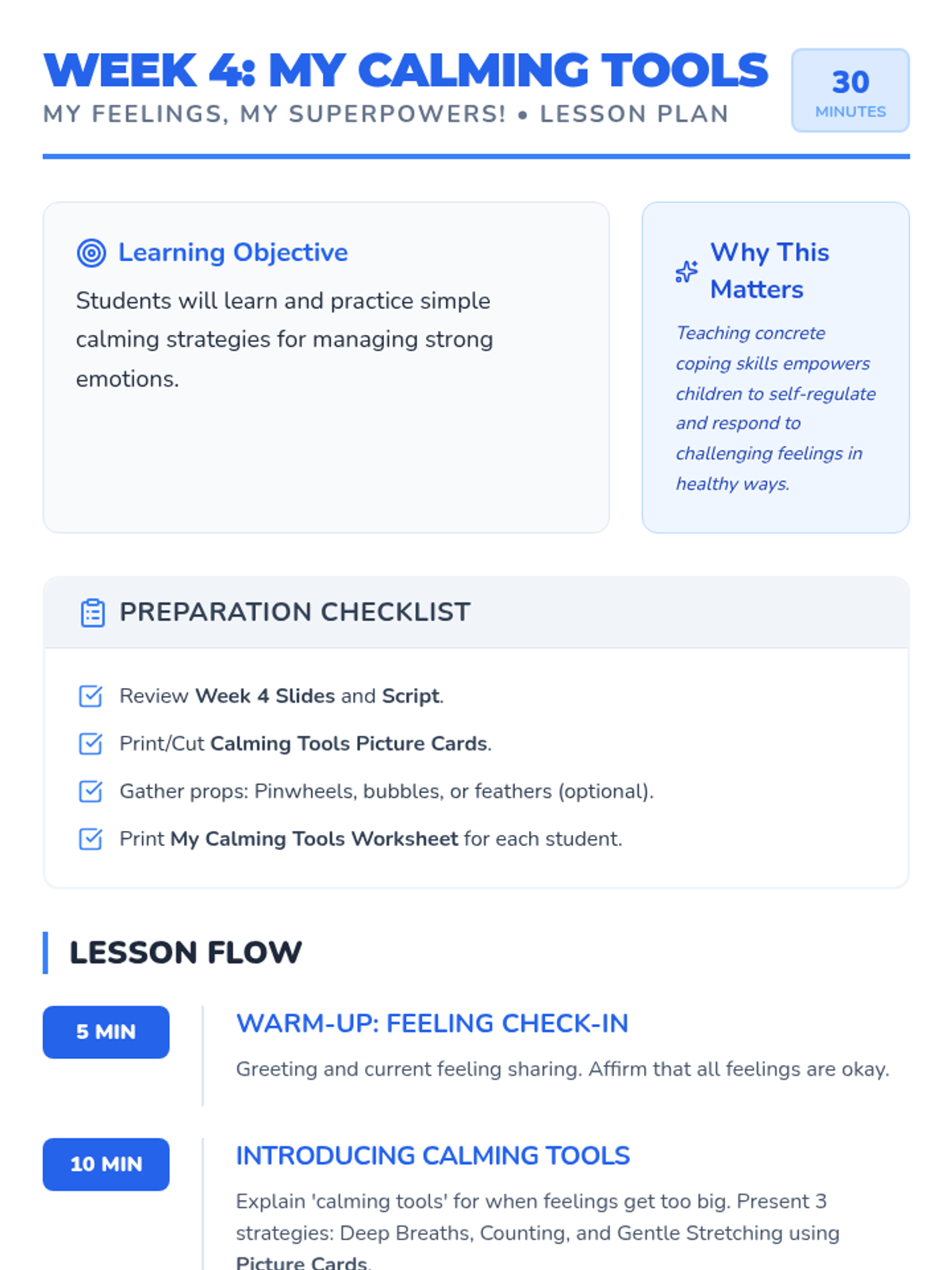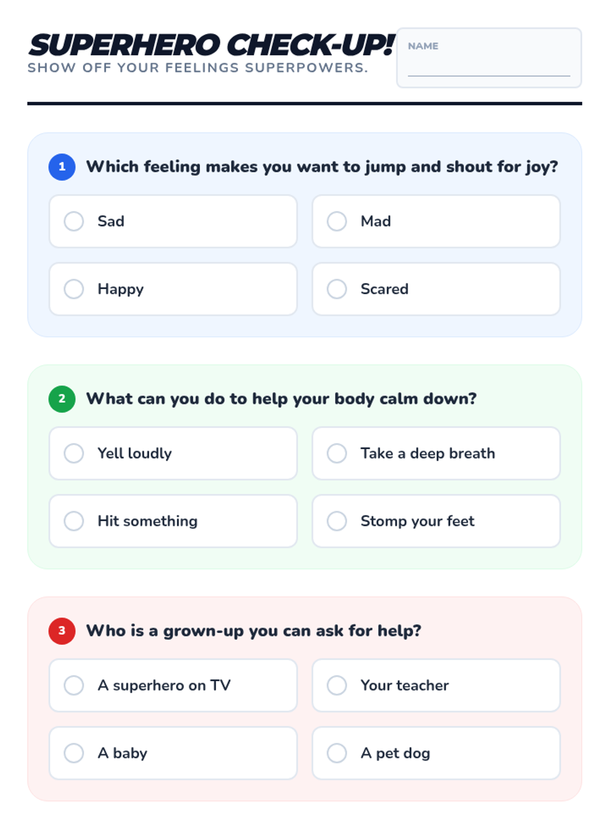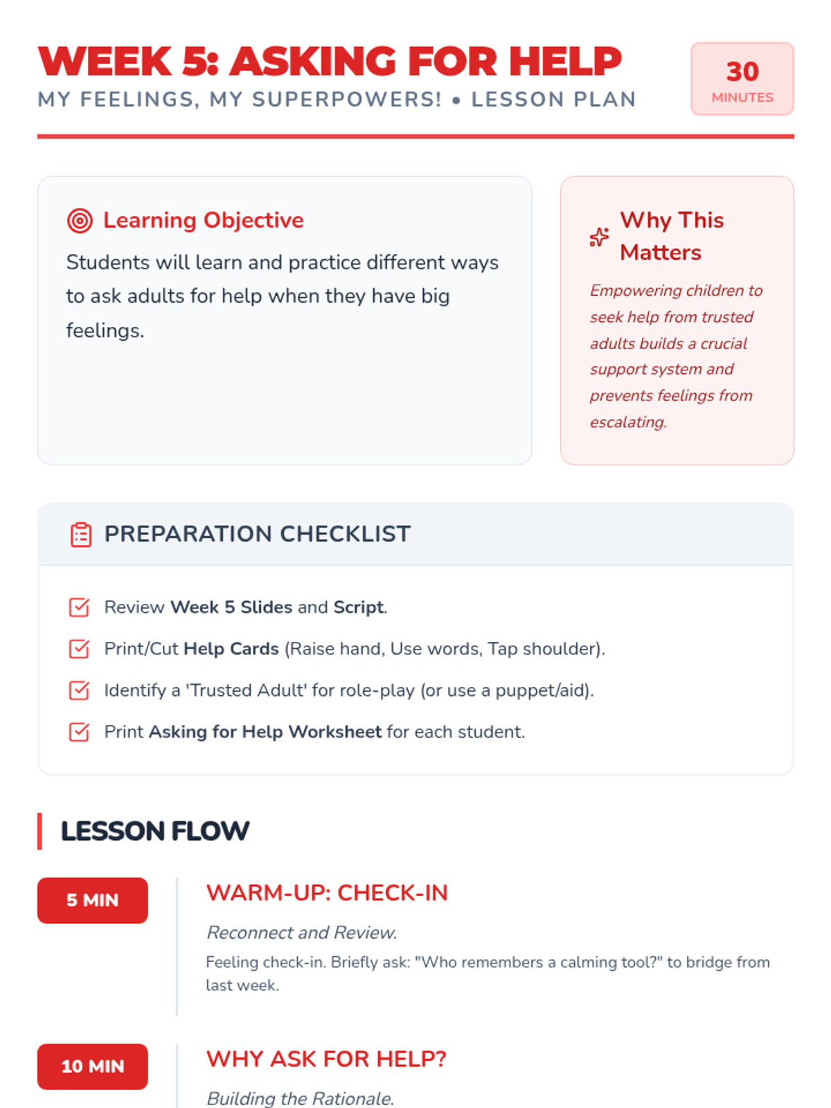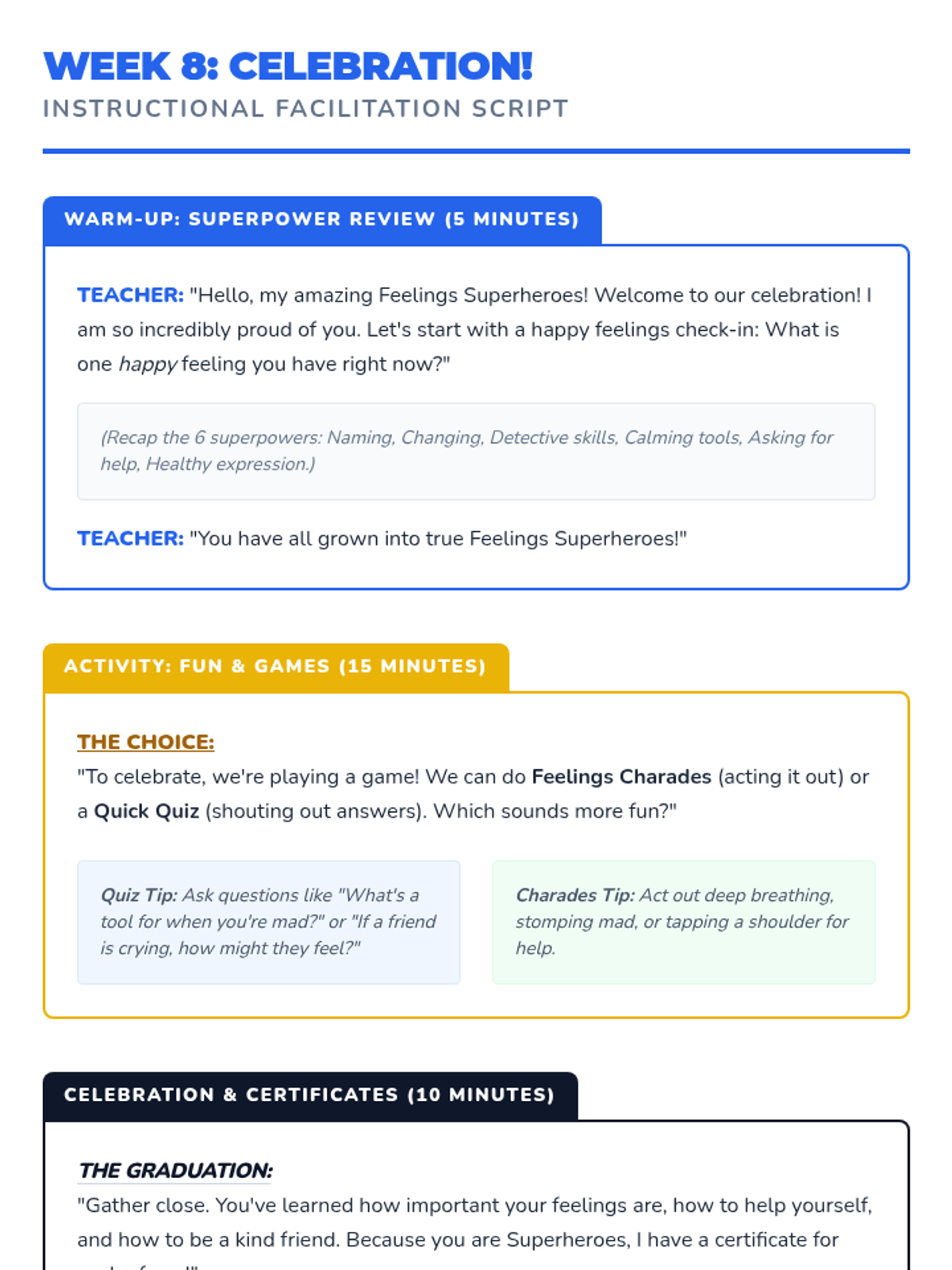 An 8-week Tier 2 group program for Kindergarten students focused on emotional literacy, self-regulation, and help-seeking behaviors. This program uses a superhero theme to empower young learners to navigate their emotions with confidence.