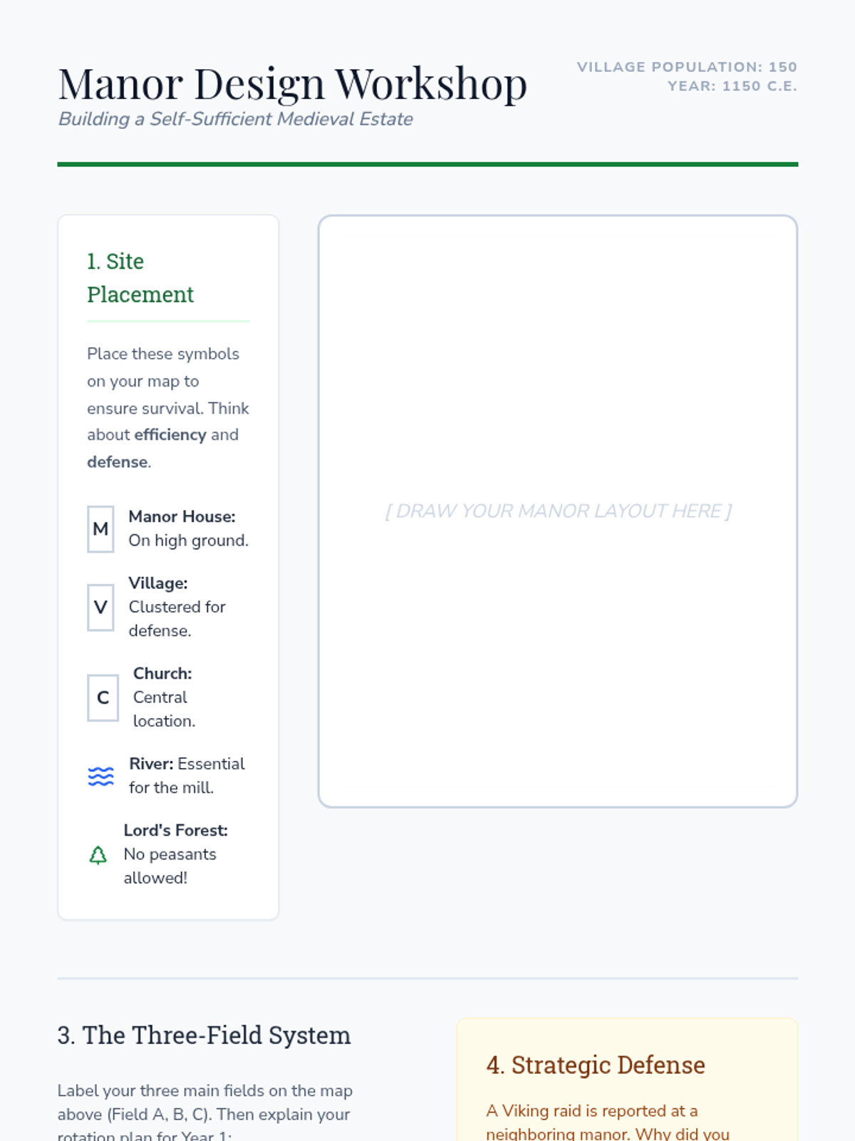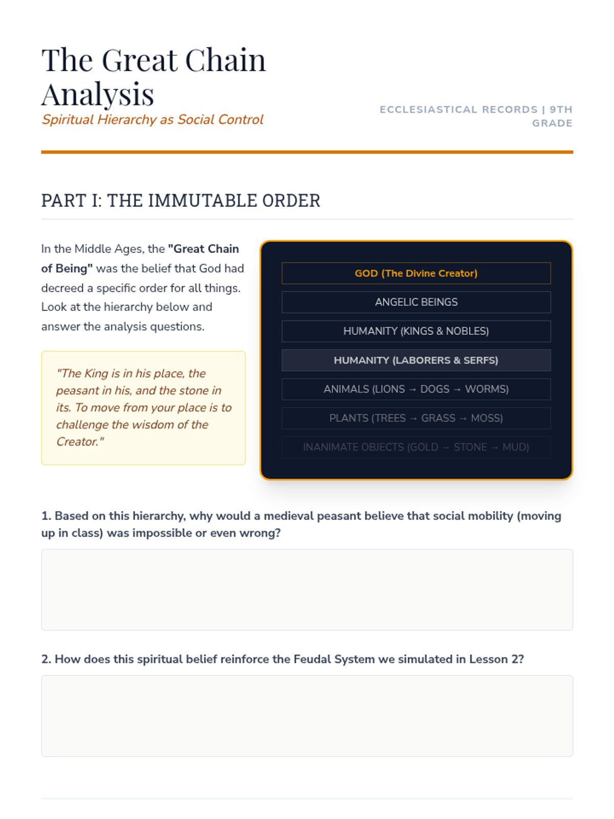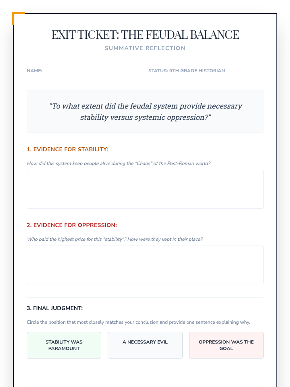 This sequence immerses students in the medieval world to analyze the rise of feudalism, the mechanics of manorialism, and the overarching power of the Church. Students will engage in simulations and source analysis to evaluate the balance between stability and oppression in the Middle Ages.