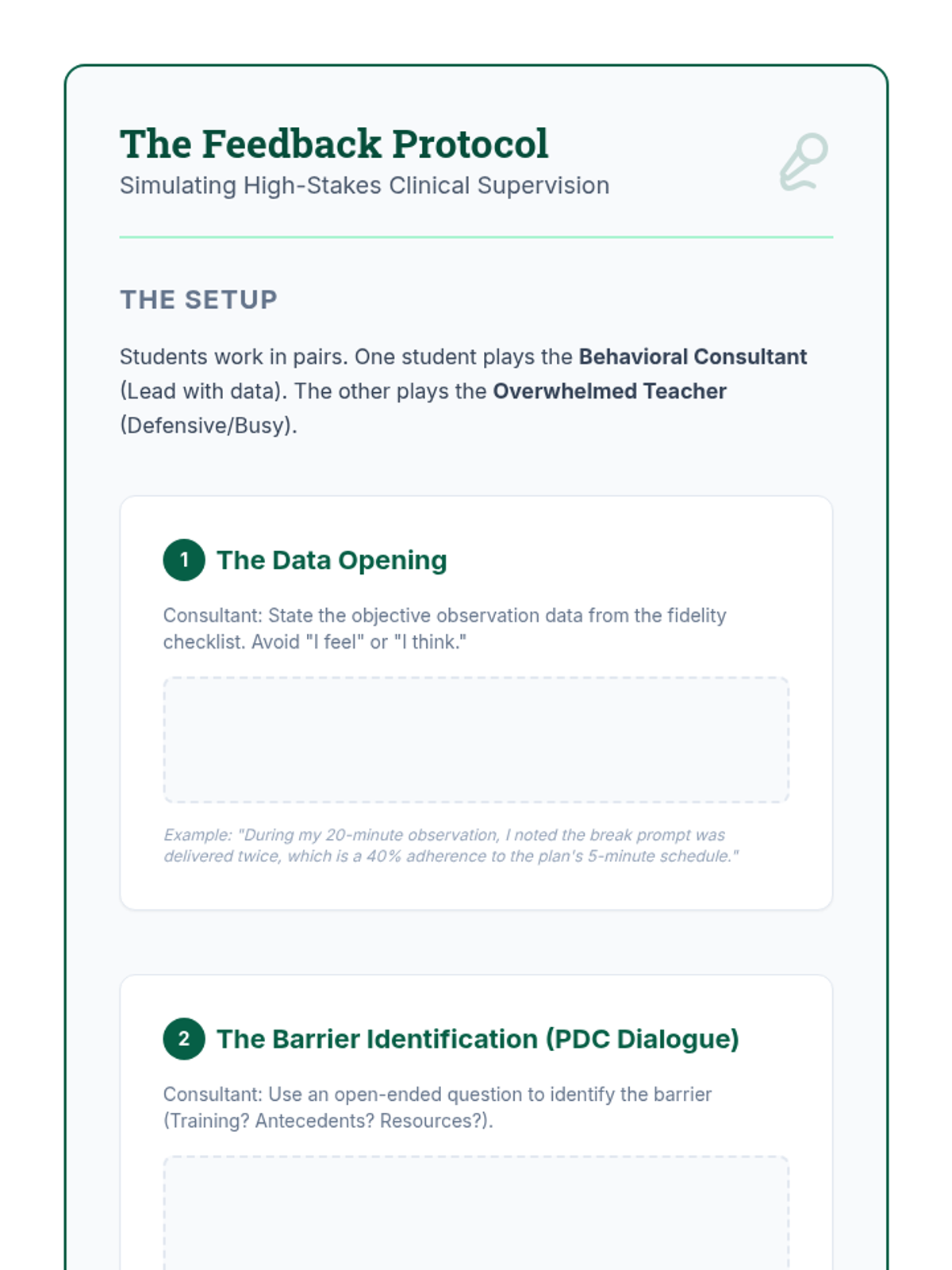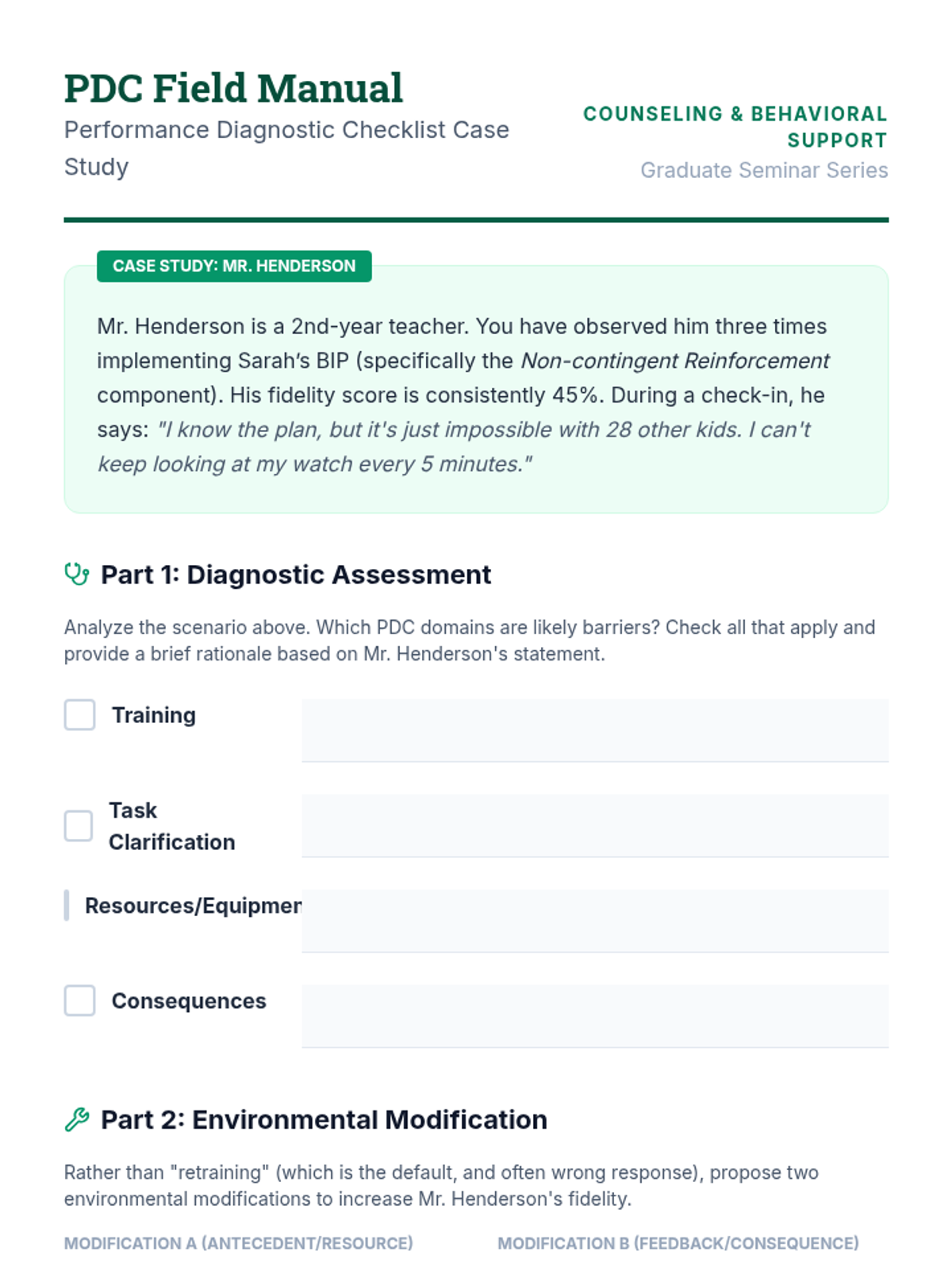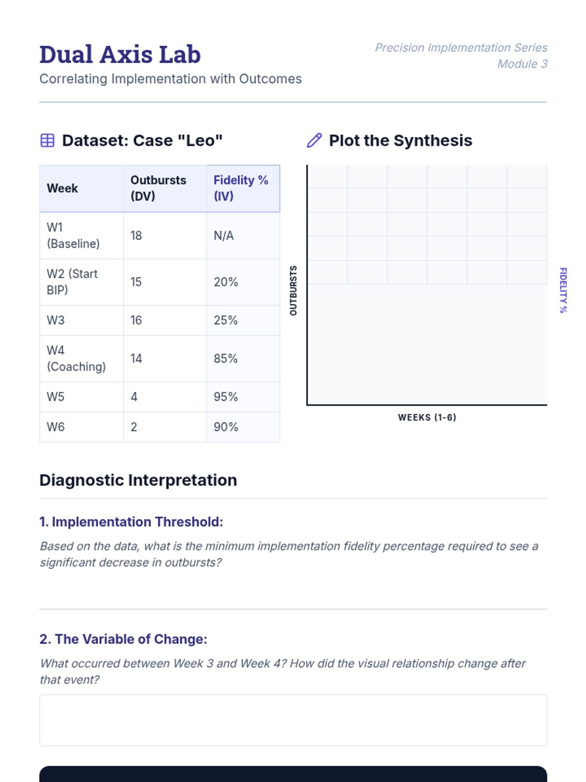 A graduate-level sequence focused on the intersection of implementation science and behavior analysis. Students learn to measure treatment fidelity, provide performance feedback, and ethically modify Behavior Intervention Plans (BIPs) based on concurrent implementation and outcome data.