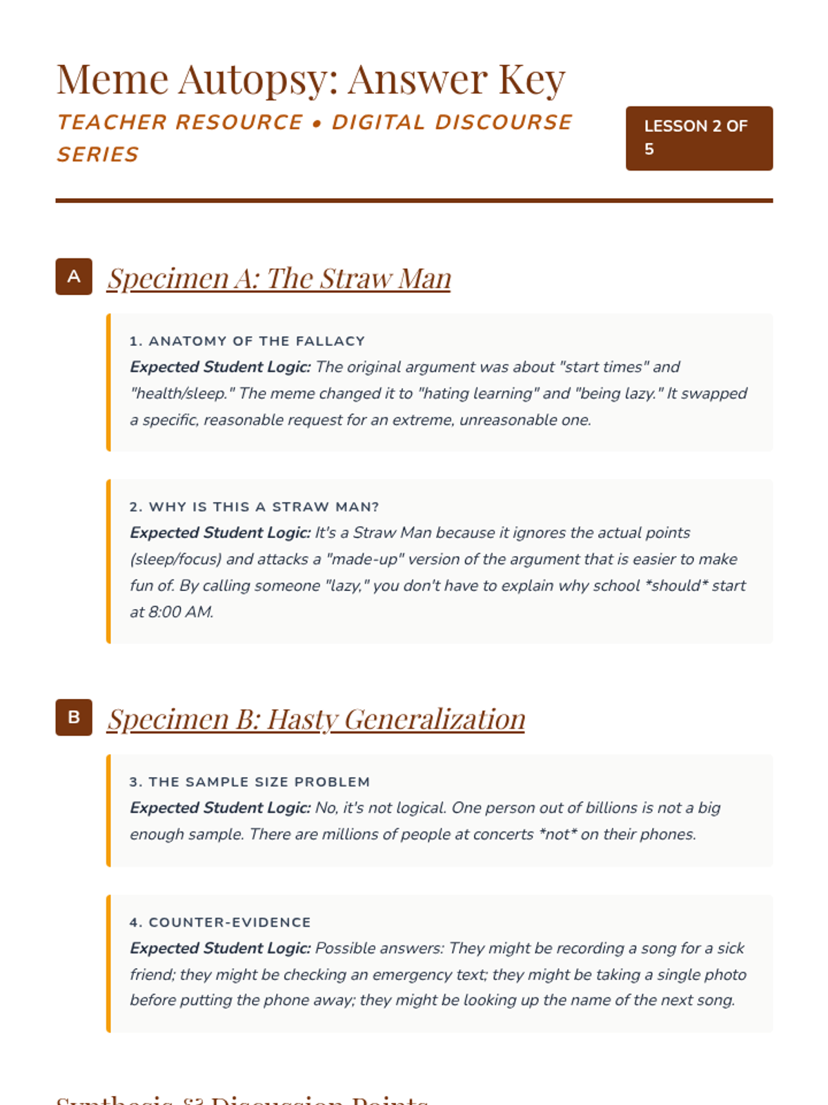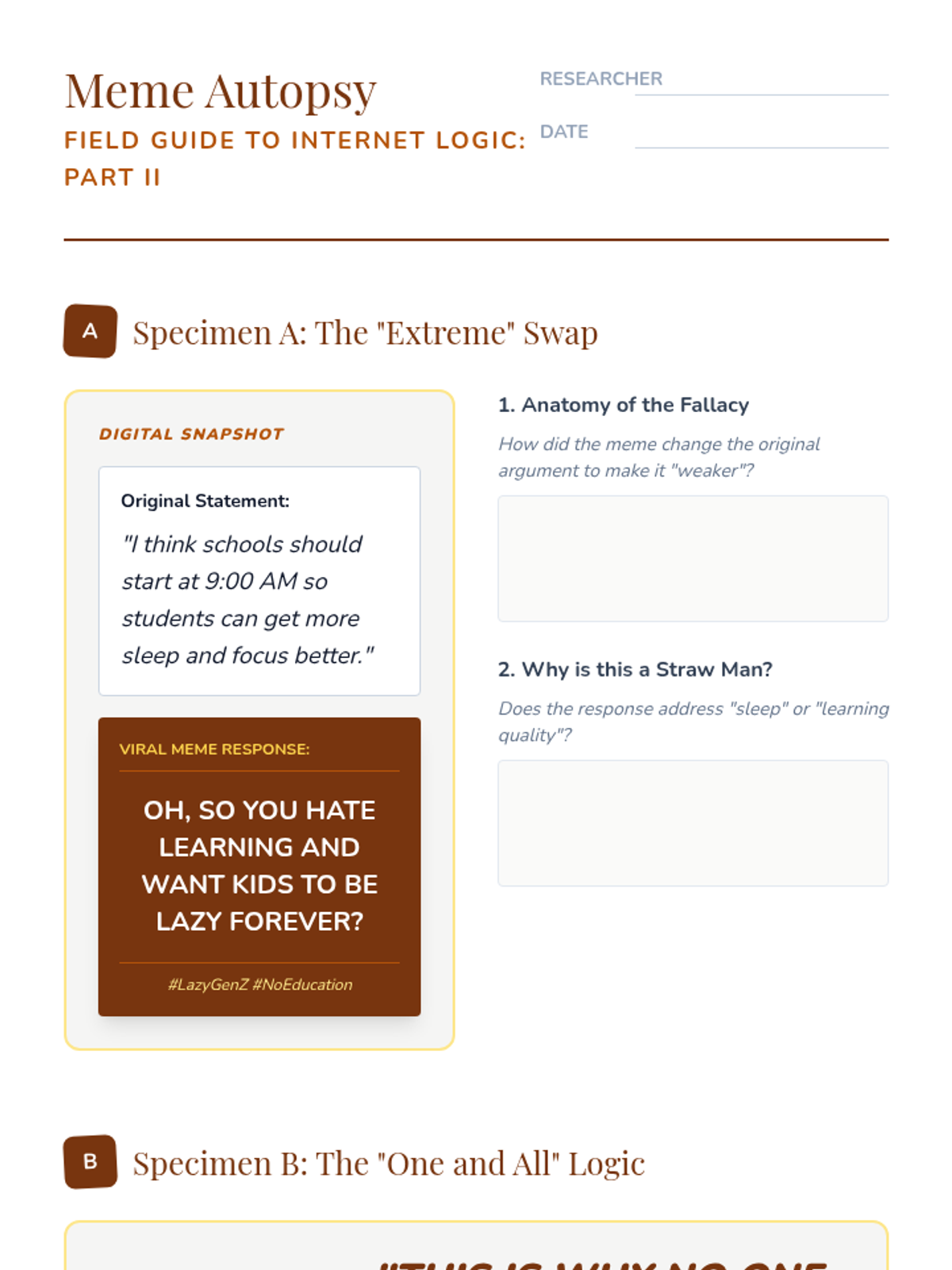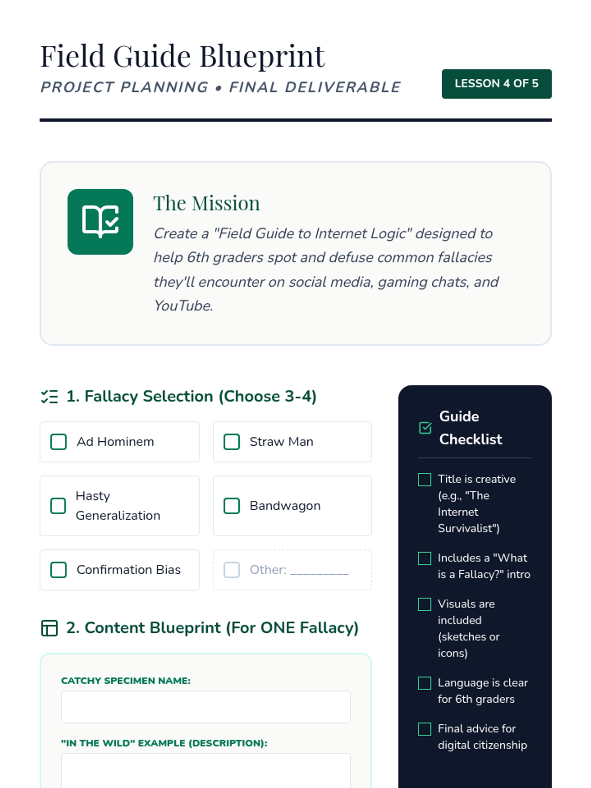 A project-based sequence where students investigate logical fallacies in digital spaces, culminating in the creation of a 'Field Guide to Internet Logic' to help peers navigate online discourse.