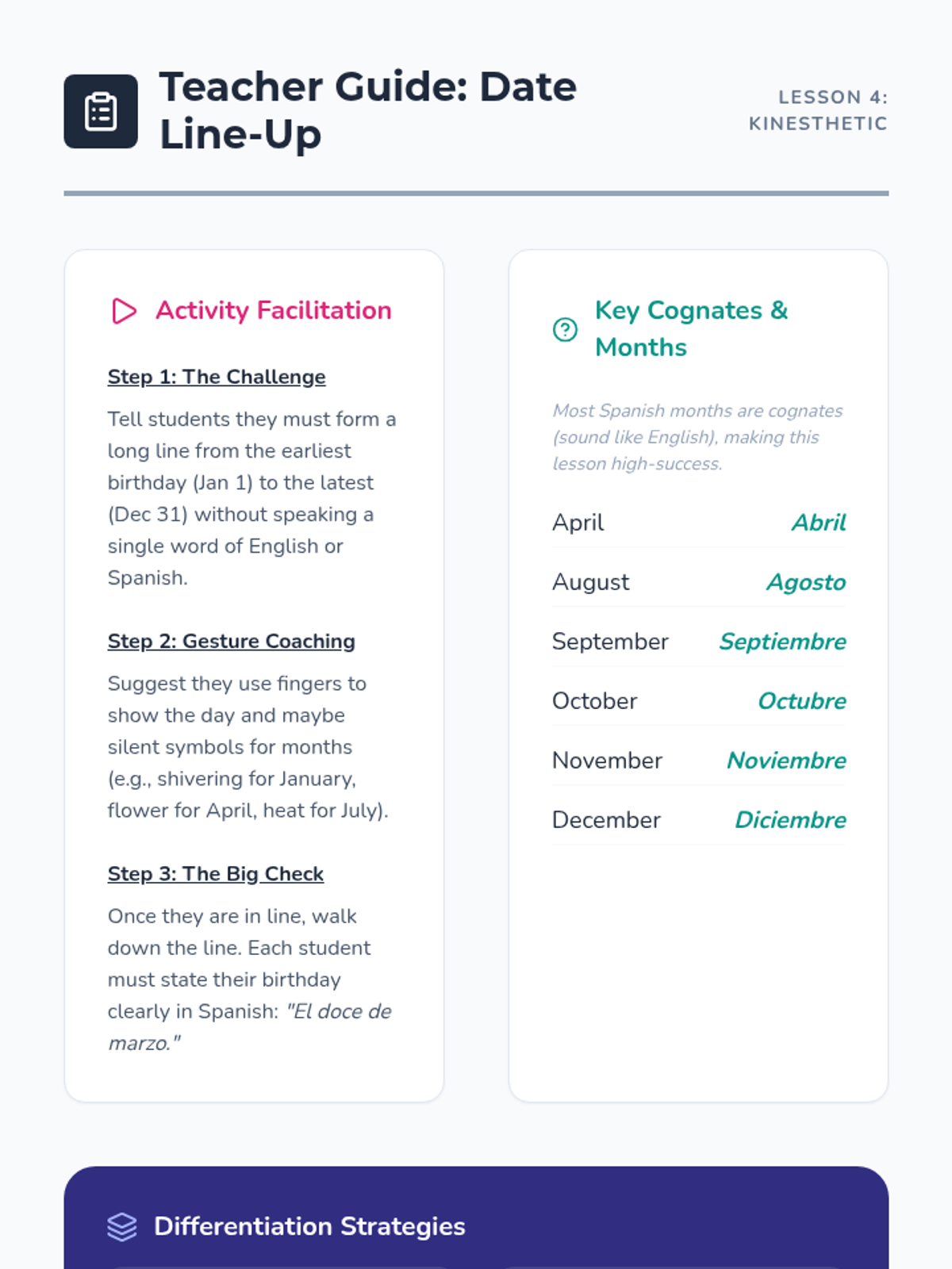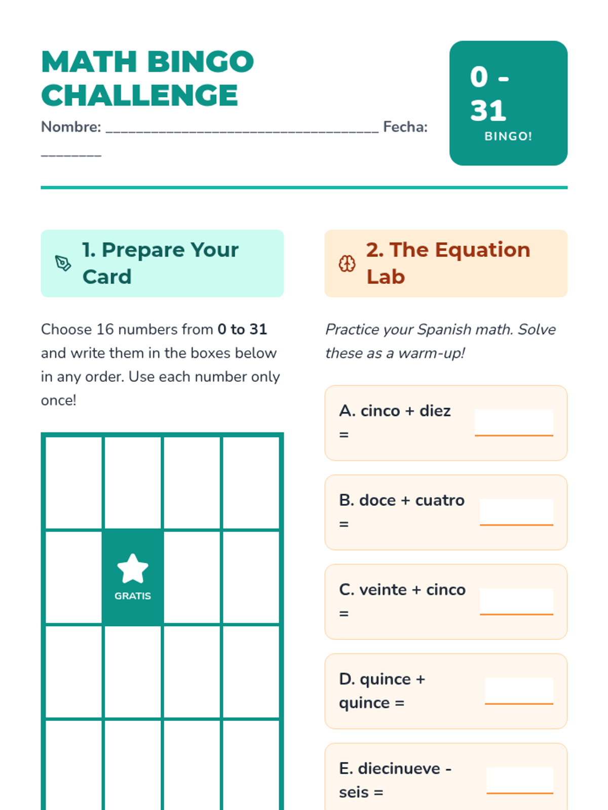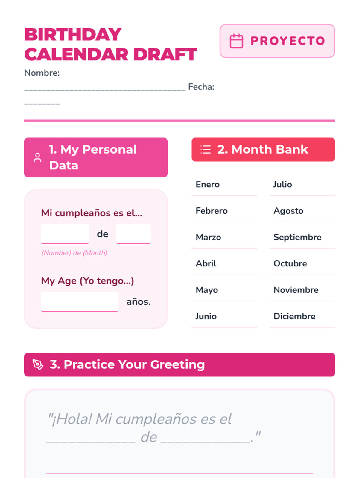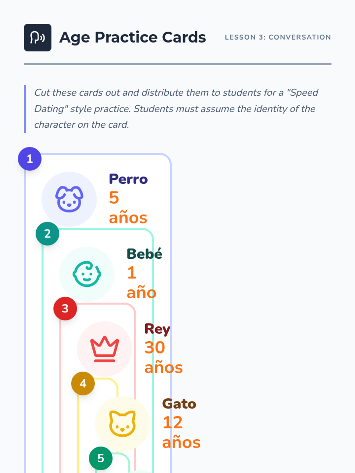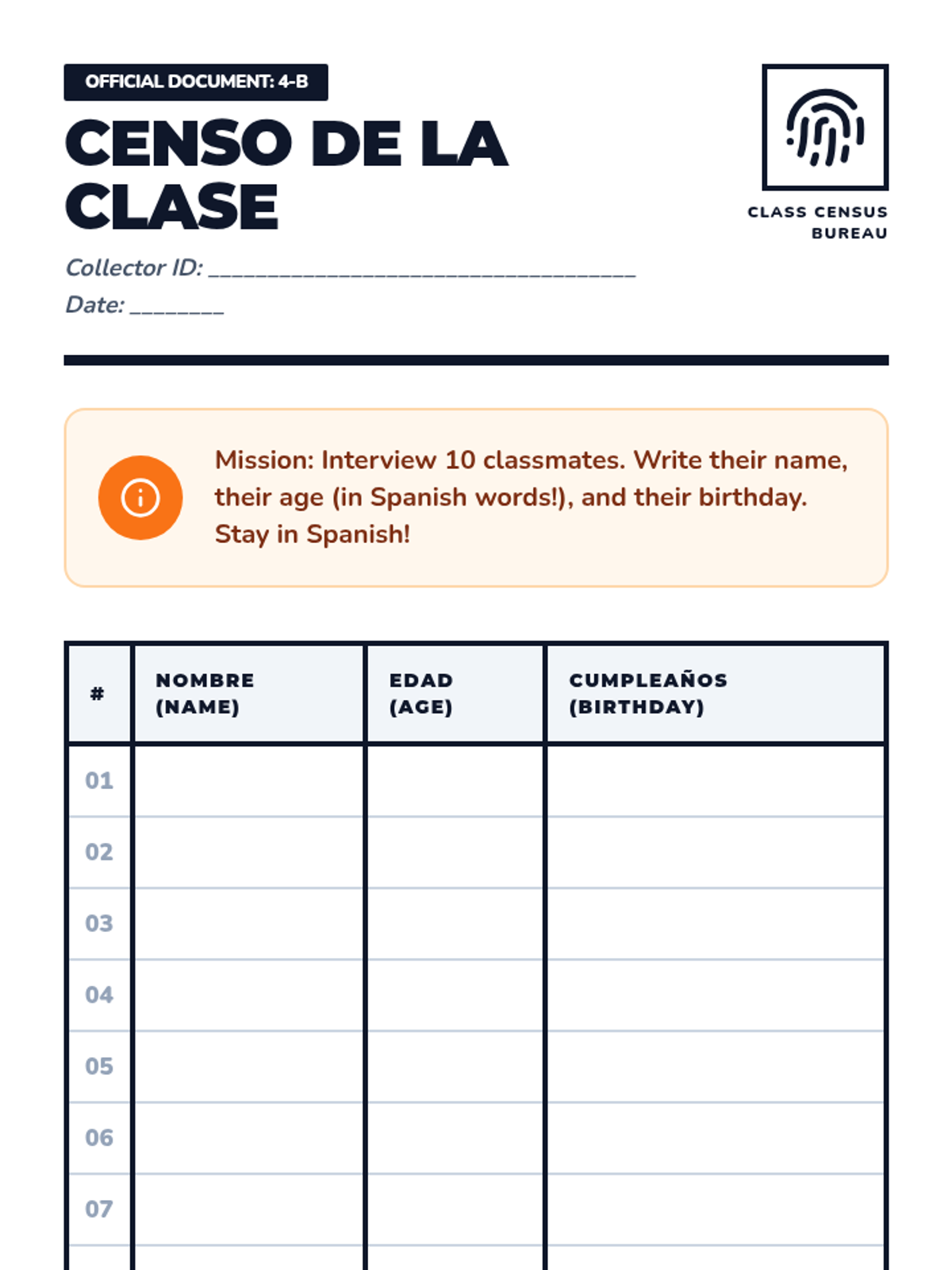 A lively exploration of Spanish numbers 0-31, focusing on expressing age and birthdays. Students move from rote memorization to real-world data collection and peer interviews to build a class birthday calendar.