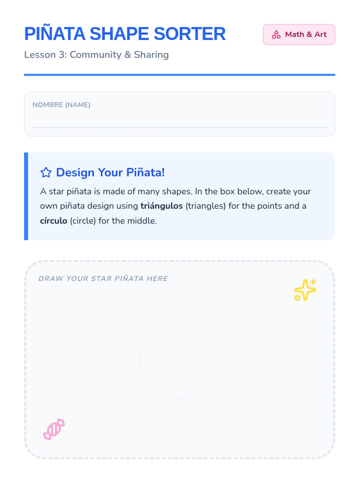 A vibrant project-based sequence where Kindergarten students explore Spanish-speaking cultures through the lens of traditional celebrations. Students learn about the values of family, memory, and community while creating hands-on artifacts like paper flowers, sugar skulls, and star piñatas.