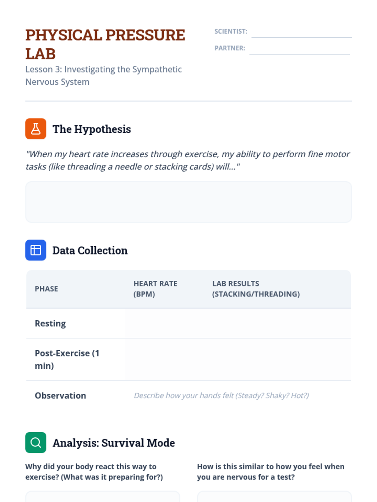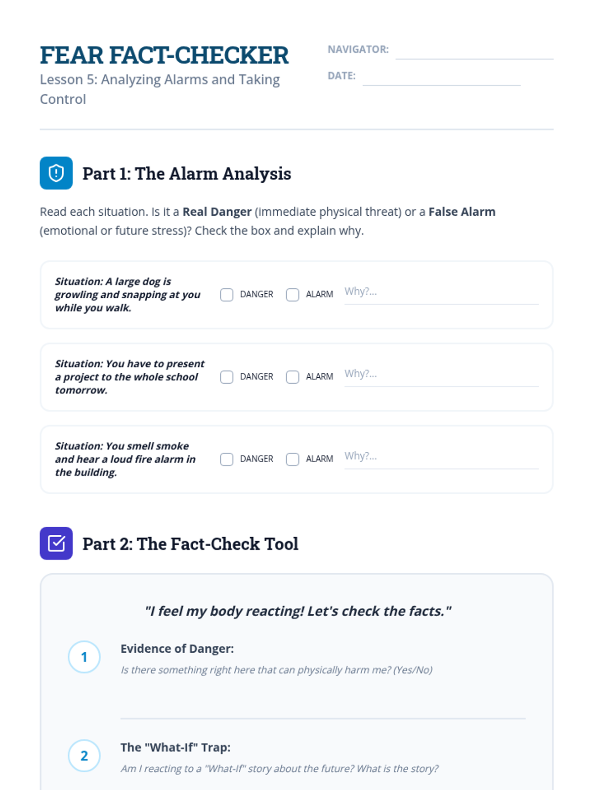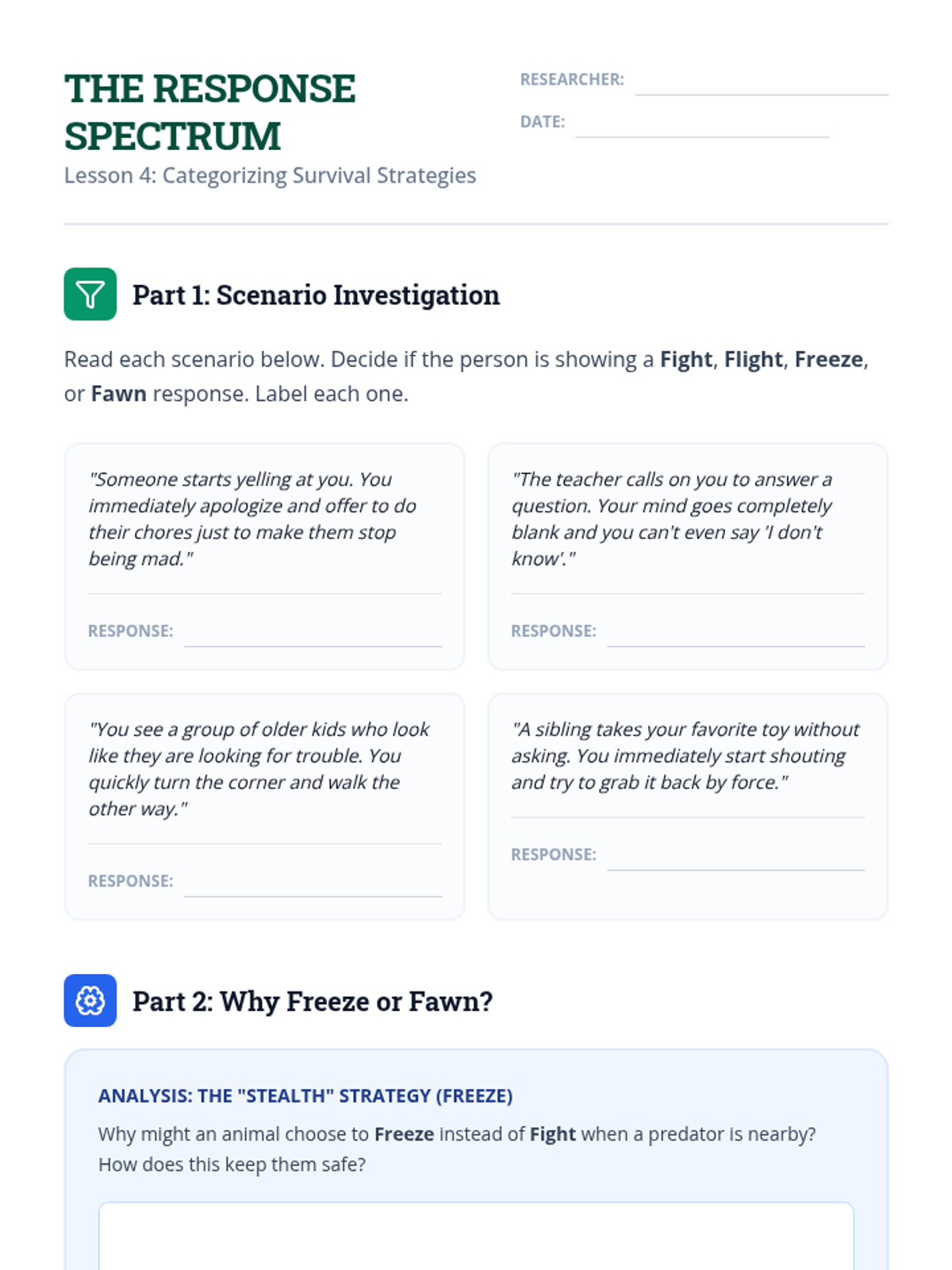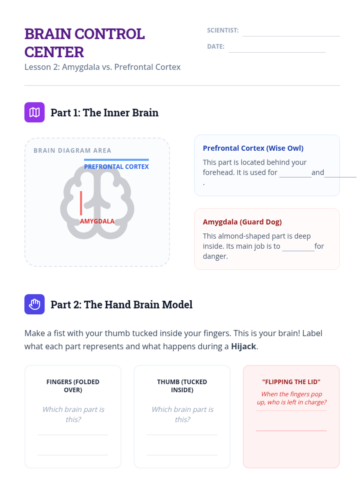 A 5-lesson sequence for 6th graders that explores the biological mechanics of stress, transforming it from a scary sensation into a comprehensible physiological process. Students will learn about the amygdala, prefrontal cortex, and the various stress responses (fight, flight, freeze, fawn) while developing skills to distinguish between real danger and modern anxiety.