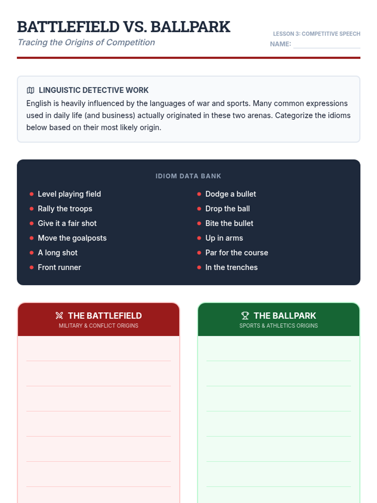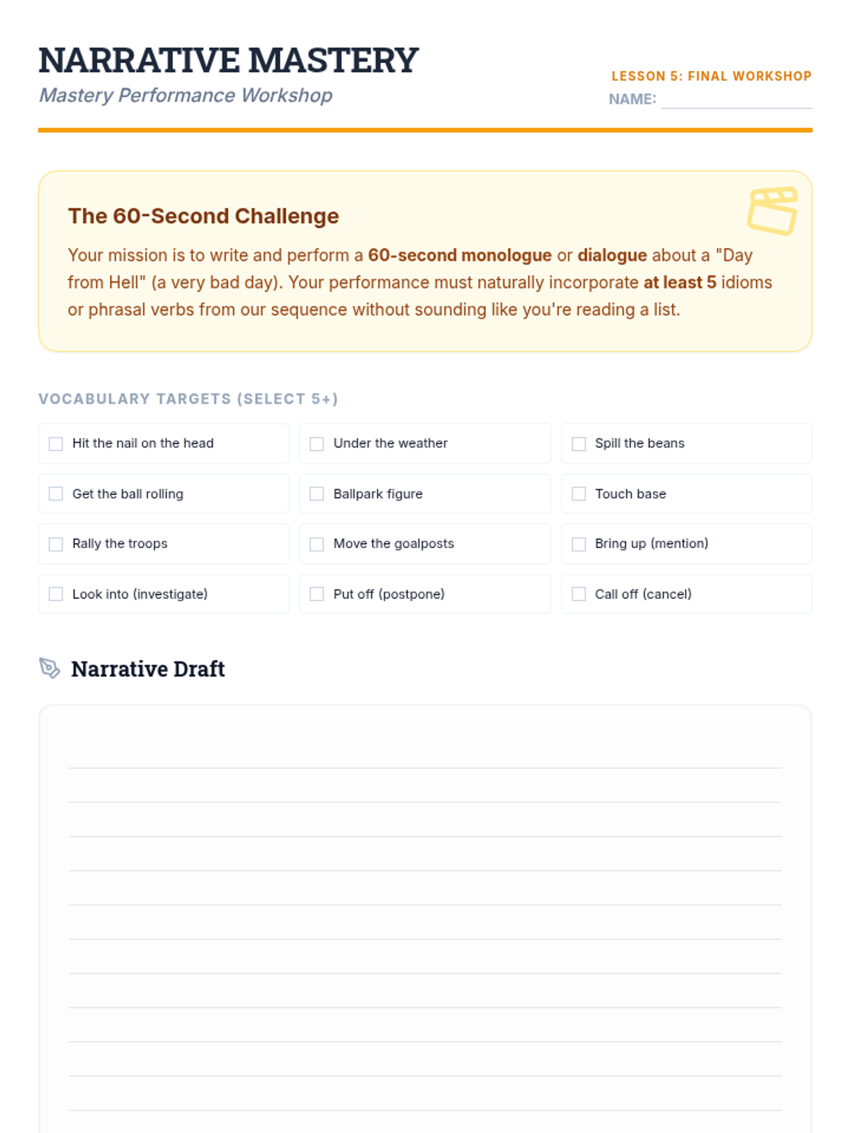 This sequence guides advanced English learners through the nuances of idiomatic and figurative language. Students explore the logic behind metaphors, master professional idioms, analyze cultural origins in sports and war, and develop oral fluency through creative performance.