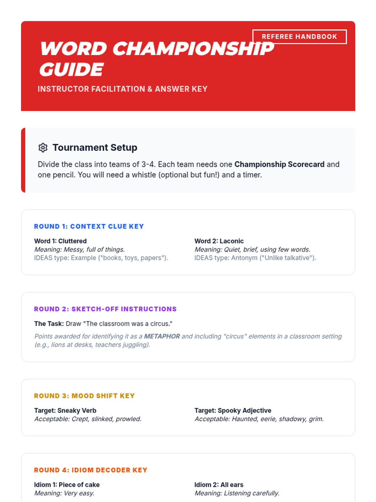 A multi-sensory, color-coded approach to reading comprehension. Students learn to systematically deconstruct informational texts using a tri-color system: green for main ideas, yellow for supporting details, and red for unknown vocabulary.