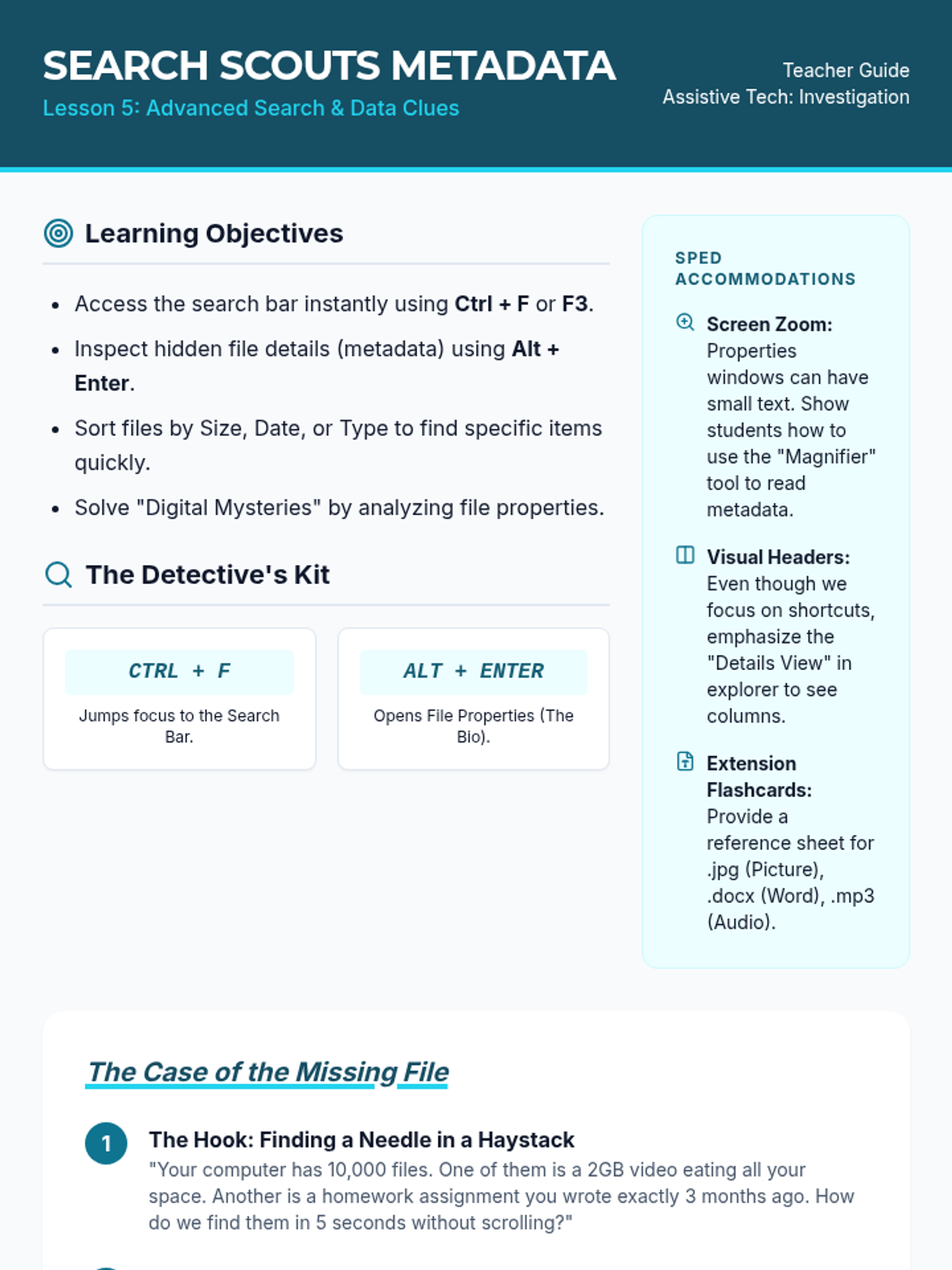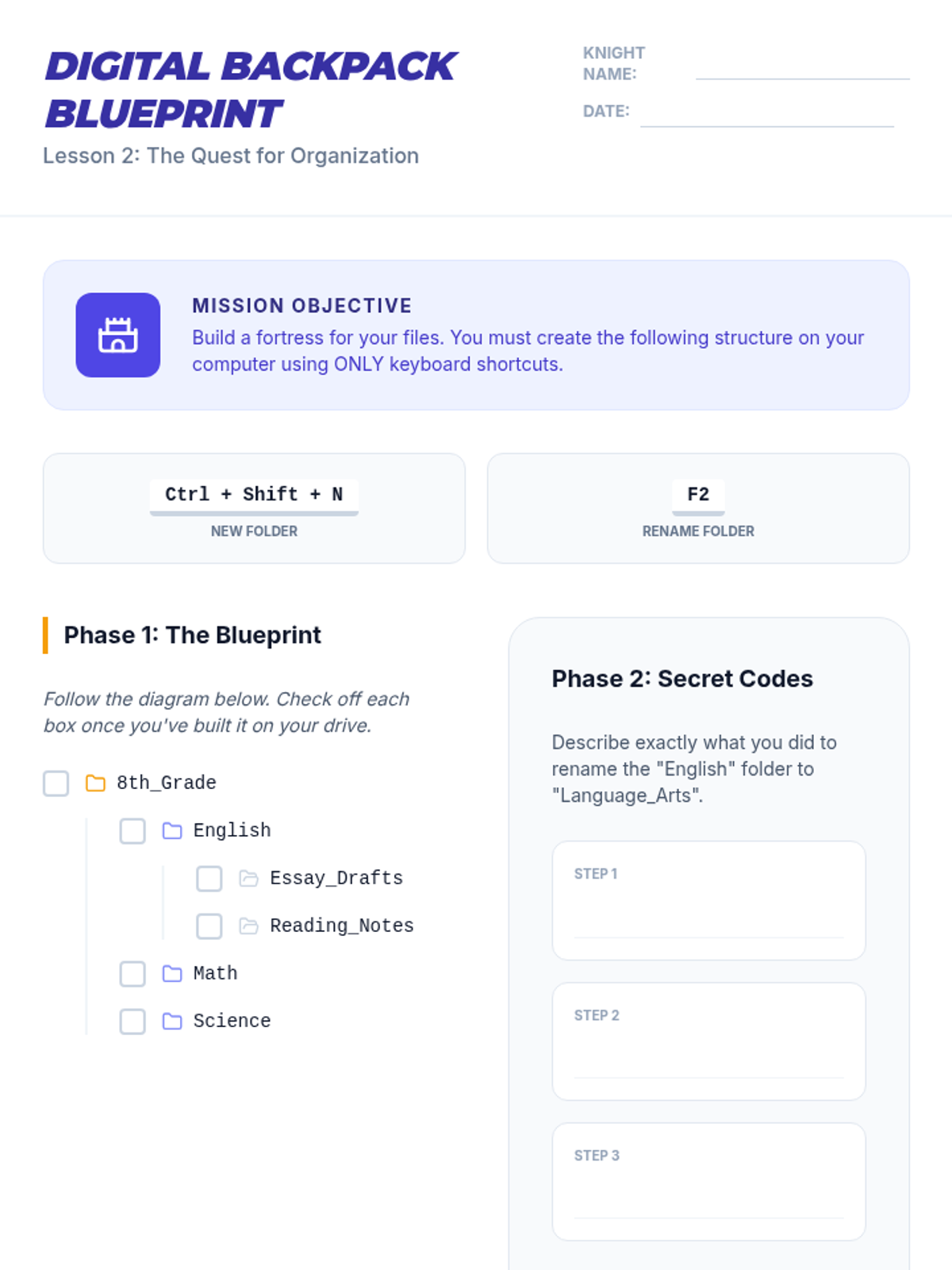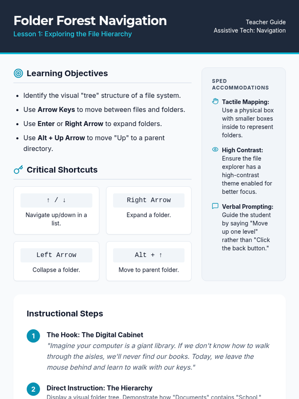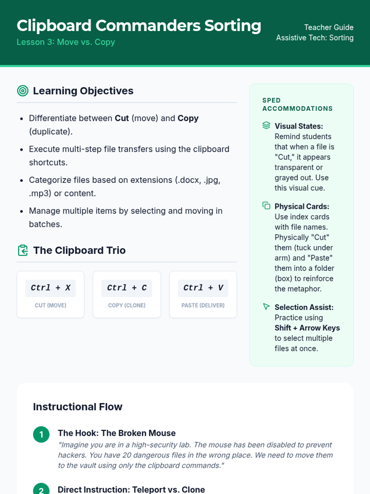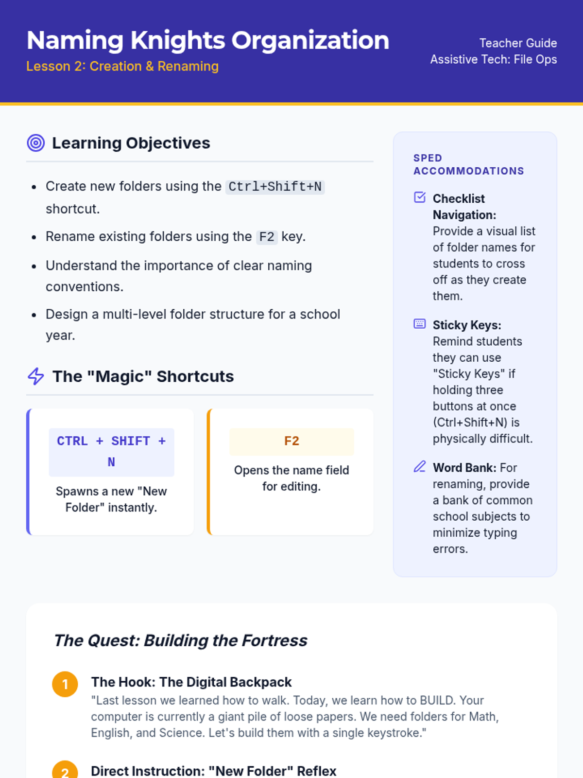A comprehensive sequence for 8th-grade students (Special Education focus) to master file management using keyboard shortcuts. Students transition from visual drag-and-drop to hierarchical navigation, organizational structure, and data manipulation.