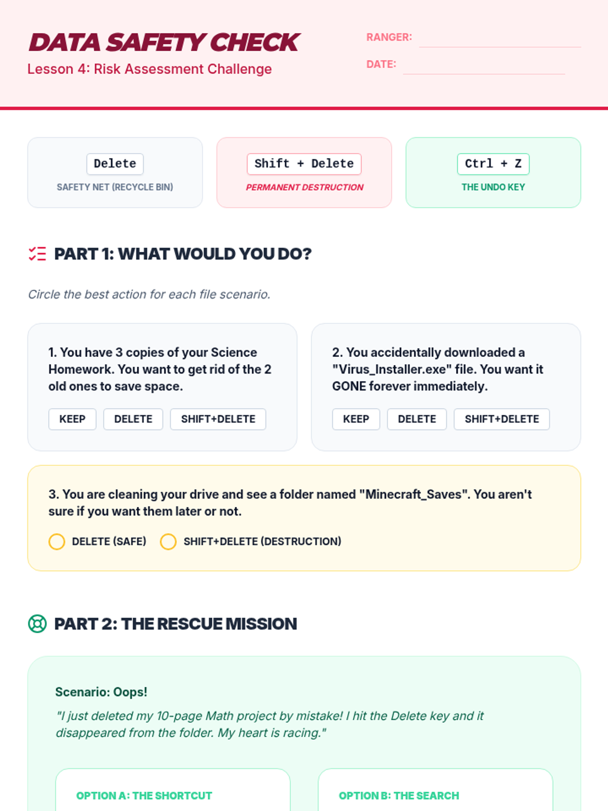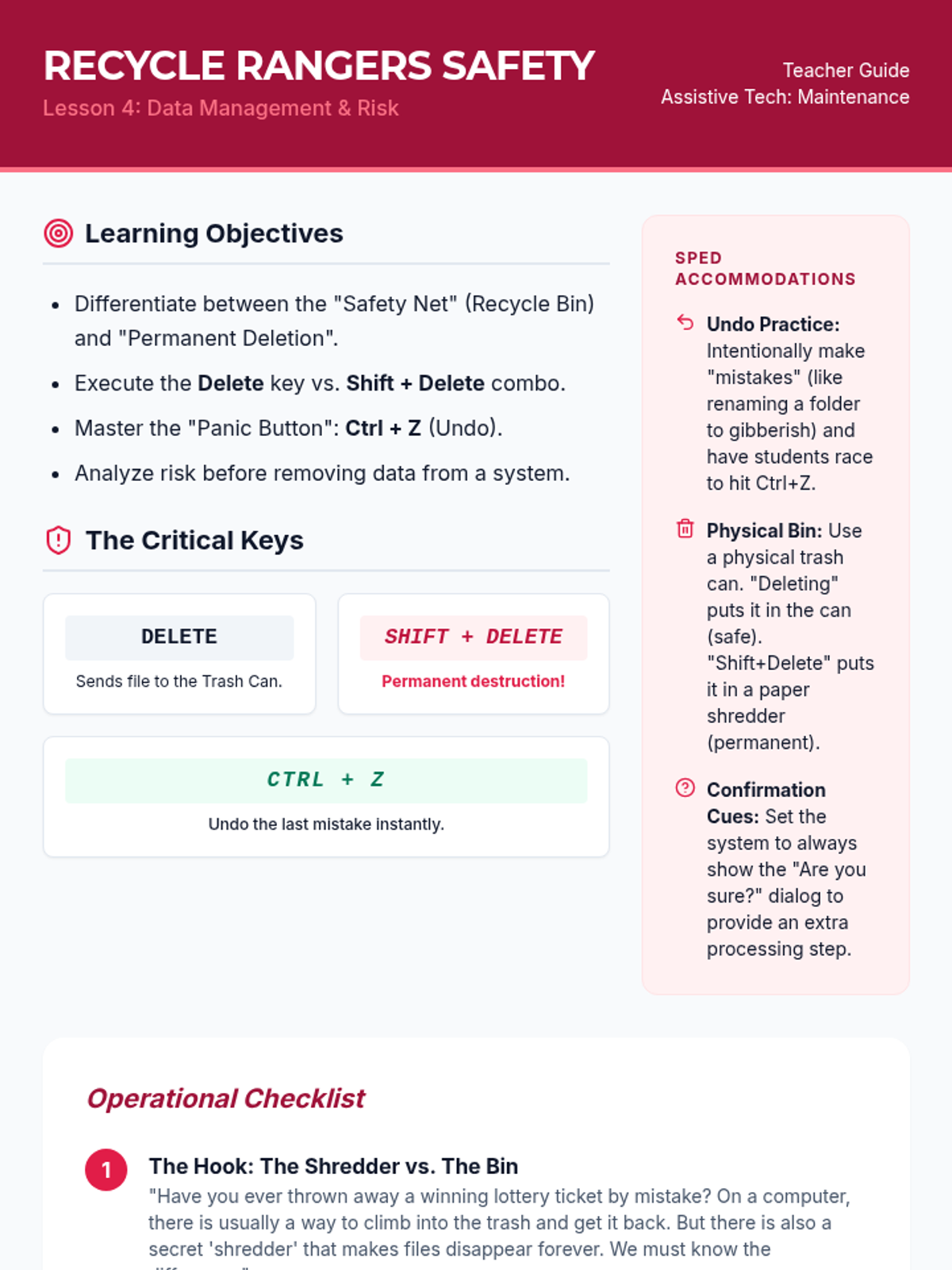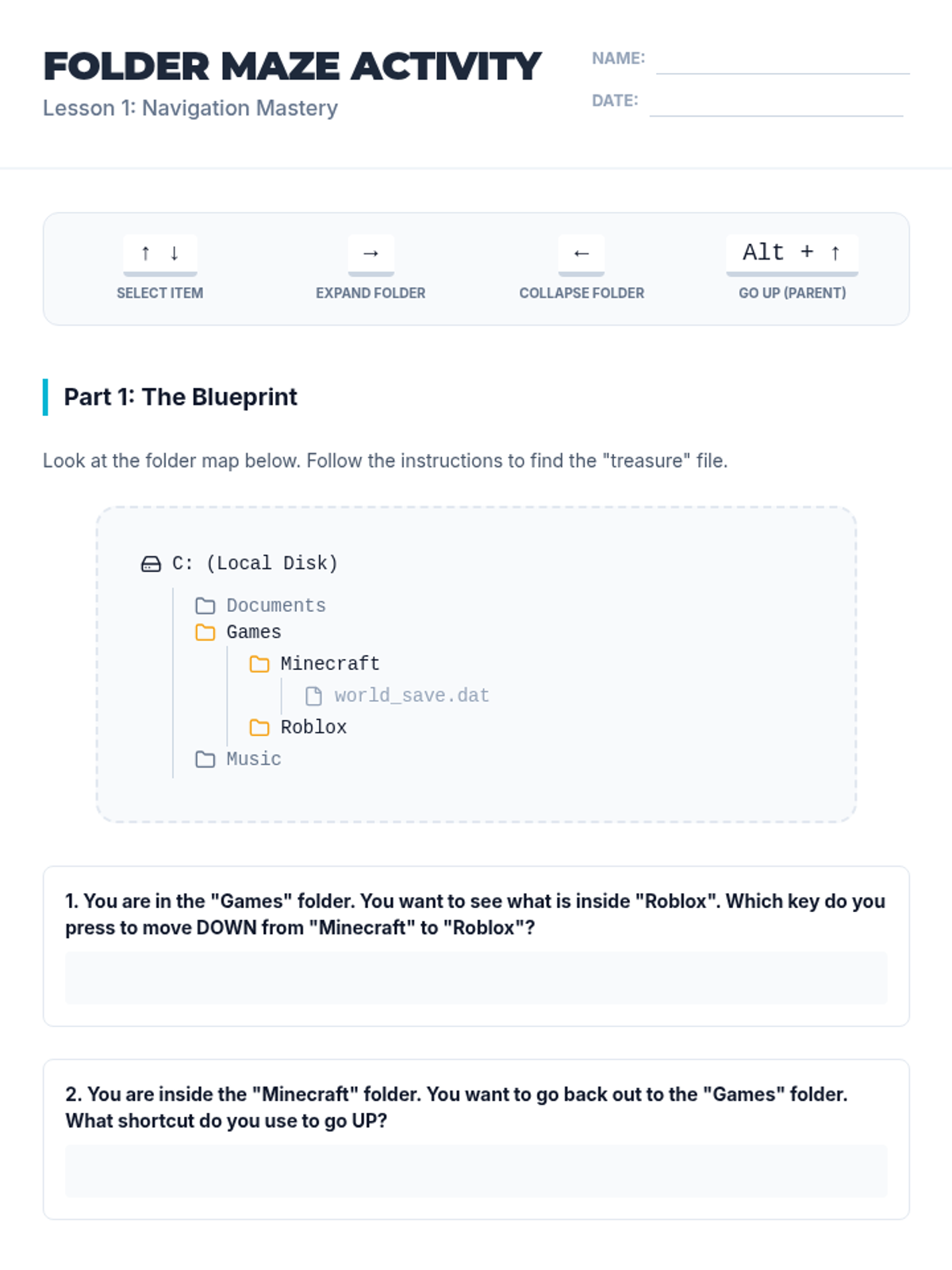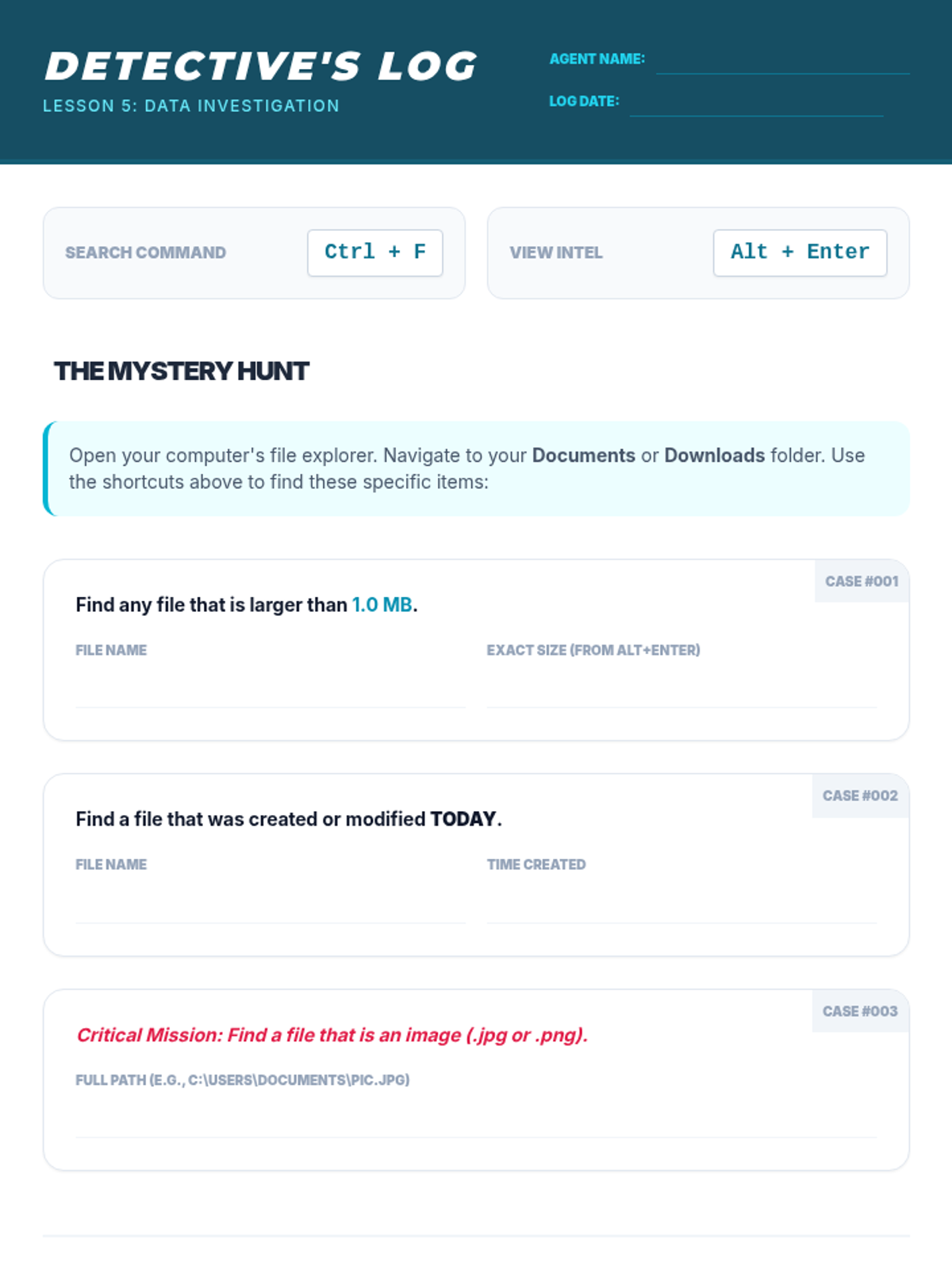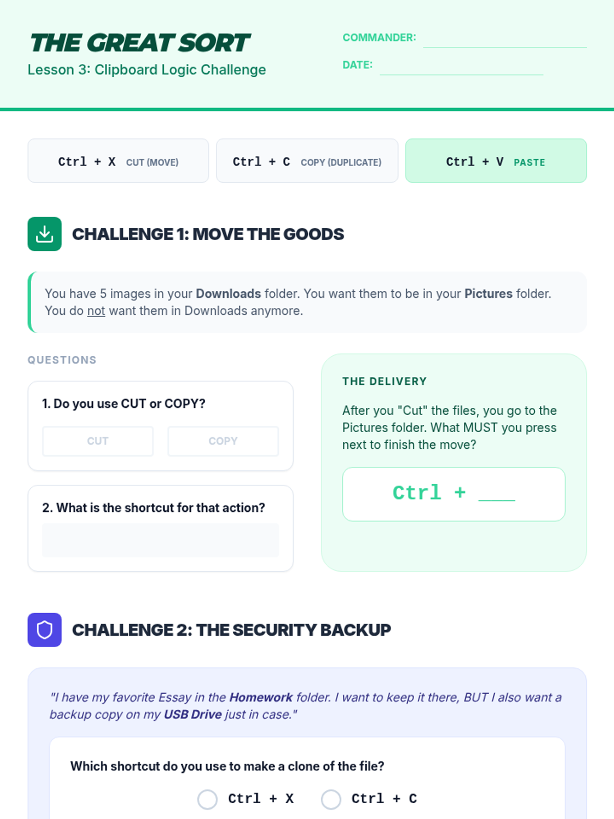 A comprehensive sequence for 8th-grade students (Special Education focus) to master file management using keyboard shortcuts. Students transition from visual drag-and-drop to hierarchical navigation, organizational structure, and data manipulation.