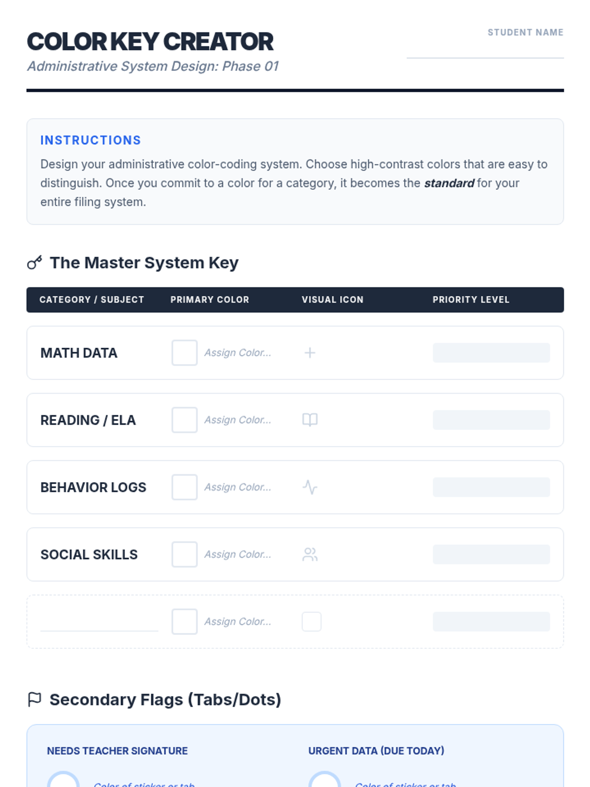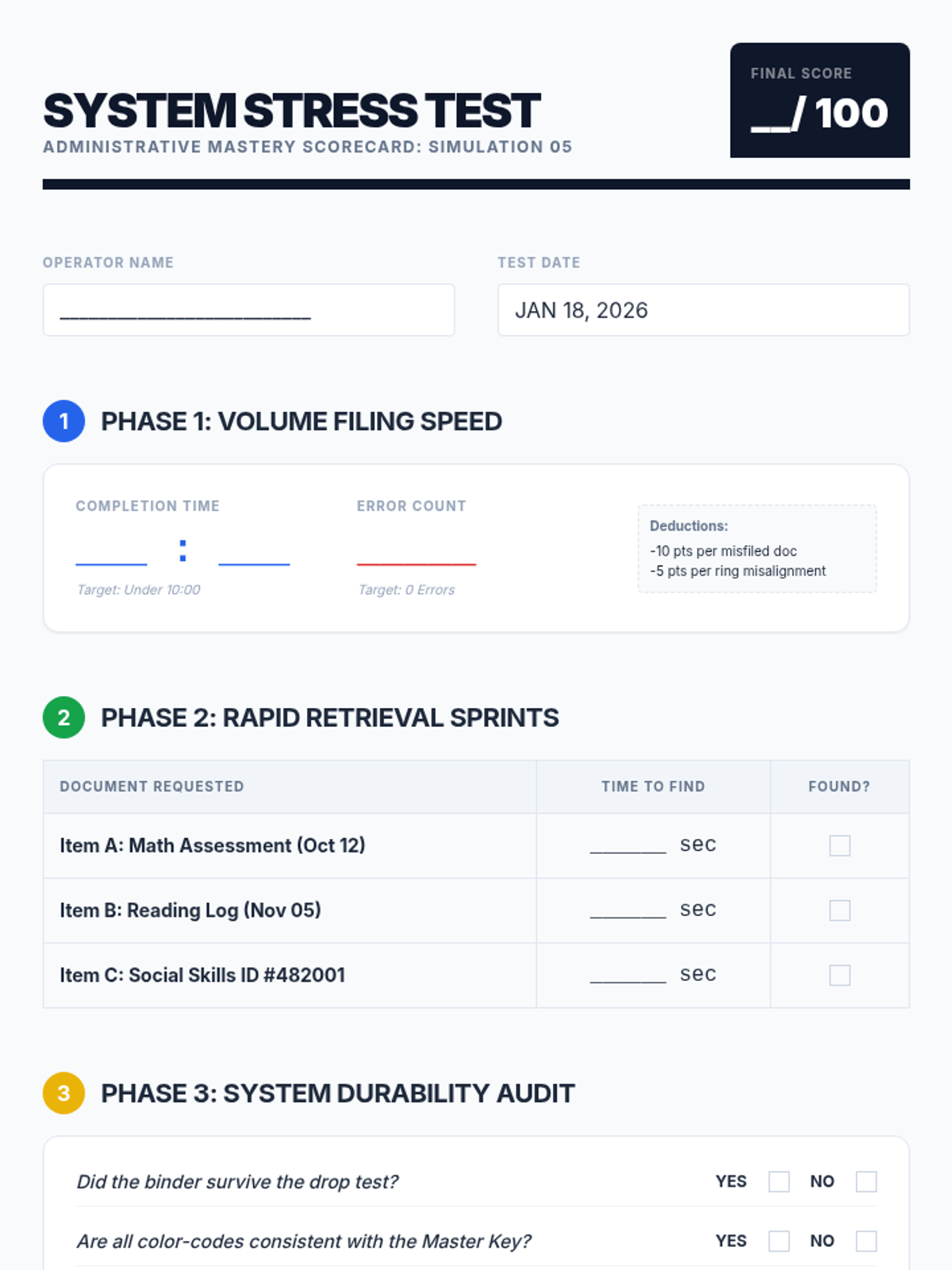 A comprehensive sequence focused on professional clerical skills, teaching students to master alphabetical, numerical, and color-coded filing systems, alongside data tracking and confidentiality protocols.