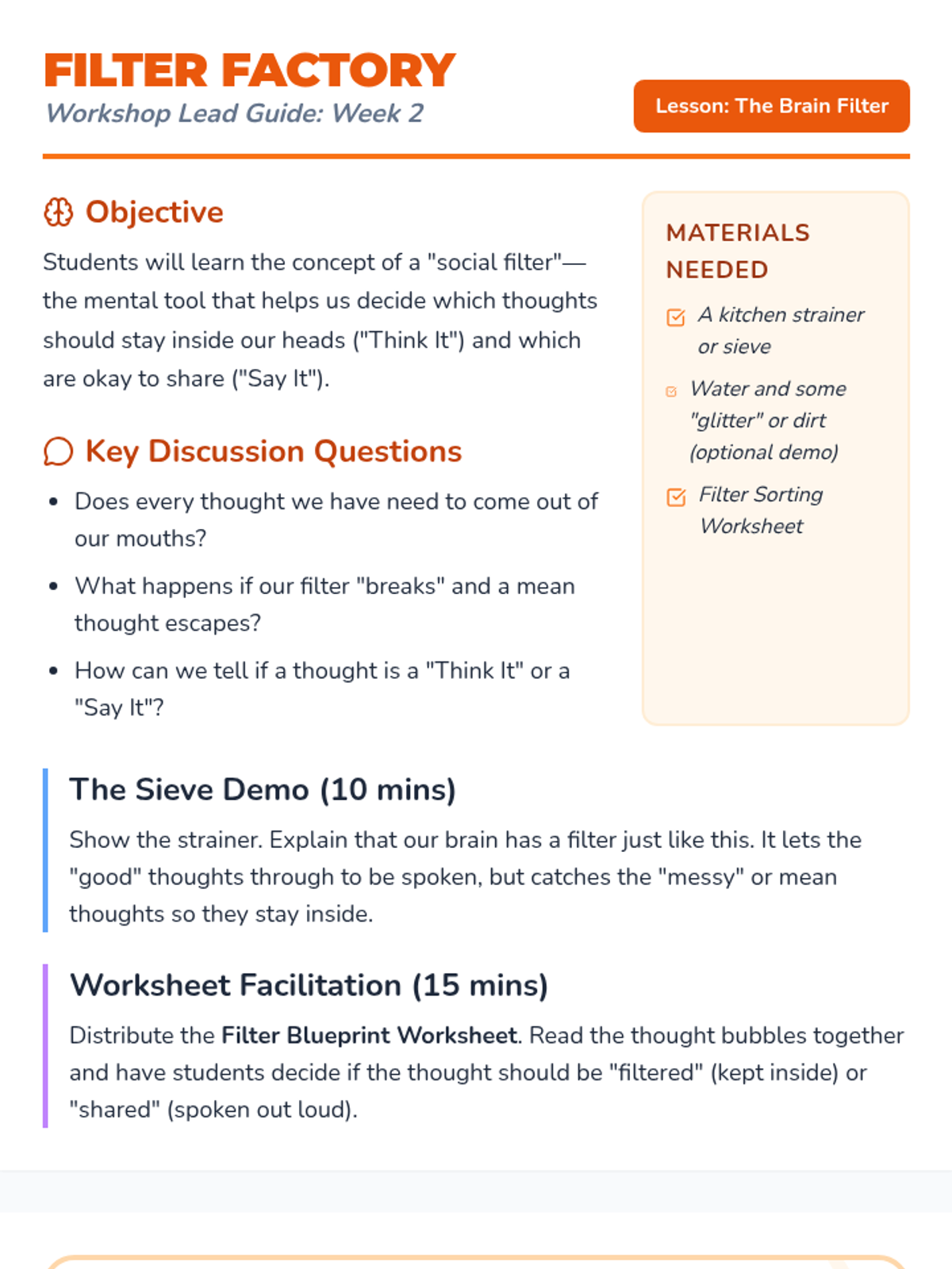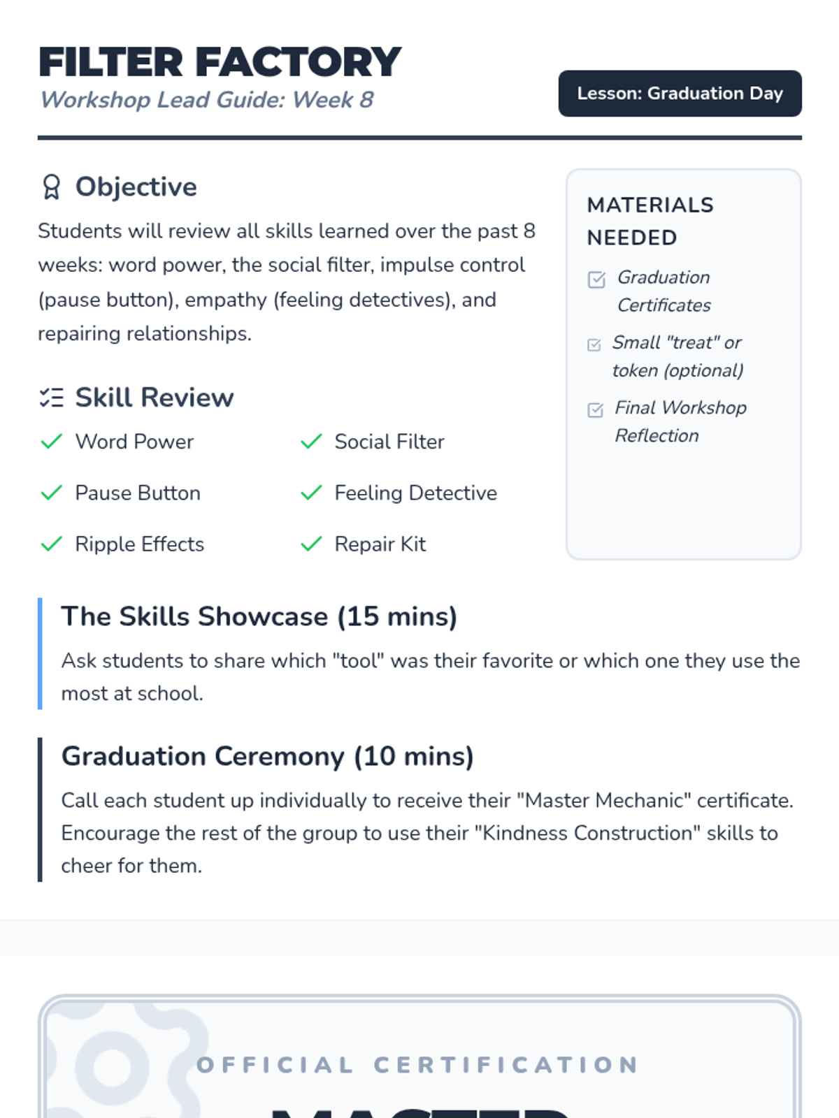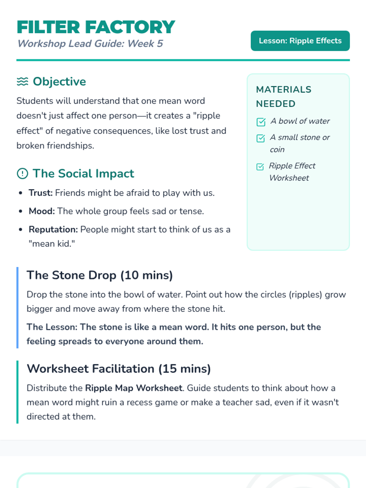 An 8-week social skills group curriculum for 2nd graders focusing on the impact of mean words, impulse control, and empathy. Students learn to use a 'social filter' to build positive relationships and understand the consequences of their communication choices.
