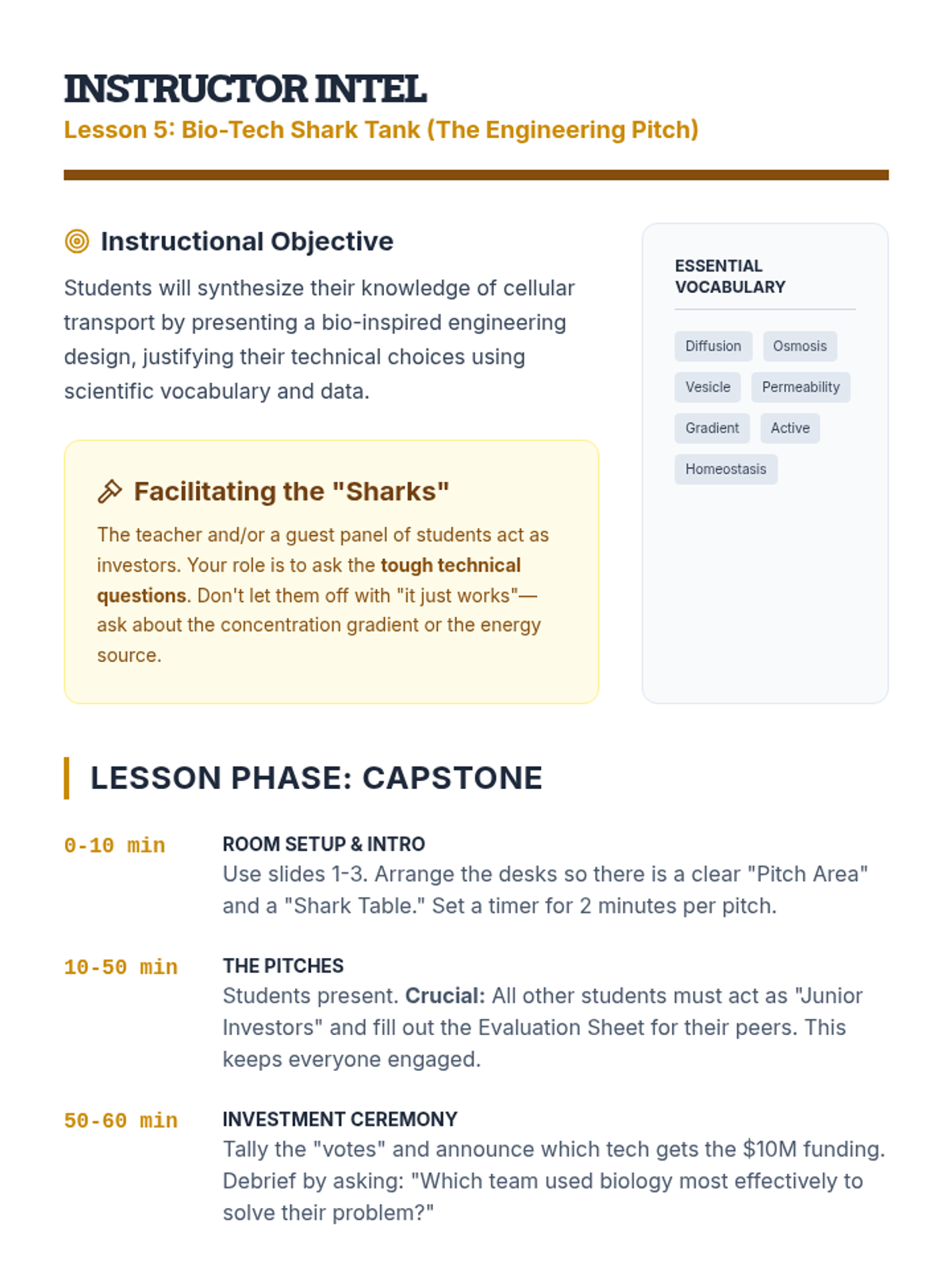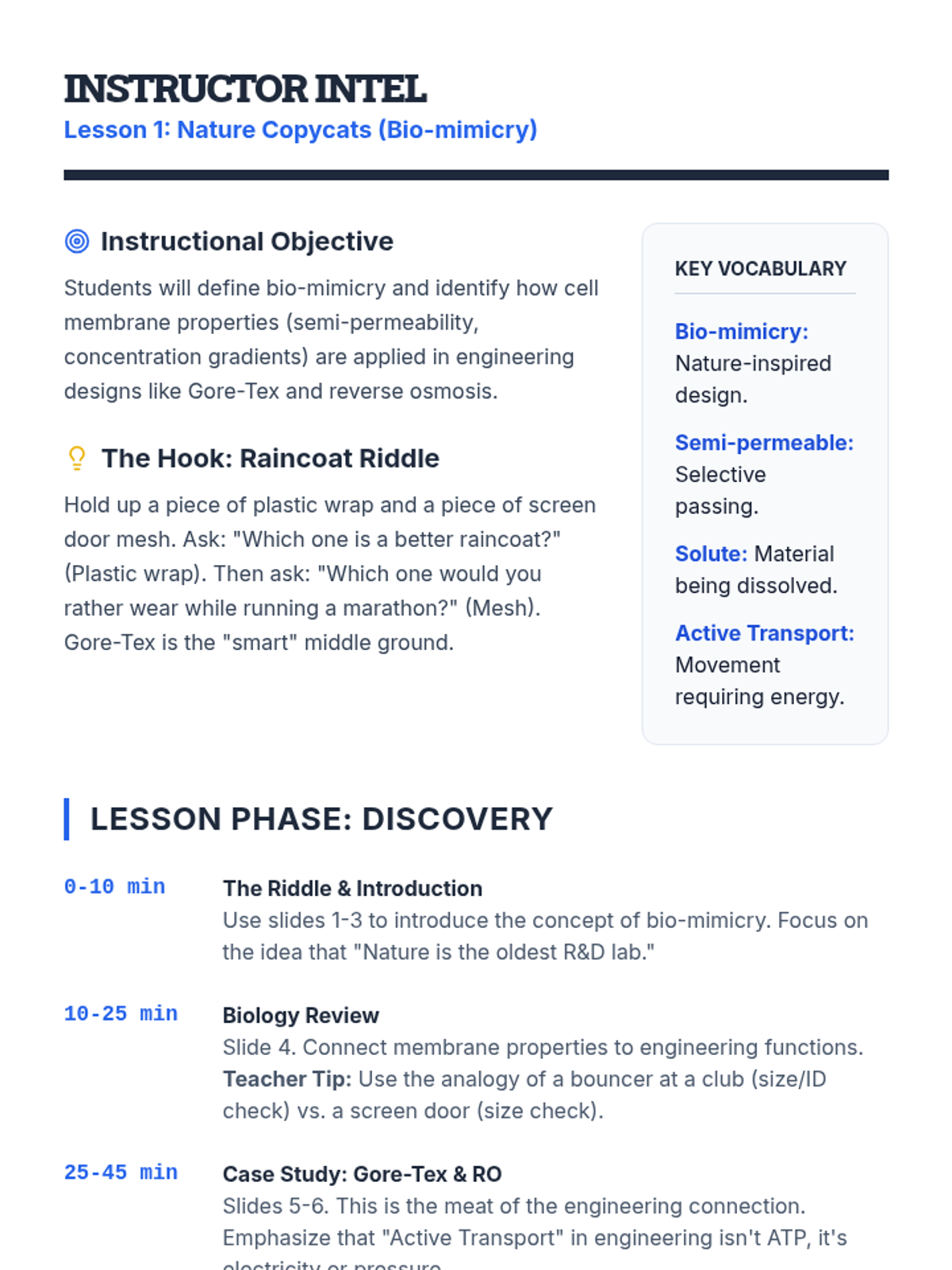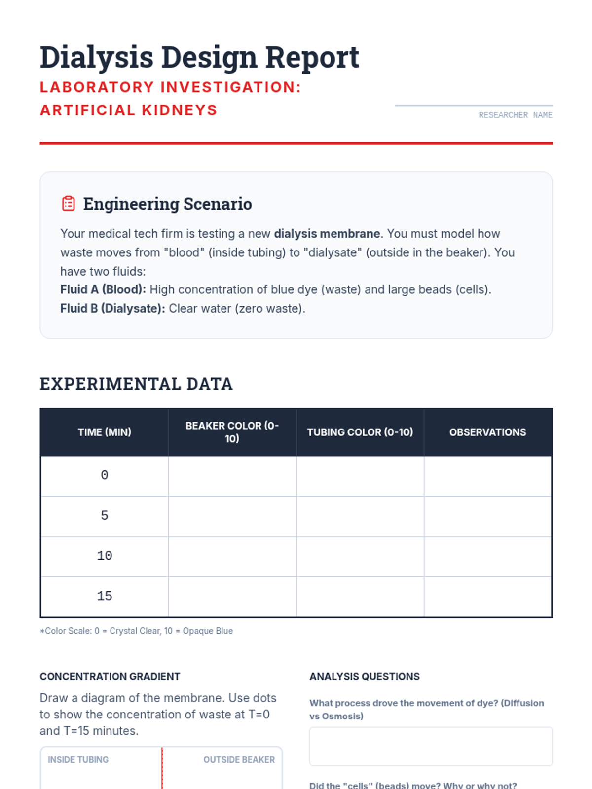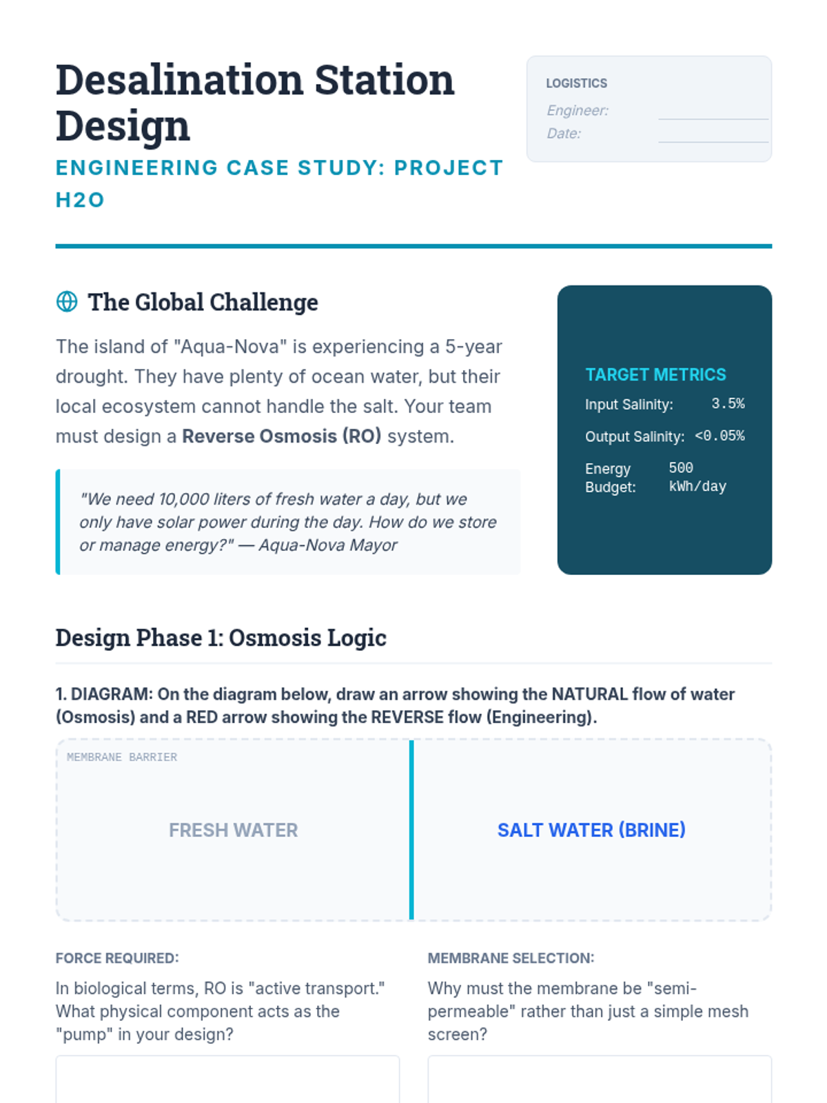 An engineering-focused biology sequence where 7th-grade students apply cellular transport principles (osmosis, diffusion, active transport) to design artificial filtration and delivery systems, culminating in a bio-inspired engineering pitch.