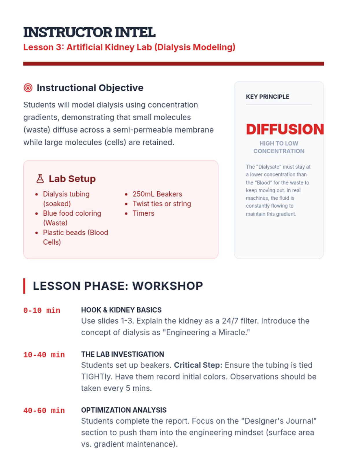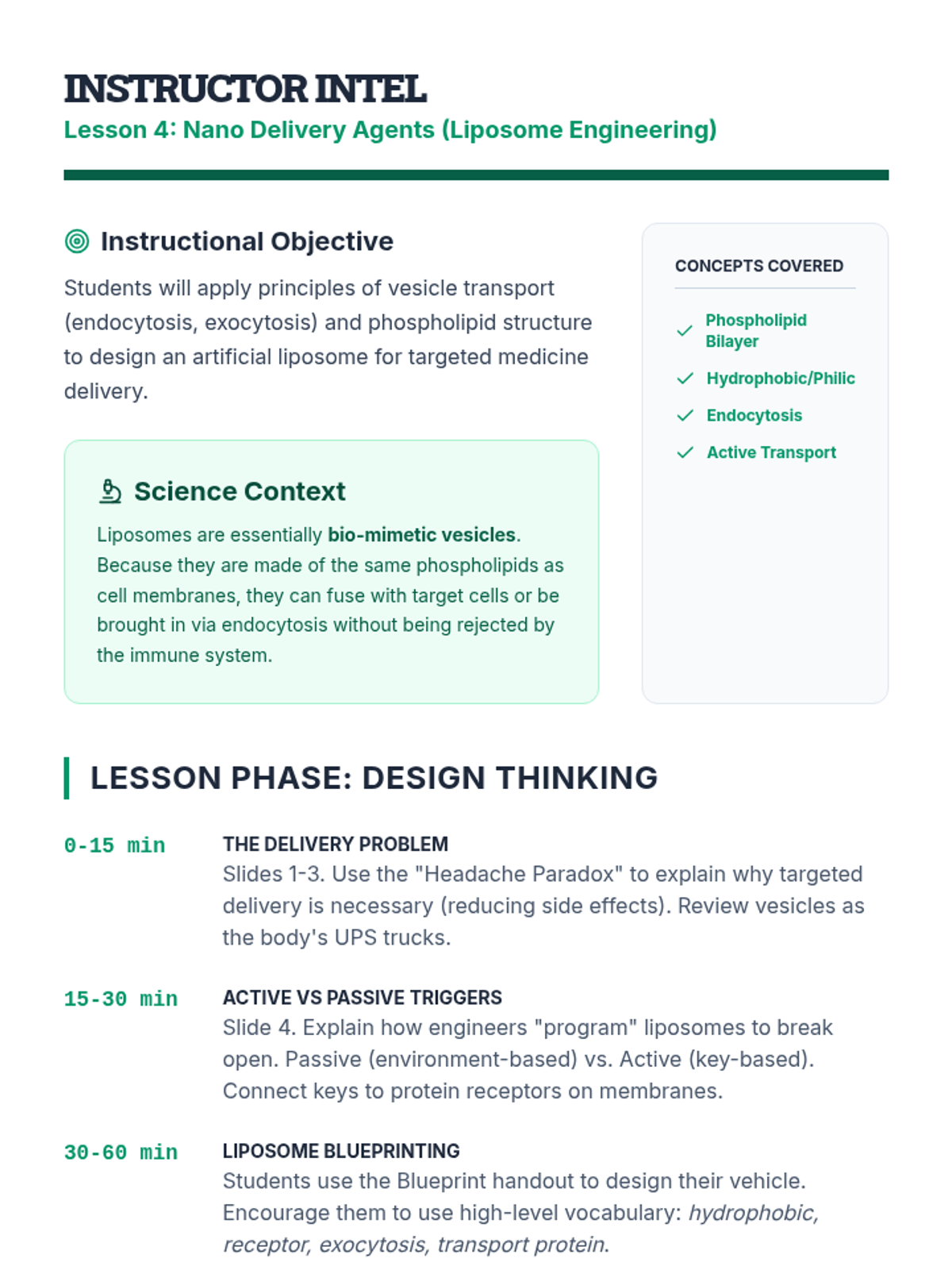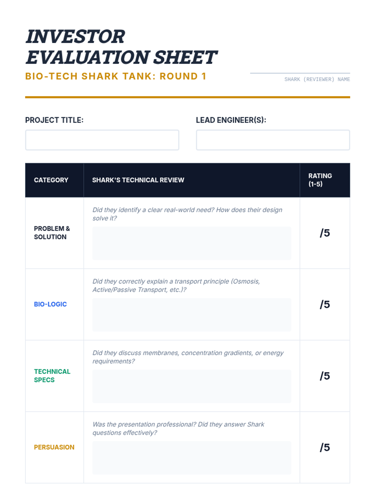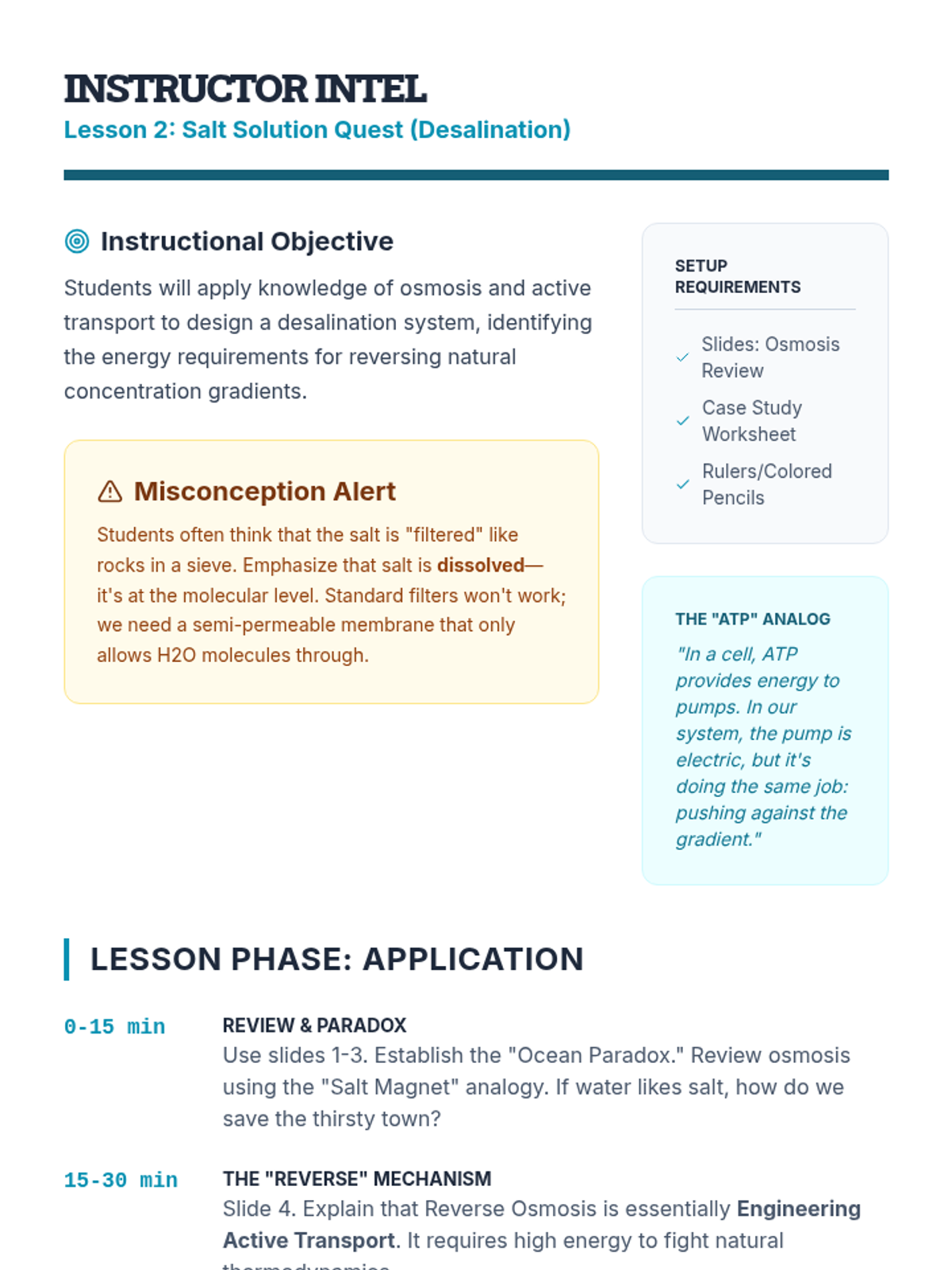 An engineering-focused biology sequence where 7th-grade students apply cellular transport principles (osmosis, diffusion, active transport) to design artificial filtration and delivery systems, culminating in a bio-inspired engineering pitch.