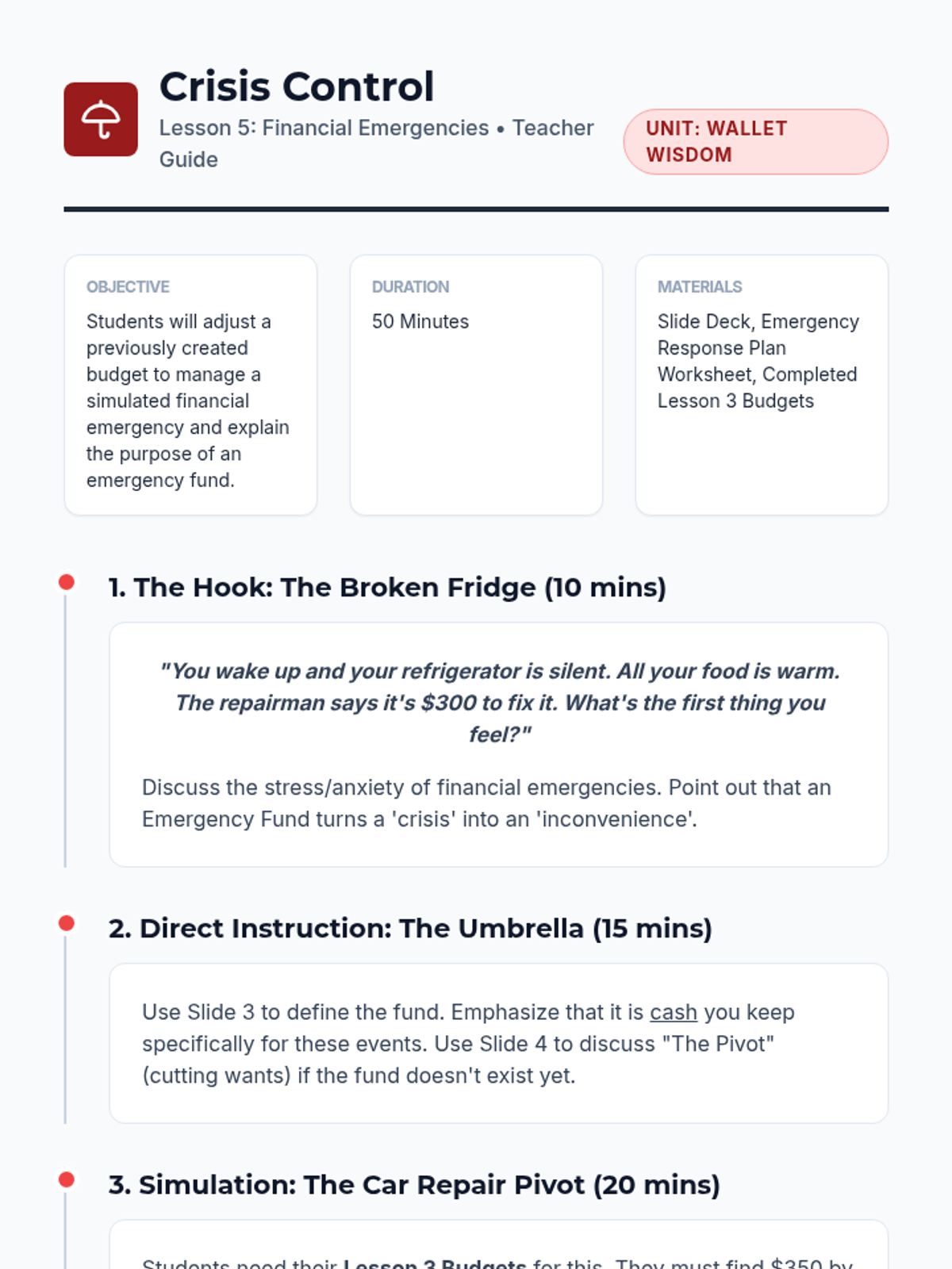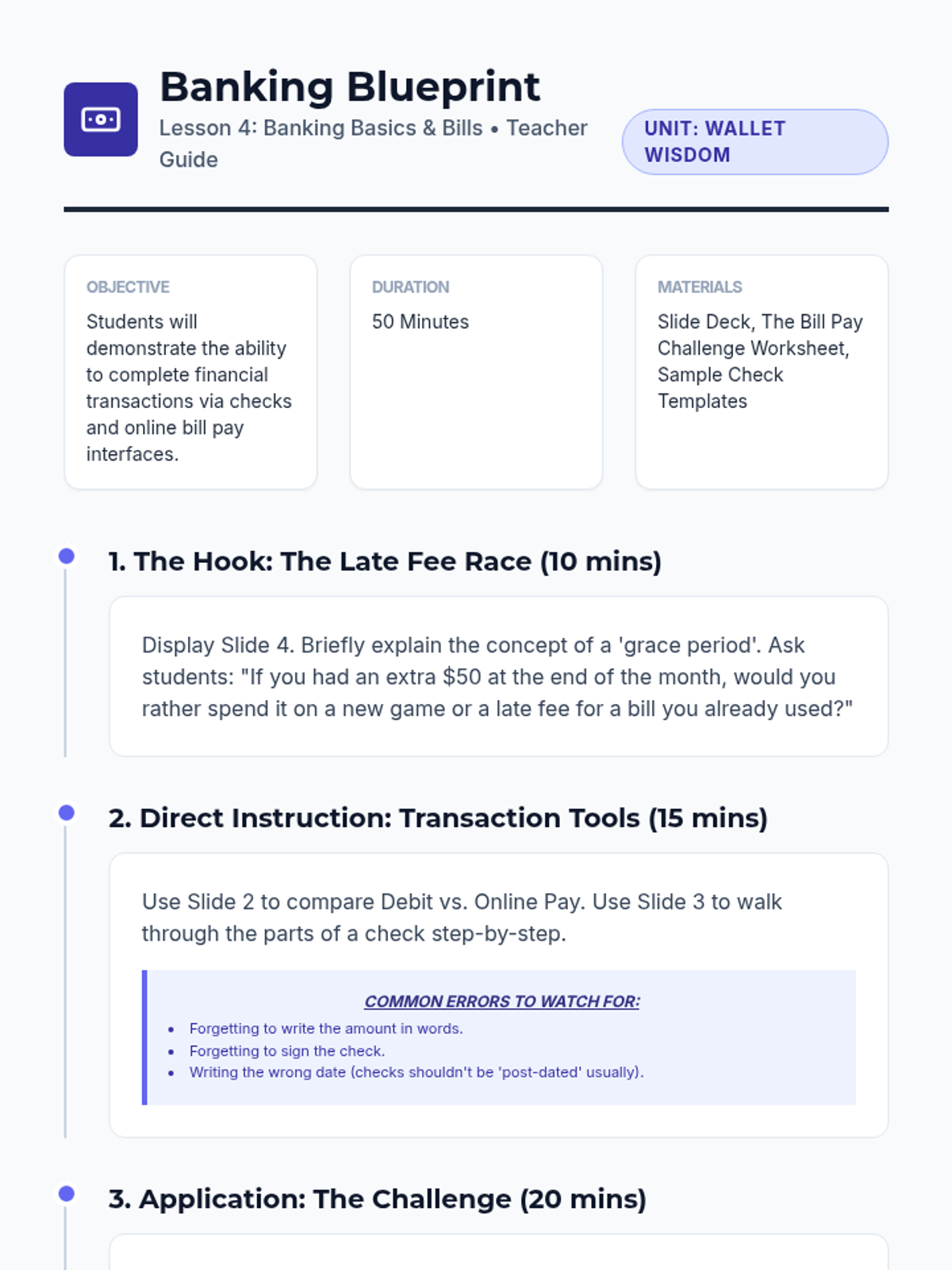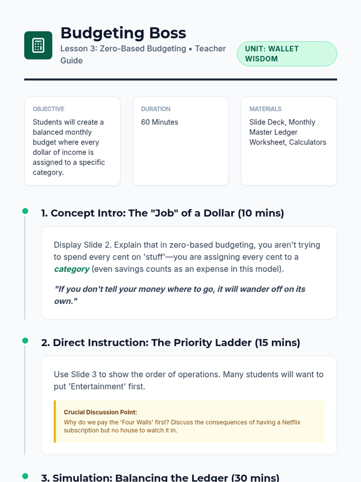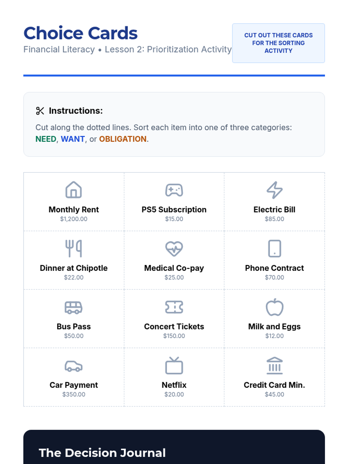 A comprehensive 5-lesson unit designed for 10th-grade students in transition planning. This sequence covers the fundamentals of financial independence, including income analysis, budgeting, banking, and emergency planning through a simulated 'real world' month of living.