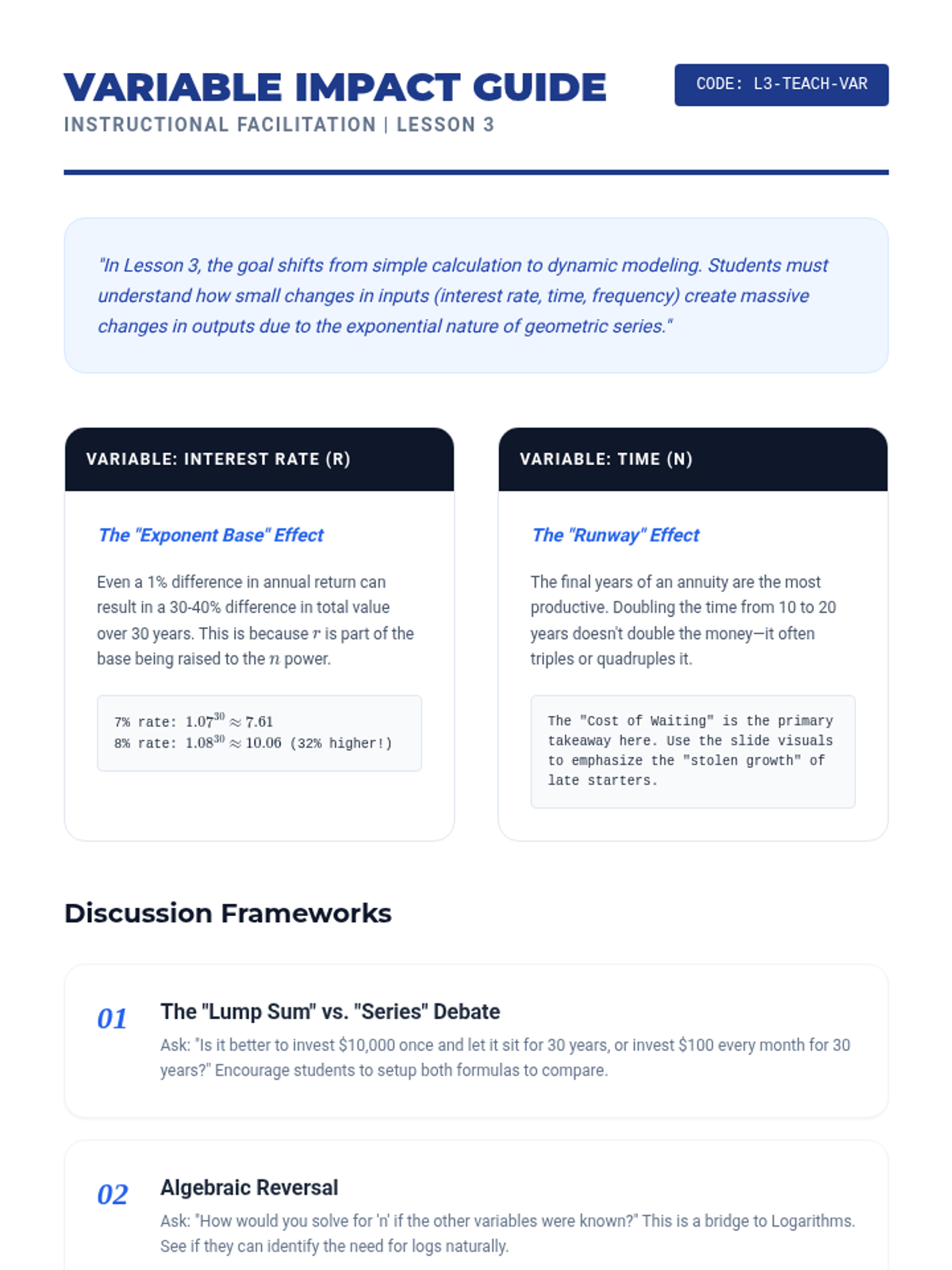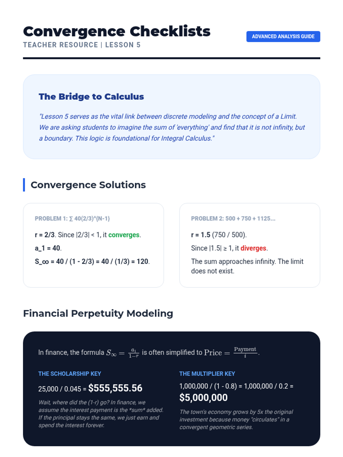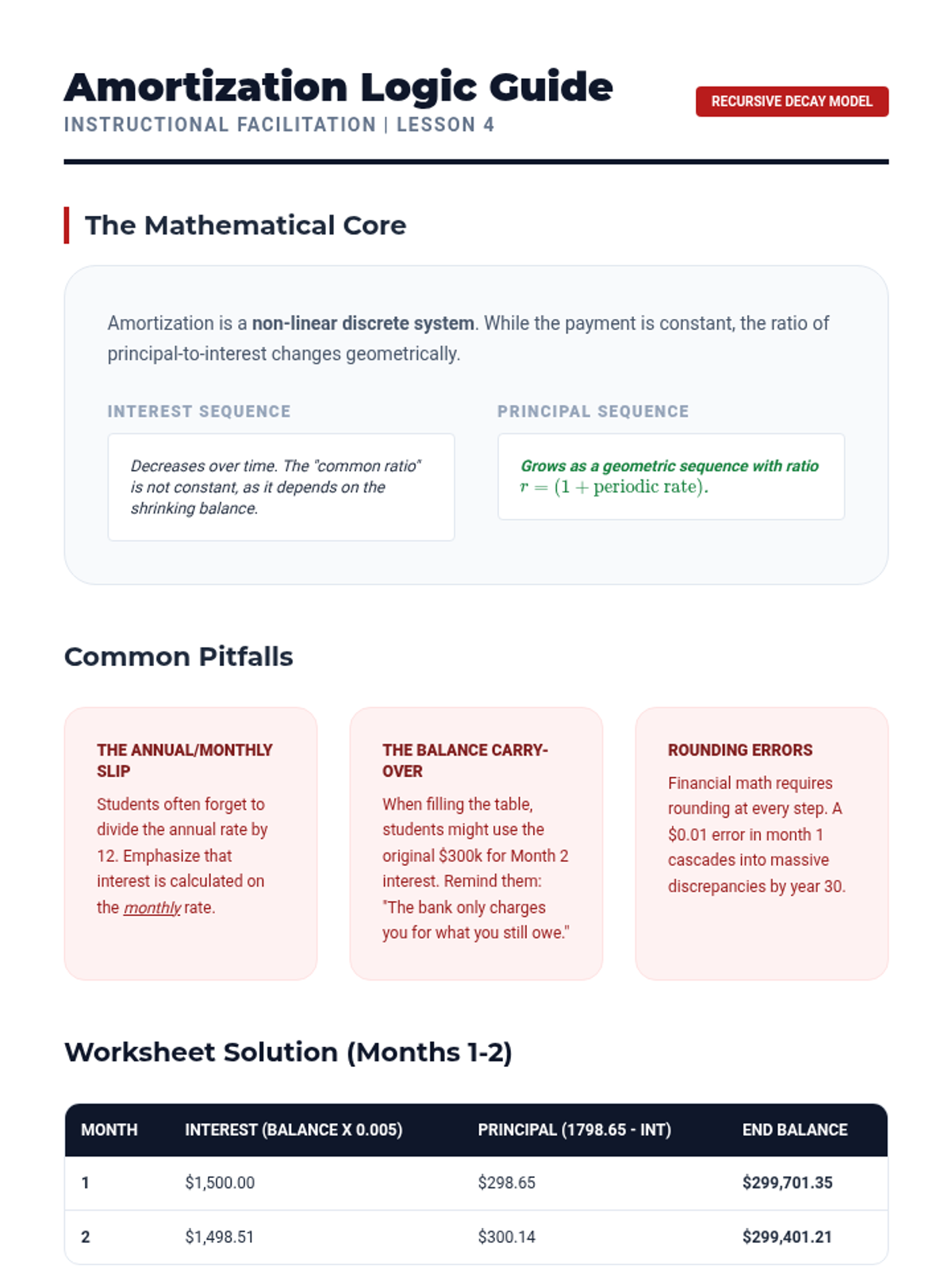 Students bridge algebraic functions and discrete mathematics by modeling financial scenarios like simple and compound interest, annuities, and loan amortization using arithmetic and geometric sequences.