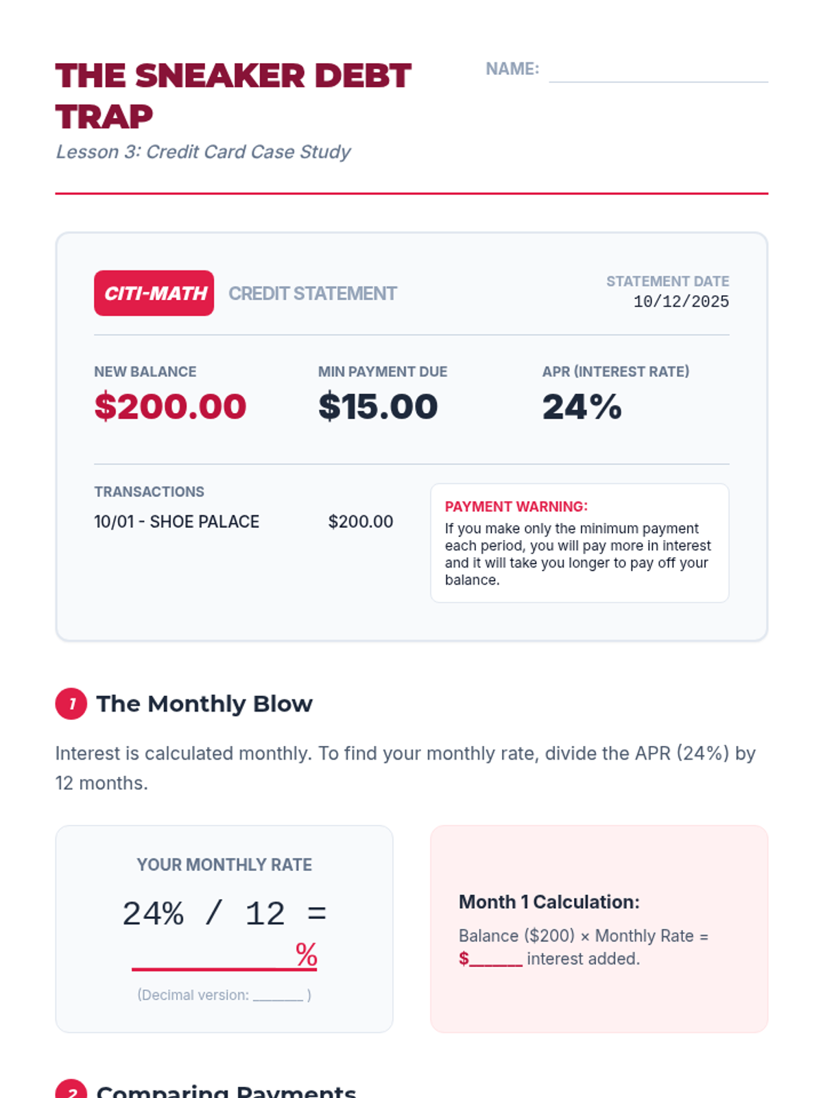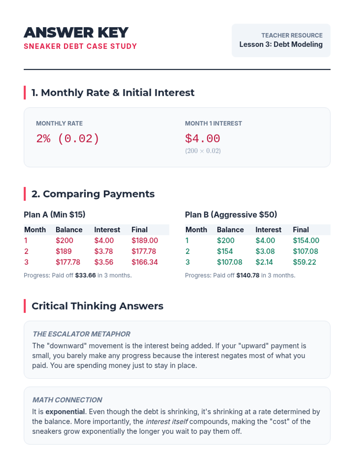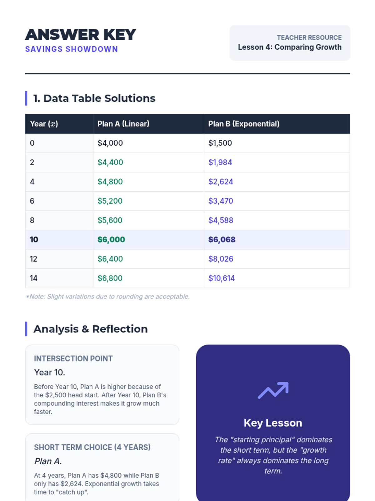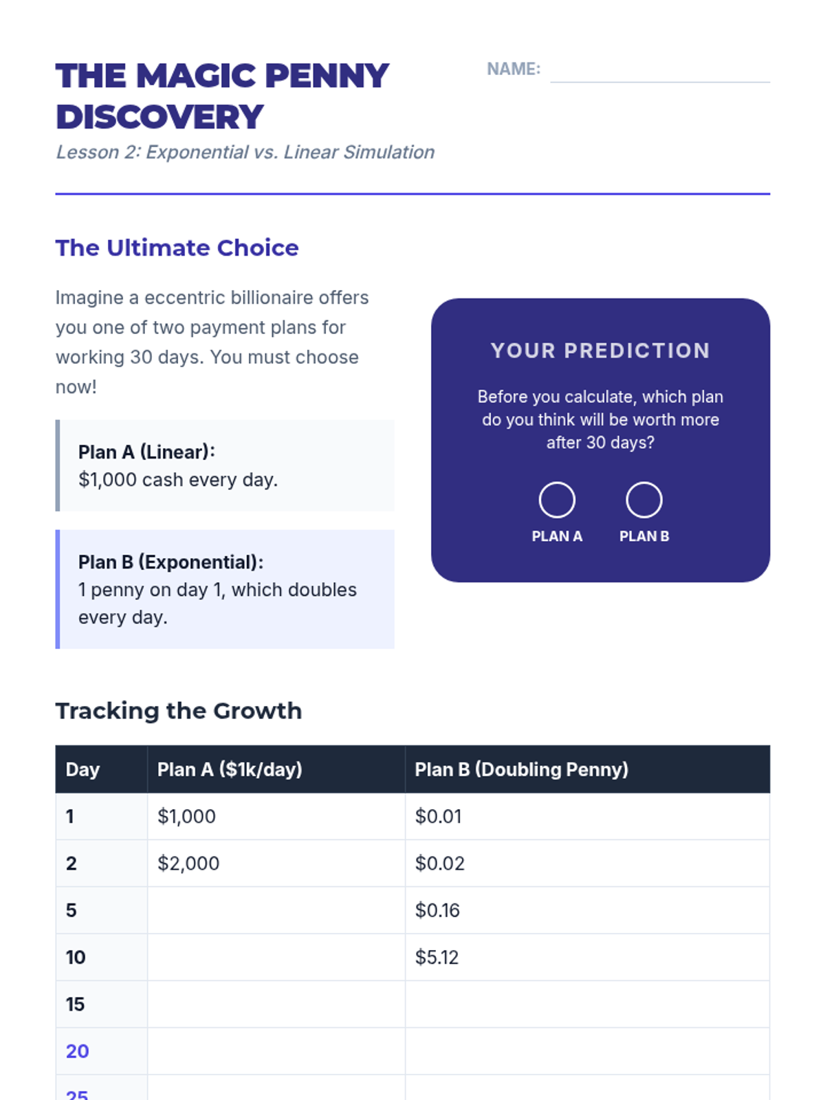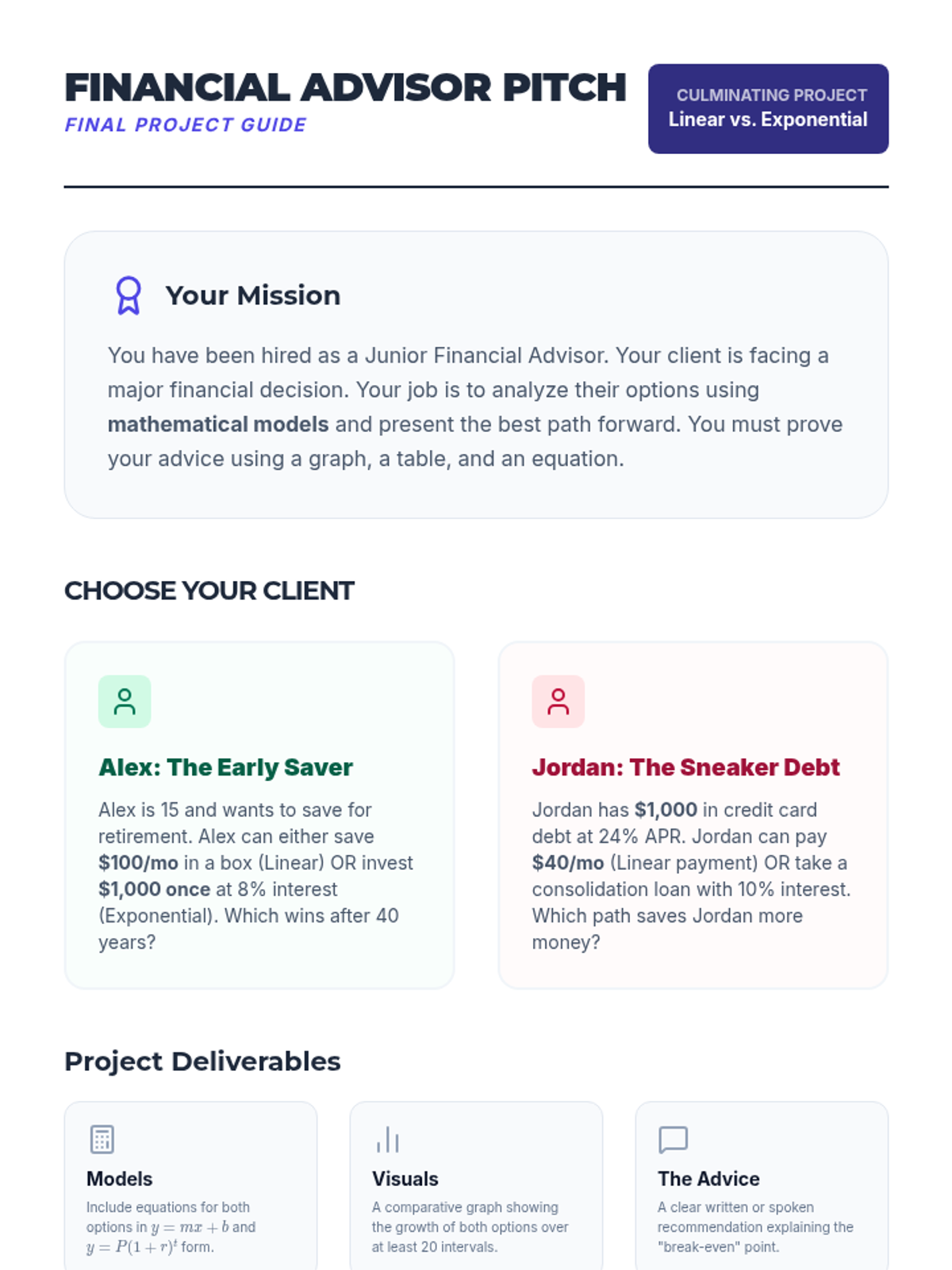 Students explore linear and exponential growth through personal finance, comparing simple and compound interest to make informed decisions about saving and debt.