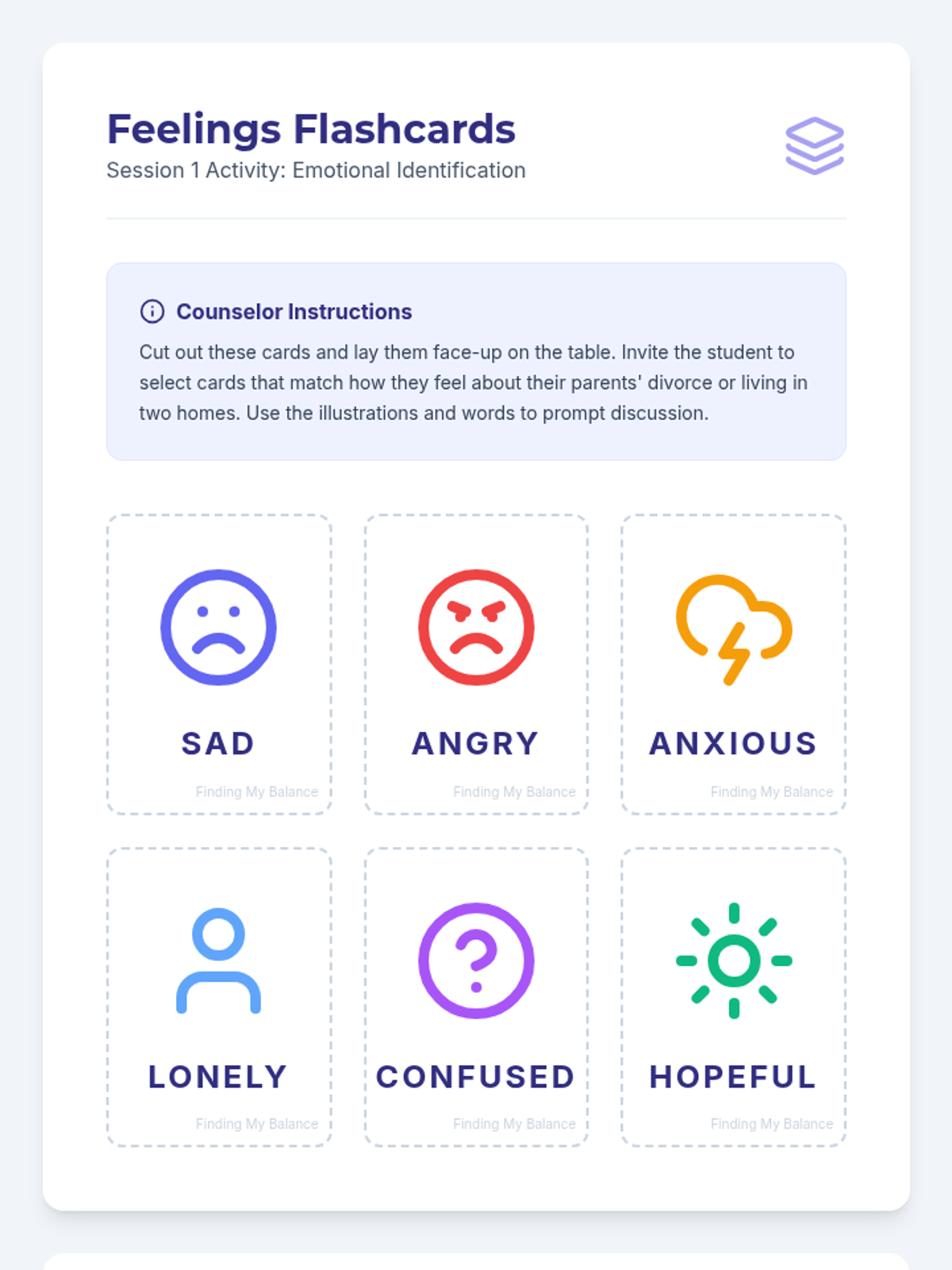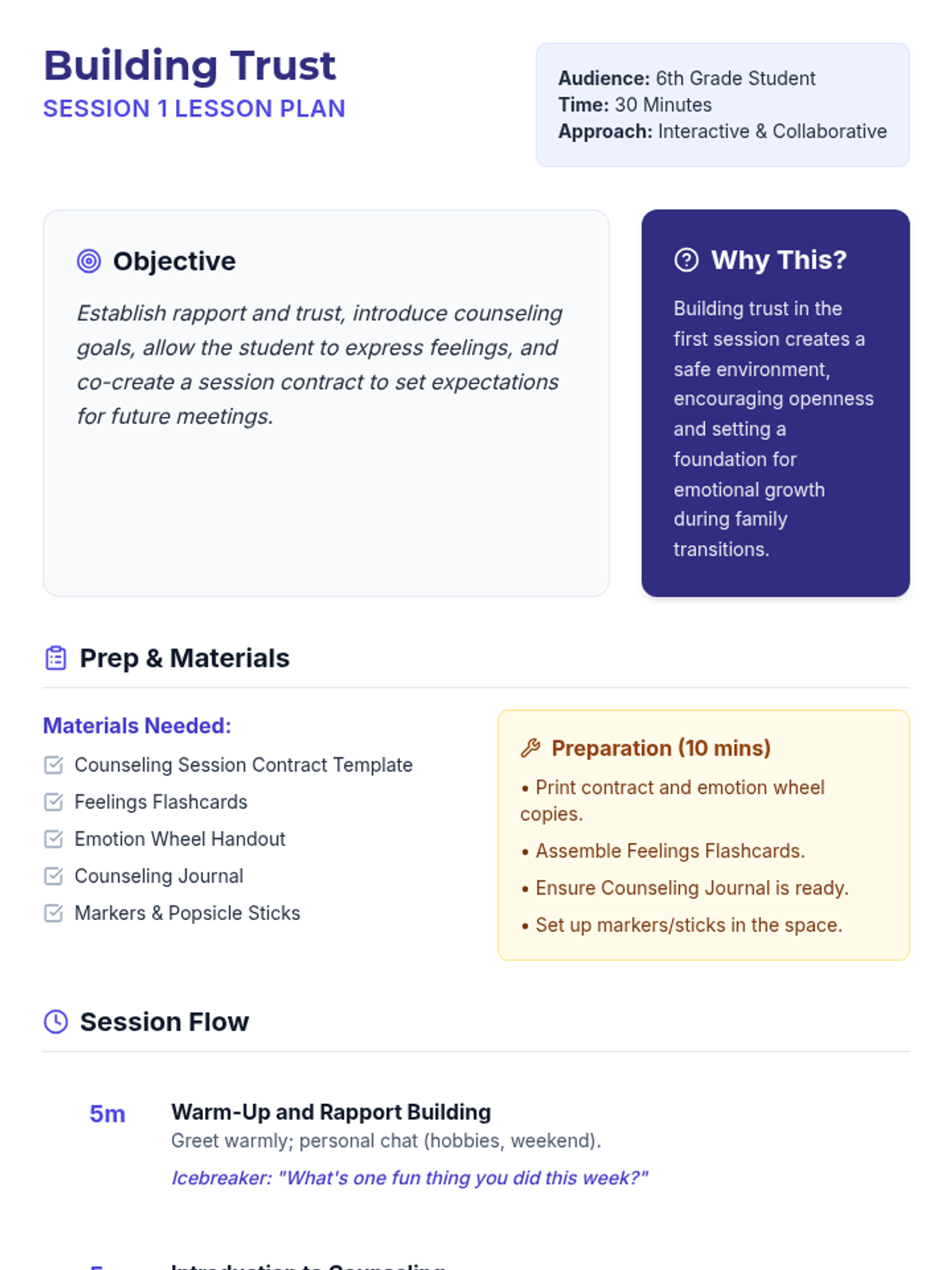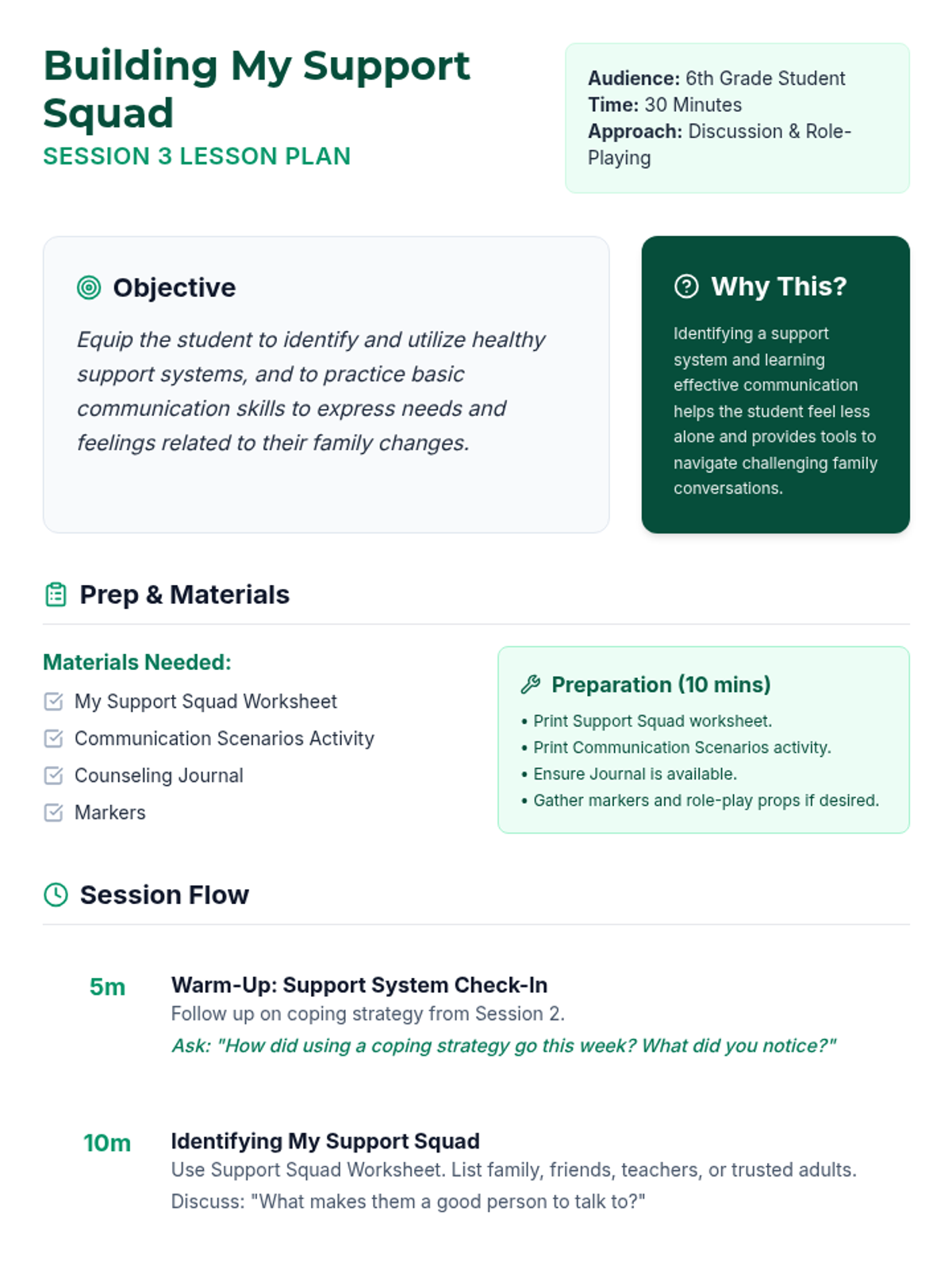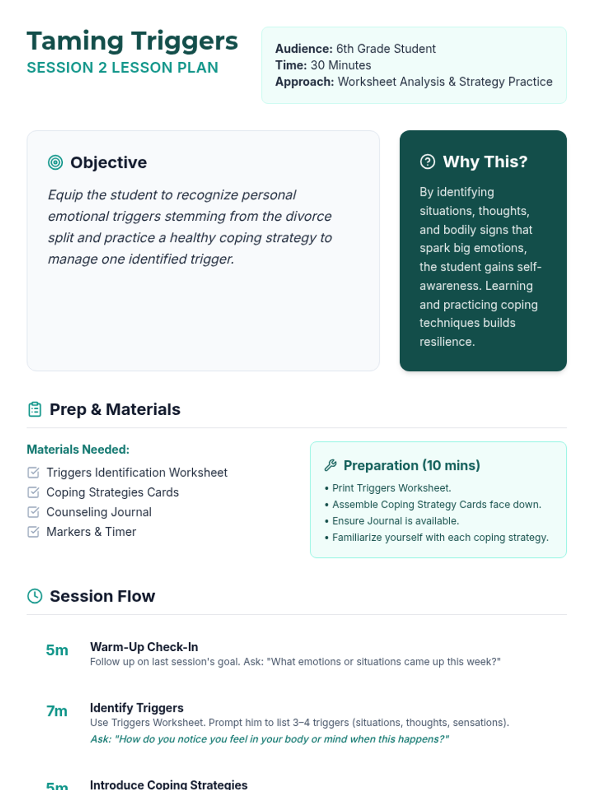 An 8-session individual counseling series for a 6th-grade boy navigating his parents' divorce and split household. These sessions build trust, teach emotional regulation, coping strategies, and resilience, empowering the student to express feelings and develop healthy support systems.
