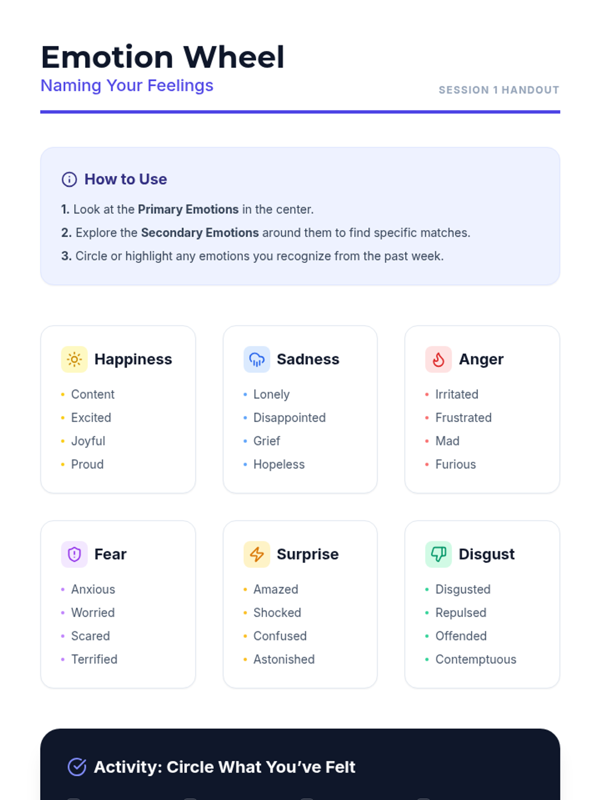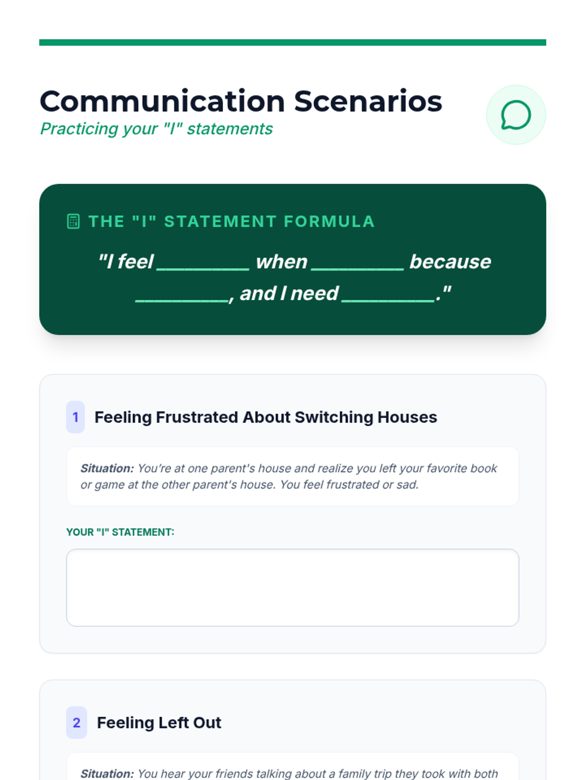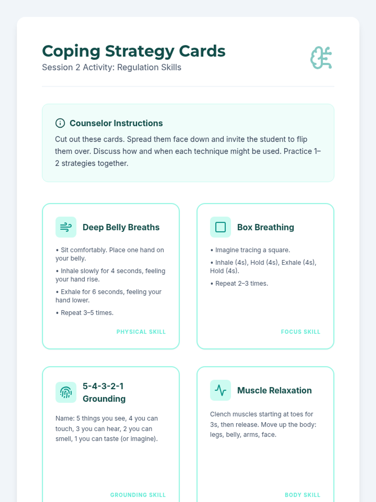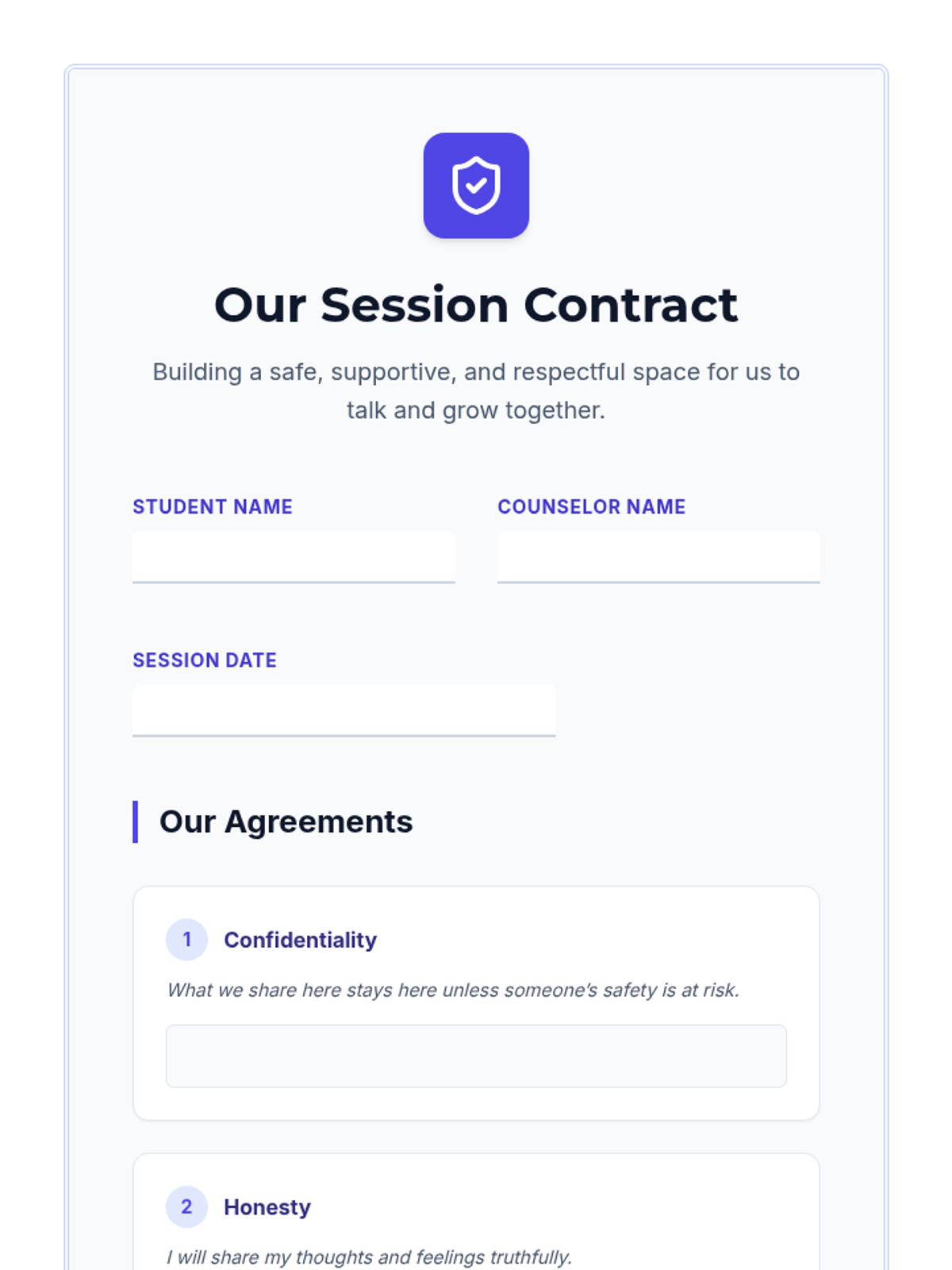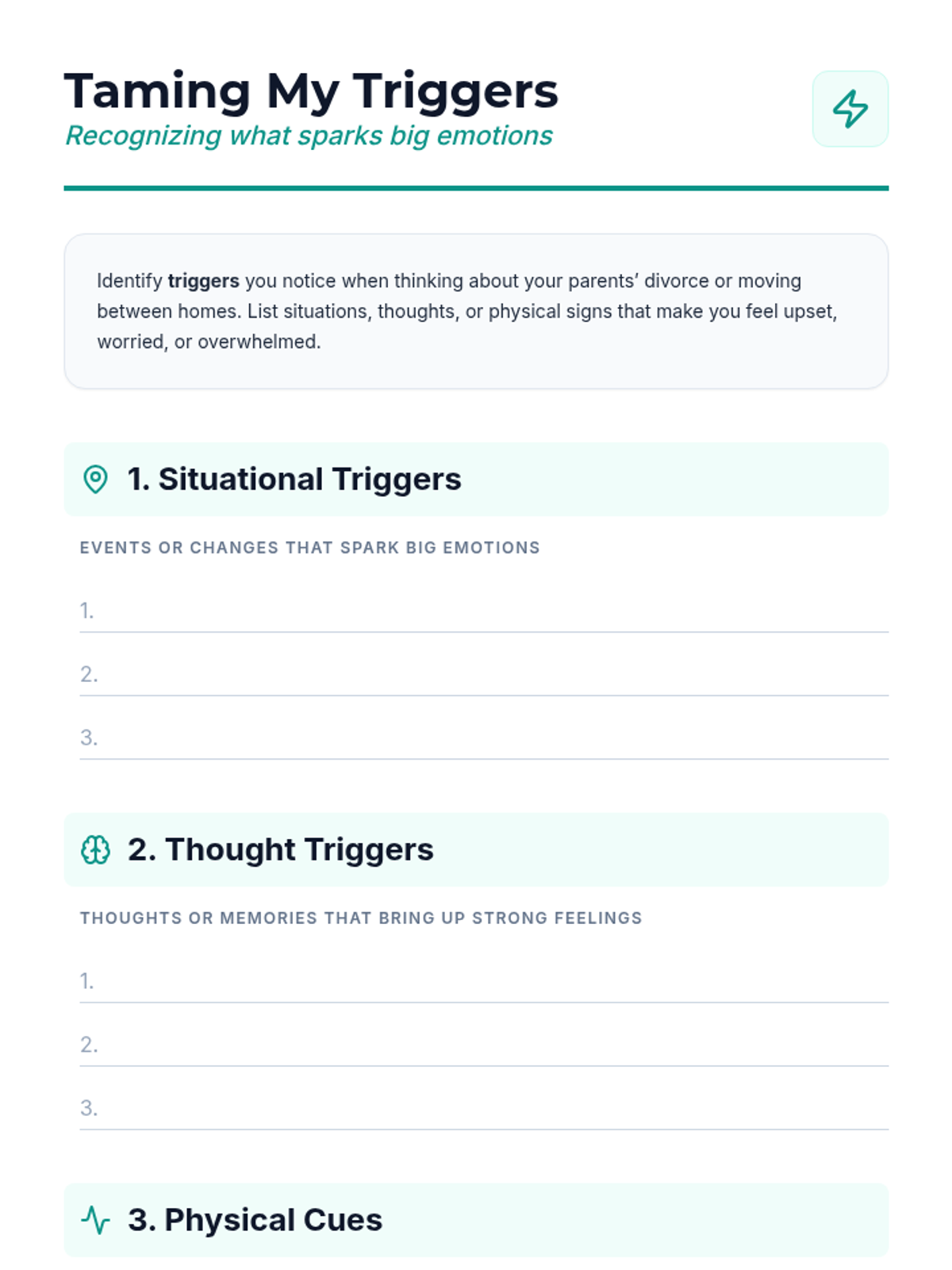 An 8-session individual counseling series for a 6th-grade boy navigating his parents' divorce and split household. These sessions build trust, teach emotional regulation, coping strategies, and resilience, empowering the student to express feelings and develop healthy support systems.