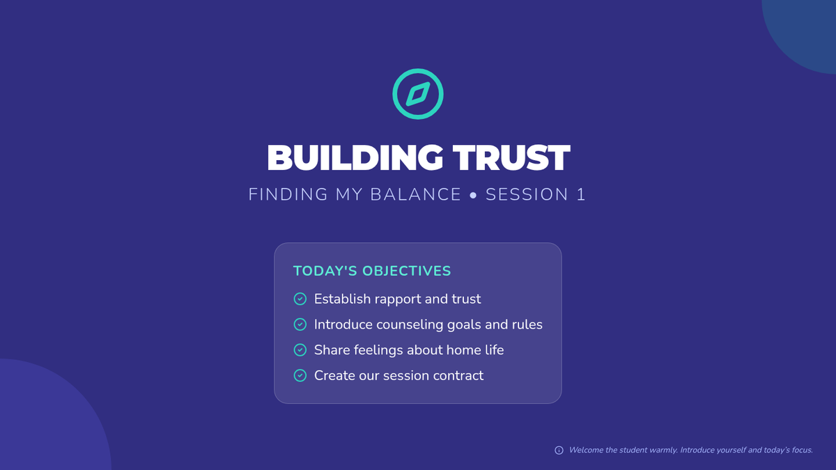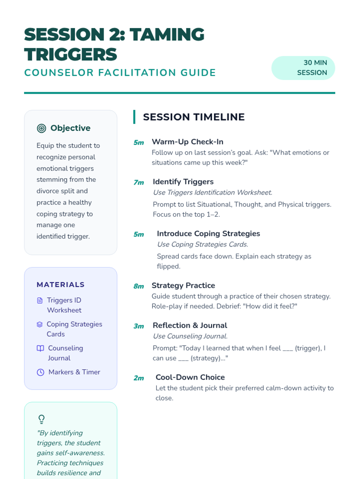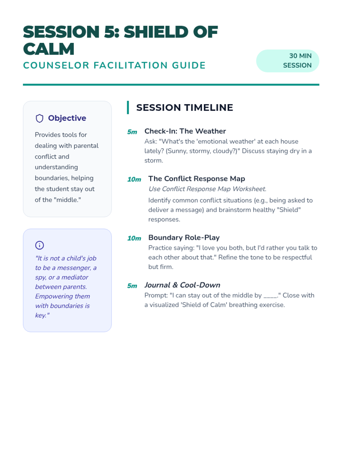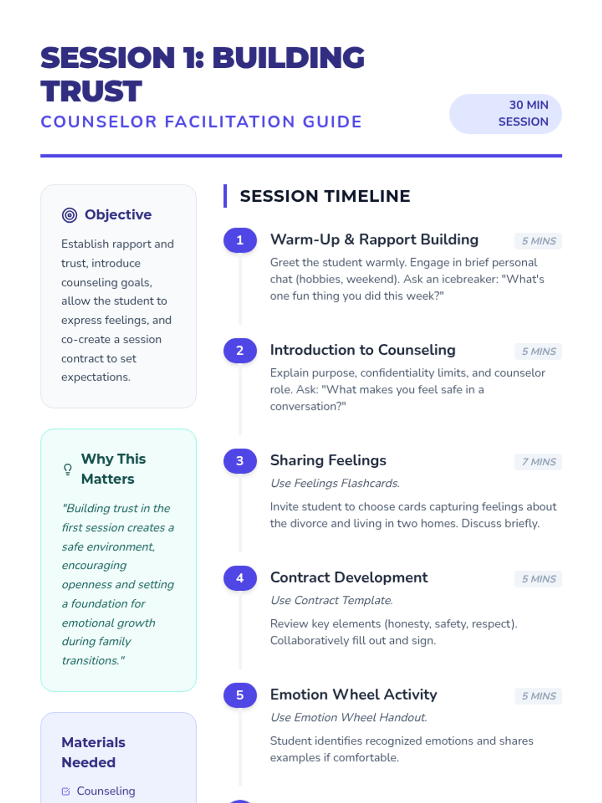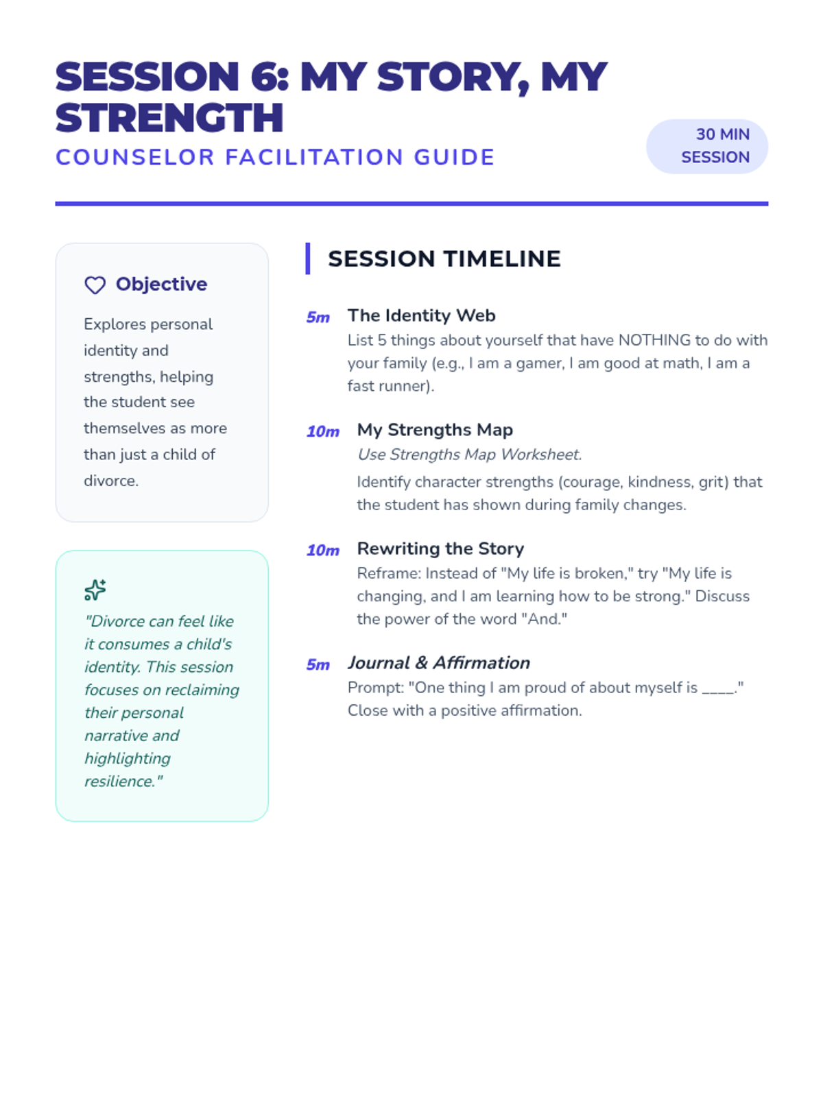 An 8-session individual counseling series for a 6th-grade student navigating their parents' divorce. This sequence focuses on building trust, emotional regulation, coping strategies, communication skills, and resilience across two households.